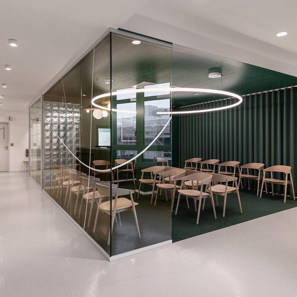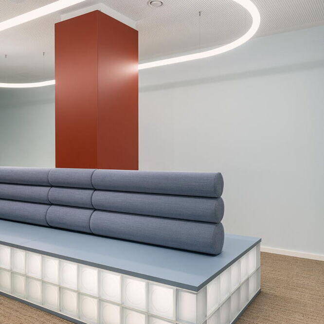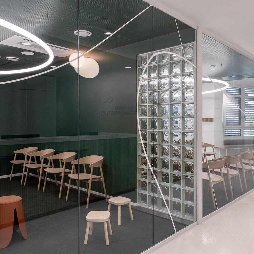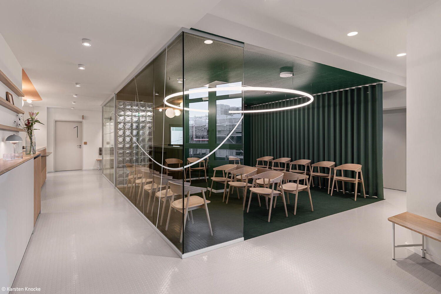 Ziel war es, eine Atmosphäre zu schaffen, die sowohl beruhigend als auch klar strukturiert ist, um Patient:innen eine hohe Aufenthaltsqualität zu bieten. Die Raumstruktur und das unaufdringliche Design gewährleisten eine ansprechende und nutzungsorientierte Umgebung, die ganz klar den Menschen in den Mittelpunkt stellt. In Anlehnung an den Fachbereich und im Einklang mit dem Markenauftritt der Praxis bildet eine runde Formgebung das gestalterische Leitmotiv für alle Räumlichkeiten. Der Grundriss folgt einer zirkulären Raumstruktur, bei der der Empfangs- und die Wartebereiche als verbindende Elemente im Zentrum und die Behandlungs- und weitere Funktionsräume in einem äußeren Zirkel liegen. Diese Anordnung schafft eine harmonische Balance zwischen Offenheit im Empfangsbereich und angemessener Privatsphäre in den Behandlungszonen. Ein fein ausbalanciertes Farbkonzept, ergänzt durch ein unaufdringlich integriertes Wegeleitsystem vom Designer David Steingrüber, gibt Orientierung und vermittelt über seine klaren Strukturen Ruhe im hektischen Praxisalltag. Die nummerierten Behandlungsräume sind grafisch ansprechend gestaltet, wobei Folierungen und grafische Elemente die Bildmarke der Praxis aufgreifen. Die Sichtbeziehungen, die zwischen den verschiedenen Praxiszonen entstehen, schaffen architektonische Tiefe und attraktive Durchblicke, die den Raum ästhetisch bereichern und eine hohe Aufenthaltsqualität für die Patient:innen bieten.