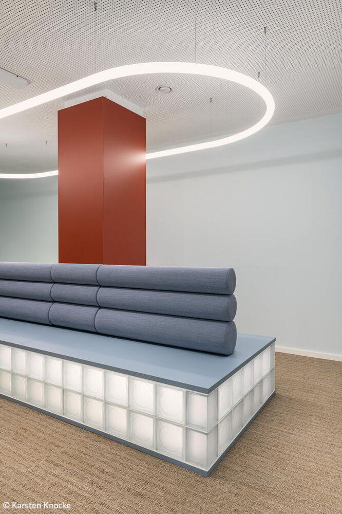 Ziel war es, eine Atmosphäre zu schaffen, die sowohl beruhigend als auch klar strukturiert ist, um Patient:innen eine hohe Aufenthaltsqualität zu bieten. Die Raumstruktur und das unaufdringliche Design gewährleisten eine ansprechende und nutzungsorientierte Umgebung, die ganz klar den Menschen in den Mittelpunkt stellt. In Anlehnung an den Fachbereich und im Einklang mit dem Markenauftritt der Praxis bildet eine runde Formgebung das gestalterische Leitmotiv für alle Räumlichkeiten. Der Grundriss folgt einer zirkulären Raumstruktur, bei der der Empfangs- und die Wartebereiche als verbindende Elemente im Zentrum und die Behandlungs- und weitere Funktionsräume in einem äußeren Zirkel liegen. Diese Anordnung schafft eine harmonische Balance zwischen Offenheit im Empfangsbereich und angemessener Privatsphäre in den Behandlungszonen. Ein fein ausbalanciertes Farbkonzept, ergänzt durch ein unaufdringlich integriertes Wegeleitsystem vom Designer David Steingrüber, gibt Orientierung und vermittelt über seine klaren Strukturen Ruhe im hektischen Praxisalltag. Die nummerierten Behandlungsräume sind grafisch ansprechend gestaltet, wobei Folierungen und grafische Elemente die Bildmarke der Praxis aufgreifen. Die Sichtbeziehungen, die zwischen den verschiedenen Praxiszonen entstehen, schaffen architektonische Tiefe und attraktive Durchblicke, die den Raum ästhetisch bereichern und eine hohe Aufenthaltsqualität für die Patient:innen bieten.