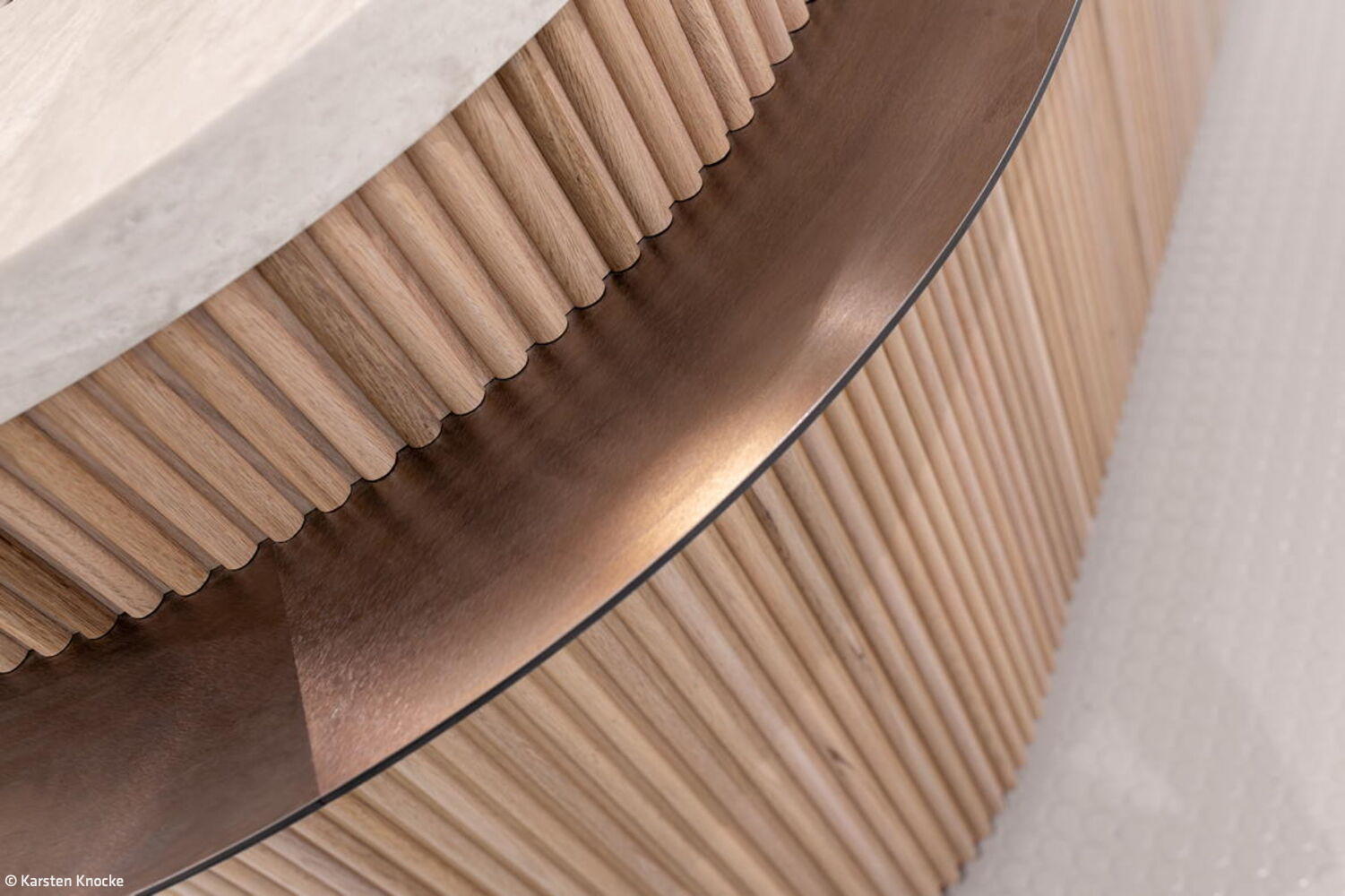 Die Materialauswahl folgt einem bewussten Kontrast: Warme, natürliche Materialien wie Eichenholz stehen im Spannungsverhältnis zu funktionalen Oberflächen wie dem Kautschukboden, der eine kühle Note einbringt. Dieses Zusammenspiel sorgt für ein harmonisches Gesamtbild und unterstützt gleichzeitig die zielgerichtete Gestaltung der Räume unter Berücksichtigung der medizinischen Anforderungen. Das Ergebnis sind Räume mit Tiefe und wertigen Materialien. Das unaufdringliche Design schafft eine ansprechende und nutzungsorientierte Praxisumgebung, die den Menschen in den Mittelpunkt stellt.