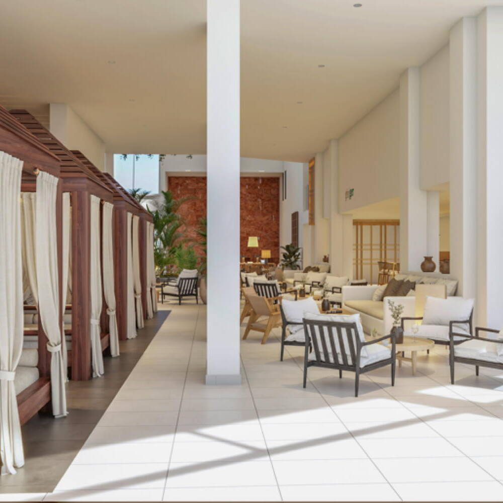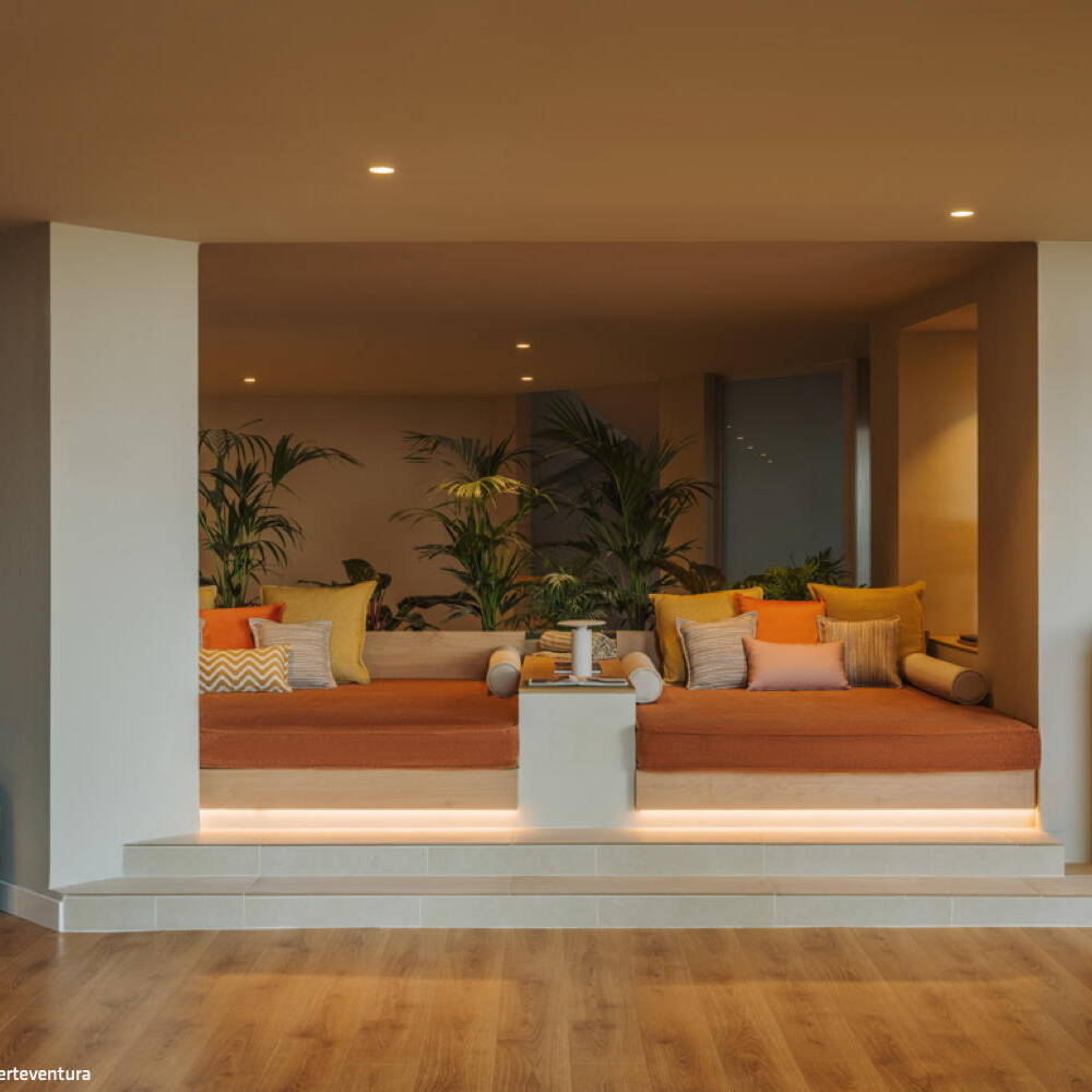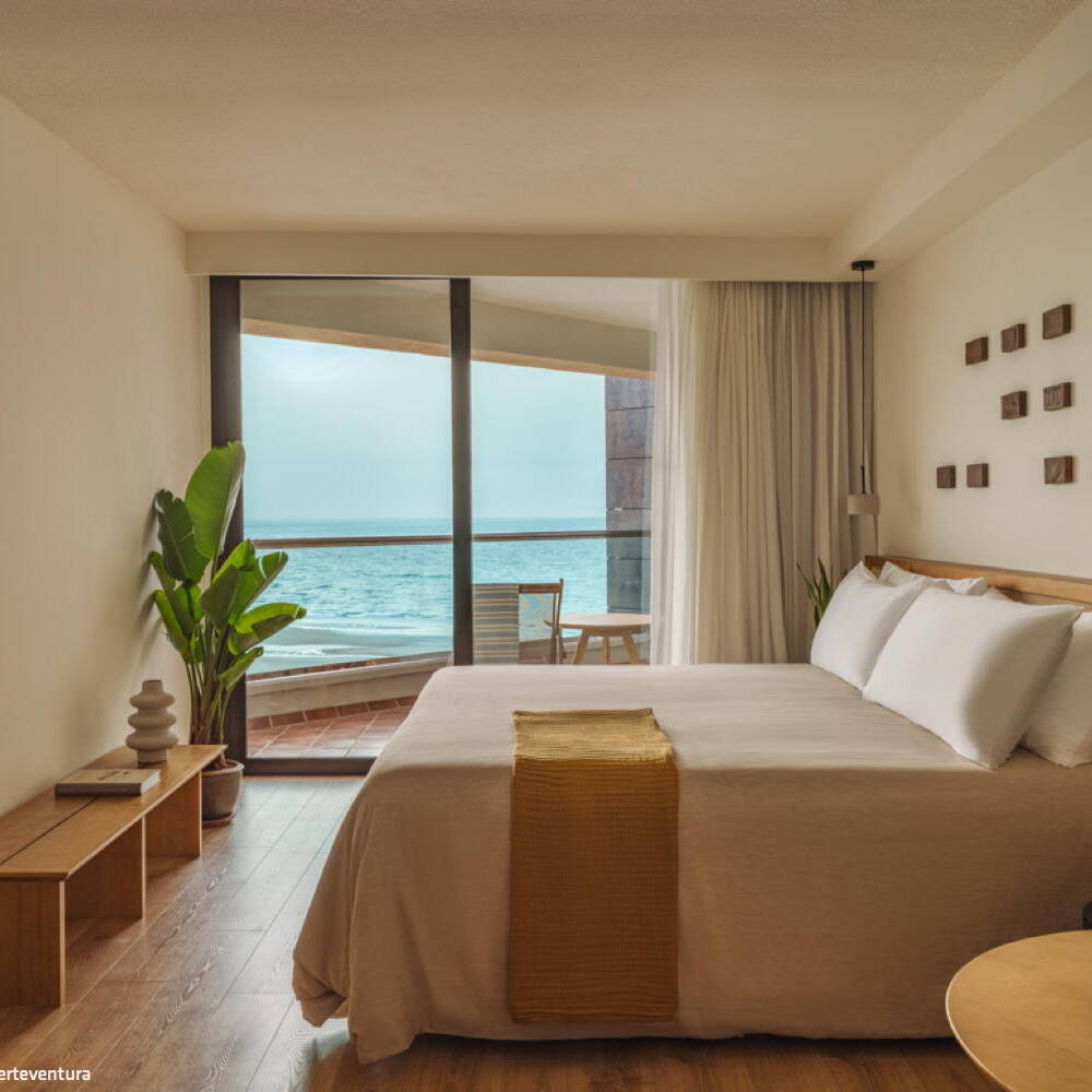 Das Interior Design stammt von ASAH – Álvaro Sans Arquitectura Hotelera und wurde in Zusammenarbeit mit den Studios dot.arch und HAD-Arquitectos entwickelt. Es ist tief verwurzelt in der Natur und Kultur Fuerteventuras: Die vulkanische Landschaft, erdige Farbtöne, traditionelle Bauweisen und lokales Kunsthandwerk bilden die gestalterische Grundlage. Ziel war es, die umgebende Landschaft nicht nur zu zitieren, sondern als integralen Bestandteil der Raumgestaltung erlebbar zu machen. Natürliche Materialien wie Holz, Stein, Keramik, Leinen und Pflanzenfasern prägen das ruhige, zugleich raffinierte Ambiente des All-inclusive-Hotels – ein gestalterischer roter Faden, der sich vom exklusiven Private Club „The Reserve“ über die zahlreichen Themen-Restaurants bis hin zu den großzügigen Zimmern und Suiten fortsetzt. Die Farbpalette orientiert sich an der Insel: Sand-, Stein- und Lavanuancen spiegeln das archaische Terrain wider, während Akzente in Türkis und Terrakotta Anklänge an Meer und Sonne setzen. Reduzierte Formen und fein abgestimmte Texturen schaffen eine Atmosphäre von Harmonie und entspannter Eleganz. Die Zimmer und Suiten wurden bewusst zurückhaltend gestaltet – eine reduzierte Linienführung, helle Designermöbel, ein großes Bett mit weißen Bettbezügen und hellen Tagesdecken schaffen ein helles, ruhiges und authentisches Ambiente – und setzen so die einzigartige Dünenlandschaft rundherum in Szene.