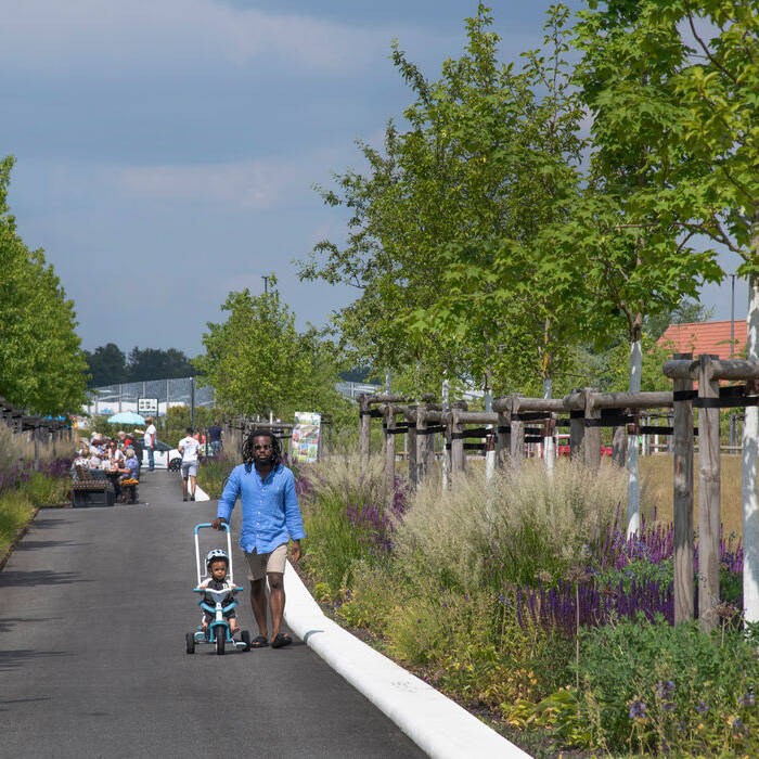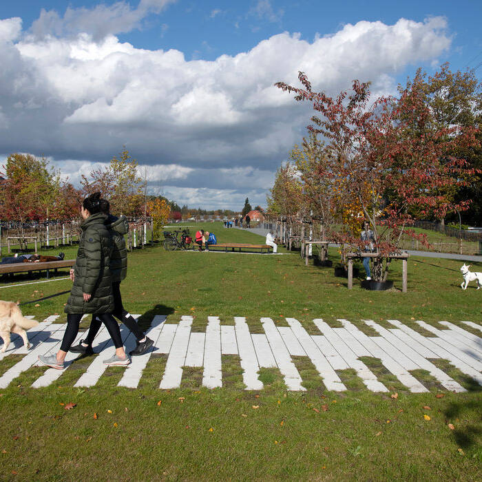 Edouard Manets Gemälde „Le déjeuner sur l‘herbe“ diente Pola Landschaftsarchitekten als Inspiration für den neuen Park auf dem A7-Tunnel in Schnelsen. Wo sich einst Blechlawinen unter freiem Himmel dahin schoben, gedeiht heute – oberhalb von Verkehrslärm und einer sechsspurigen Autobahn – eine vegetative Artenvielfalt, treffen sich die Anwohnenden zum Picknick, spielen Nachbarskinder ungefährdet Fußball und bauen Kleingärtner Obst und Gemüse an. Eine drei Hektar große Dachbegrünung auf dem sogenannten Schnelsener Deckel ließ Manets malerische Illusion vom Frühstück im Grünen gebaute Realität werden.