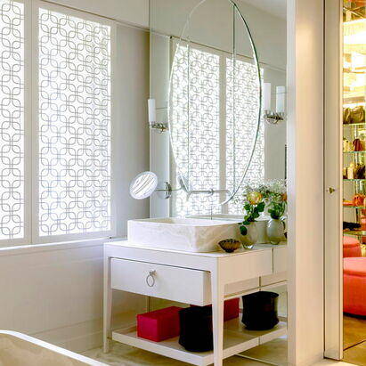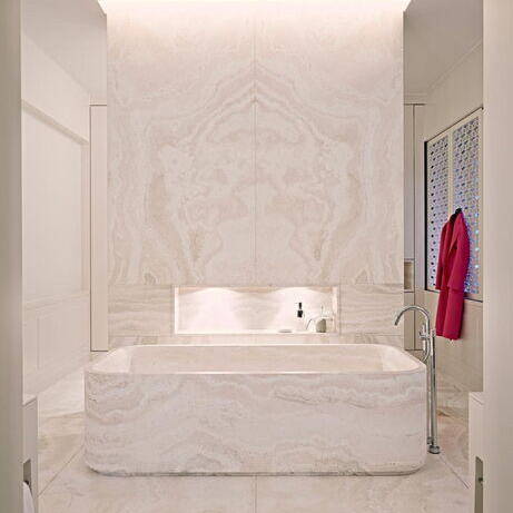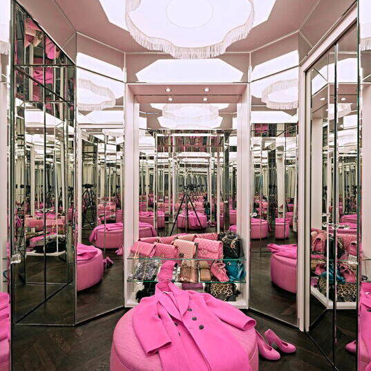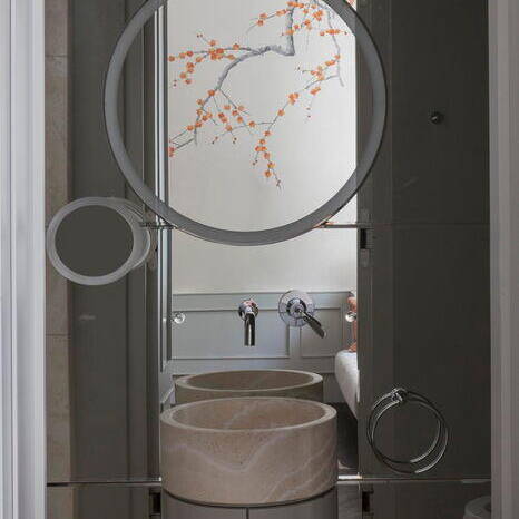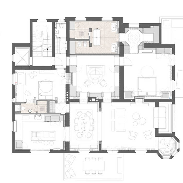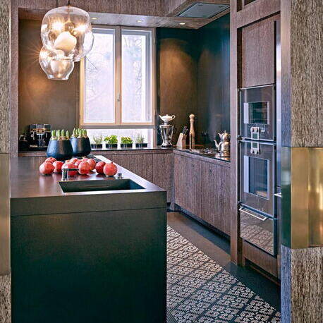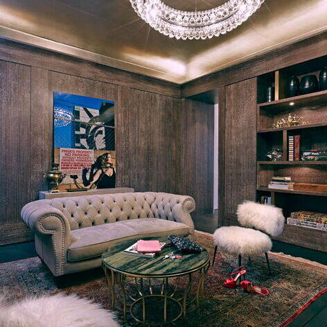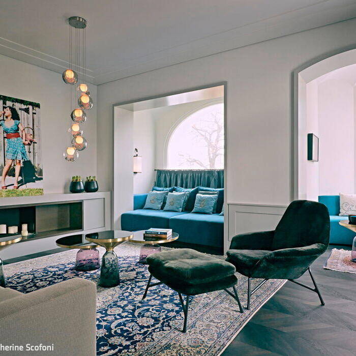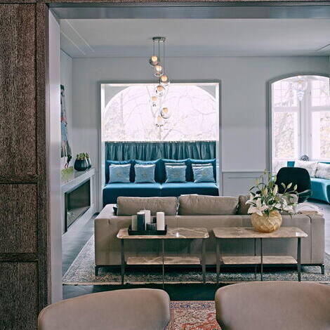 Bis vor Kurzem residierte hier eine ehemalige Touristik-Unternehmerin. In dieser Phase wurde aus dem Gebäude eine Luxusvilla nach dem Geschmack ihrer aus Persien stammenden Besitzerin. Als die neue Bauherrin das Anwesen erwarb, glich die einstige Prachtvilla zuletzt einer Ruine. Das Dach war nur noch teilweise vorhanden und Vögel nisteten im Inneren. Sie liess sich davon nicht abschrecken und fand Mitstreiter, die maßgeblich an der Errettung des Hauses beteiligt waren: In Holger Hansen fand sie einen Architekten, der genügend visionäres Vorstellungsvermögen mitbrachte, um dieses Trümmerfeld wieder in ein Wohn- und Bürogebäude zu verwandeln. Zusammen mit dem Interior Designer Karim El-Barbari, der für die Beschaffung diverser Objekte und Ausstattungselemente zuständig war, schafften sie gemeinsam, die orientalisch-exotischen Wünsche der Auftraggeberin in Räume zu übersetzen. Für die Wohn- und Geschäftsräume stehen nun 1.000 m² zur Verfügung. Das 1. Obergeschoss – die Beletage – wurde komplett entkernt, um die Wohnräume zu reorganisieren und neu zu gestalten. Des Weiteren kamen ein Indoor-Pool, ein Film- und ein Fitnessraum im Untergeschoss hinzu. Von zentraler Bedeutung war die wertvolle Sammlung von signierten Perserteppichen, um die herum die Möbel arrangiert wurden. An Seide, Samt, Leder, Marmor, Lüstern, Spiegeln und intensiven Farben wurde nicht gespart. Vor allem einem intensiven Pink – der Lieblingsfarbe der Hausherrin – kam eine dominante Rolle zu, was der Liegenschaft eine zeitlang den Namen „Villa Pink“ einbrachte. Der Stil der Einrichtung war inspiriert vom französischen Art Déco und der Wiener Akademie um 1930.