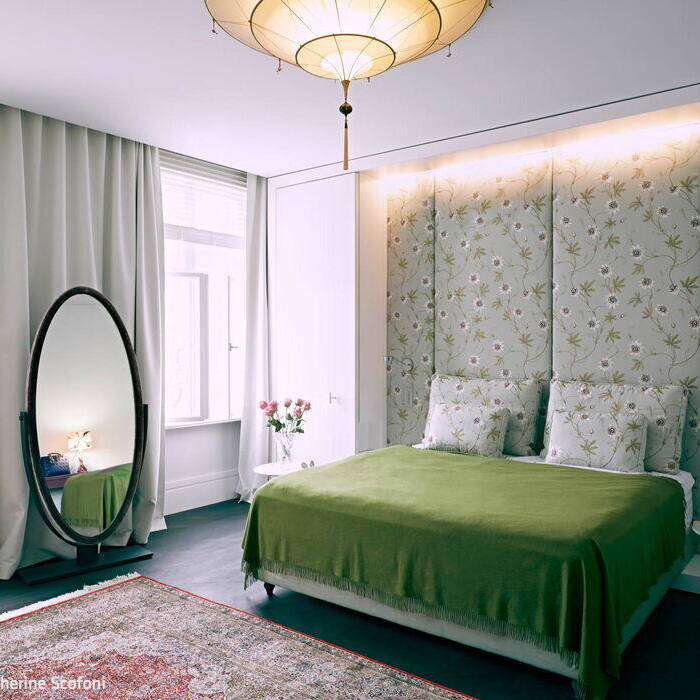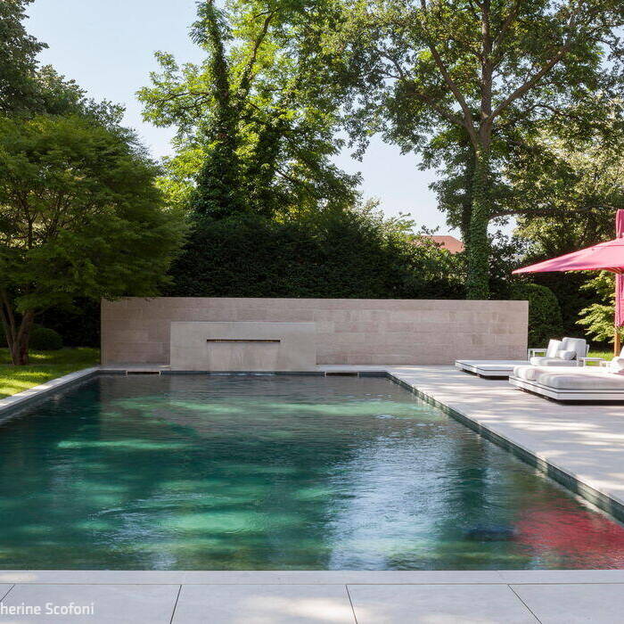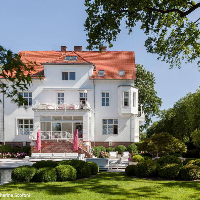 Obwohl das Grundstück an einer viel befahrenen Straße liegt, vergisst man die pulsierende Metropole angesicht der beeindruckenden wilhelminischen Villa, sobald man das Gartentor hinter sich gelassen hat. Der parkartige Garten ist in verschiedene Zonen unterteilt, um unterschiedliche Aufenthaltsvarianten zu bieten – einem großem Pool inklusive. Gleich daneben steht ein gläserner Pavillon, der als Event-Location gemietet werden kann.
