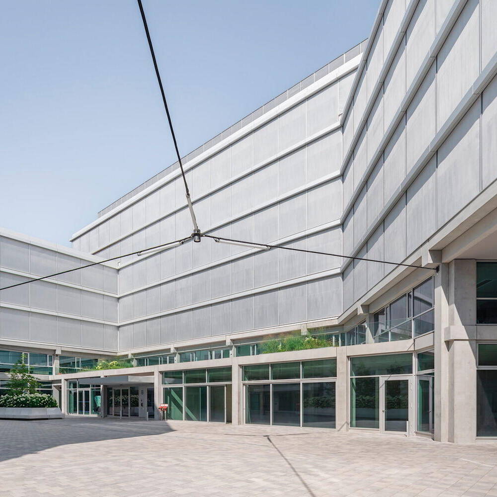 Vom Haupteingang an der Gerichtsstraße im Wedding aus ist kaum zu ermessen, wie groß dieses Bürogebäude tatsächlich ist. Fünf Baukörper mäandern in den Hof hinein und umschließen insgesamt drei Innenhöfe. Per Direktauftrag entwarfen die Berliner Architekten Welter + Welter dieses riesige Gebäude mit einer Geschossfläche von knapp 20.000 m² und 16.000 m² Nutzfläche, das von den Bauherren „New Courts“ genannt wurde. Obwohl zeitgleich im näheren Umfeld diverse Neubauten entstanden, fiel den „New Courts“ eine große Bedeutung in der Neudefini-tion der inneren Blockstruktur und der Raumkanten zu Straße, Nachbarn und dem angrenzenden Stadtpark zu.