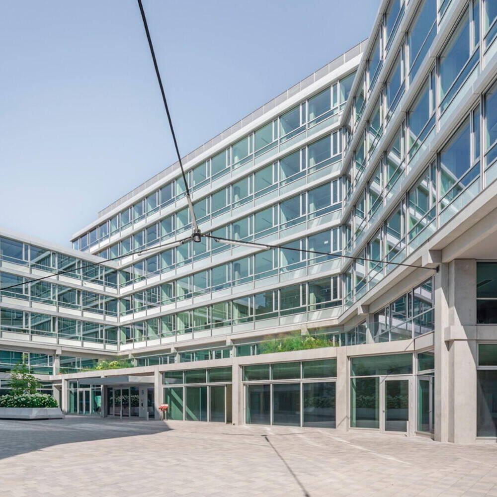 Das Grundstück mit einer Größe von 6.100 m² gehörte früher als Parkplatz zur benachbarten Post. Als ein Bedarf in dieser Größe nicht mehr – beziehungsweise nur noch eingeschränkt – nötig war, wurde die Fläche als Baugrund nutzbar. Die schräg und im rechten Winkel zueinander angeordneten fünf unterschiedlich hohen Baukörper lockern das Ensemble optisch auf. Eine durchgehende, filigrane Vollglasfassade lässt die enorme Baumasse elegant und leicht erscheinen. Eine doppelgeschossige Sockelzone bildet sozusagen das Fundament des Komplexes. Schlanke Sichtbetonpfeiler und -balken, denen man nicht zutraut, dass sie ein solches Volumen tragen können, bilden eine tischartige Basis, auf der die Büros ruhen. Hier sind Lobbys, Veranstaltungsräume und ein Pressezentrum untergebracht, in den darüberliegenden Geschossen befinden sich die Büroräume auf 3, 4 oder 5 Ebenen. Die einzelnen Bauteile reagieren in Höhe und Tiefe auf den jeweiligen Kontext. Die Innenhöfe bieten Aufenthaltsqualität für die Mitarbeitenden.