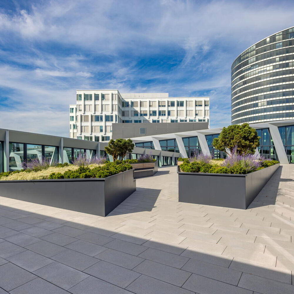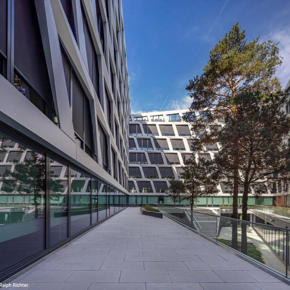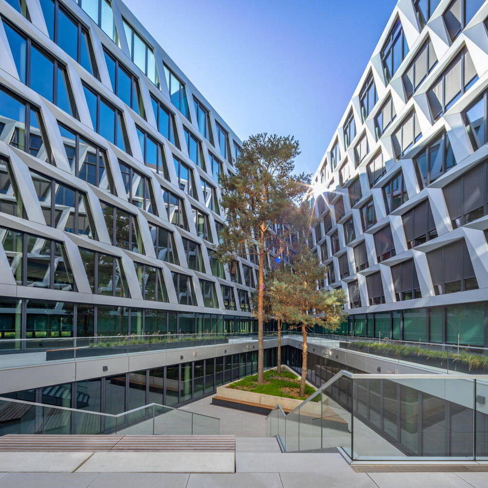 Der Innenhof fungiert als interner Treffpunkt und grüne Mitte. In Verbindung mit den Dachgärten wird so die ökologische Qualität des Hauses gestärkt und ein Bezug zu den Freiräumen der Umgebung hergestellt. Die Freiraumplanung folgt dem Leitbild „Forest Home“: 25 Meter hohe Waldkiefern sowie rund 50 weitere Bäume bilden eine urbane Oase, die die Aufenthaltsqualität in der Stadt erhöht, indem sie die Luftqualität verbessert, das Mikroklima reguliert sowie Wärme- und Lärmbelastung reduziert und dadurch Komfort und Wohlbefinden steigert. Ergänzend erfüllt das Gebäude zahlreiche weitere Kriterien eines Green Building: Neben Elektro-Ladestationen und überdurchschnittlich vielen Fahrradstellplätzen bietet es einen reduzierten Wasserverbrauch und eine energetisch optimierte Haustechnik sowie maximalen Tageslichteintrag mit präsenzgesteuerter Sensortechnik.