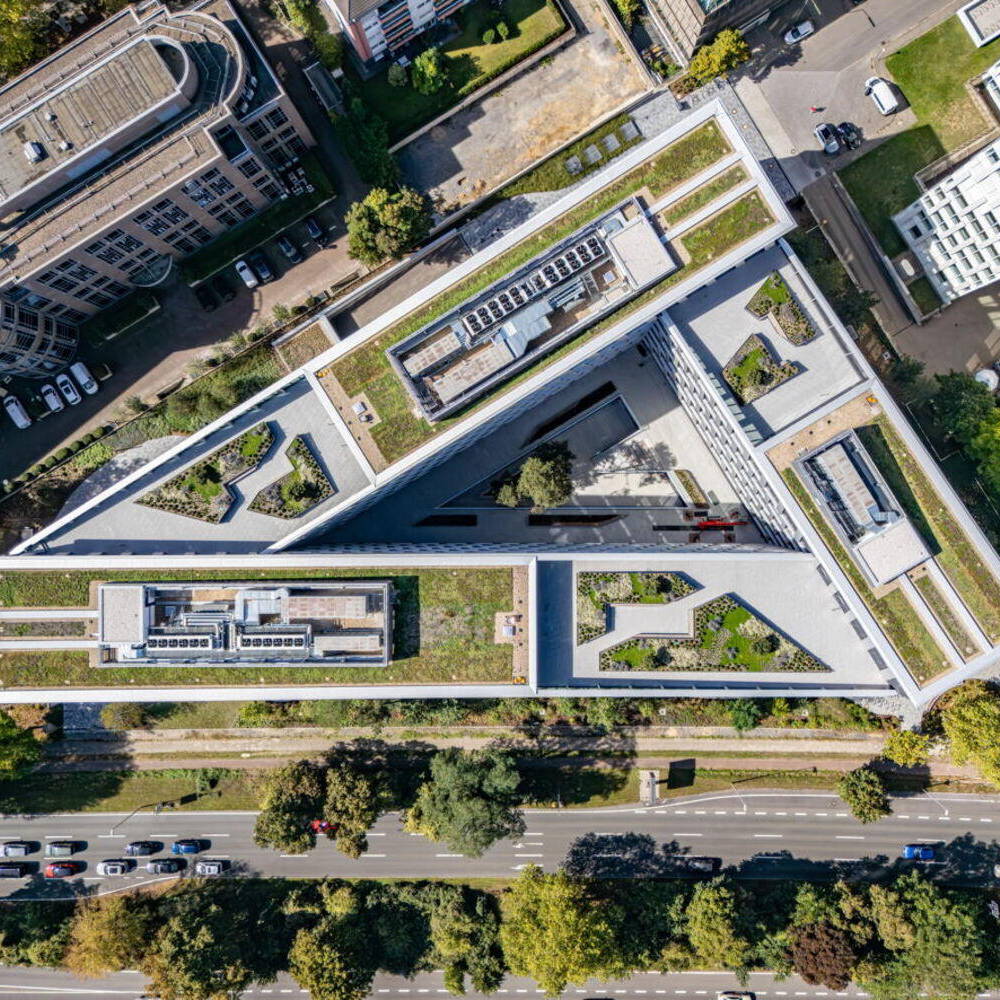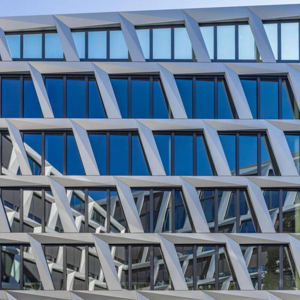 Die Komposition verbindet drei Gebäudeflügel um einen dreieckigen Innenhof und lässt dabei einen skulpturalen Baukörper mit hohem Wiedererkennungswert entstehen. Durch die jeweils zweigeschossige Anhebung der Gebäudeecken öffnet sich das Gebäude zu allen drei Seiten: Es ergeben sich drei großzügige Eingangssituationen, die die Erdgeschosszone mit dem Quartier vernetzen. Gleichzeitig entsteht durch den Höhenversatz im oberen Fassadenbereich eine spannungsvoll geformte Dachlandschaft mit windgeschützten Gärten für die Büromieter. Getrennt von der thermischen Hülle bildet die ebenso dynamisch konzipierte Vorhangfassade aus gefalteten Aluminium-Paneelen einen konstruktiven, außenliegenden Sonnenschutz, wodurch der sommerliche Wärmeeintrag ins Gebäude verringert wird. Jedes zweite Fassadenfeld lässt sich zur Komfortlüftung öffnen. Zugleich entsteht ein hohes Maß an Flexibilität: Jedes Bürokonzept – vom Großraum bis zum Zellen- oder Kombibüro lässt sich realisieren. Die ständigen Arbeitsplätze sind dabei fassadennah angeordnet. Ergänzend gibt es in den Mittelzonen flexibel nutzbare kommunikative Arbeitswelten mit vielfältigen Angeboten für die Mitarbeitenden.