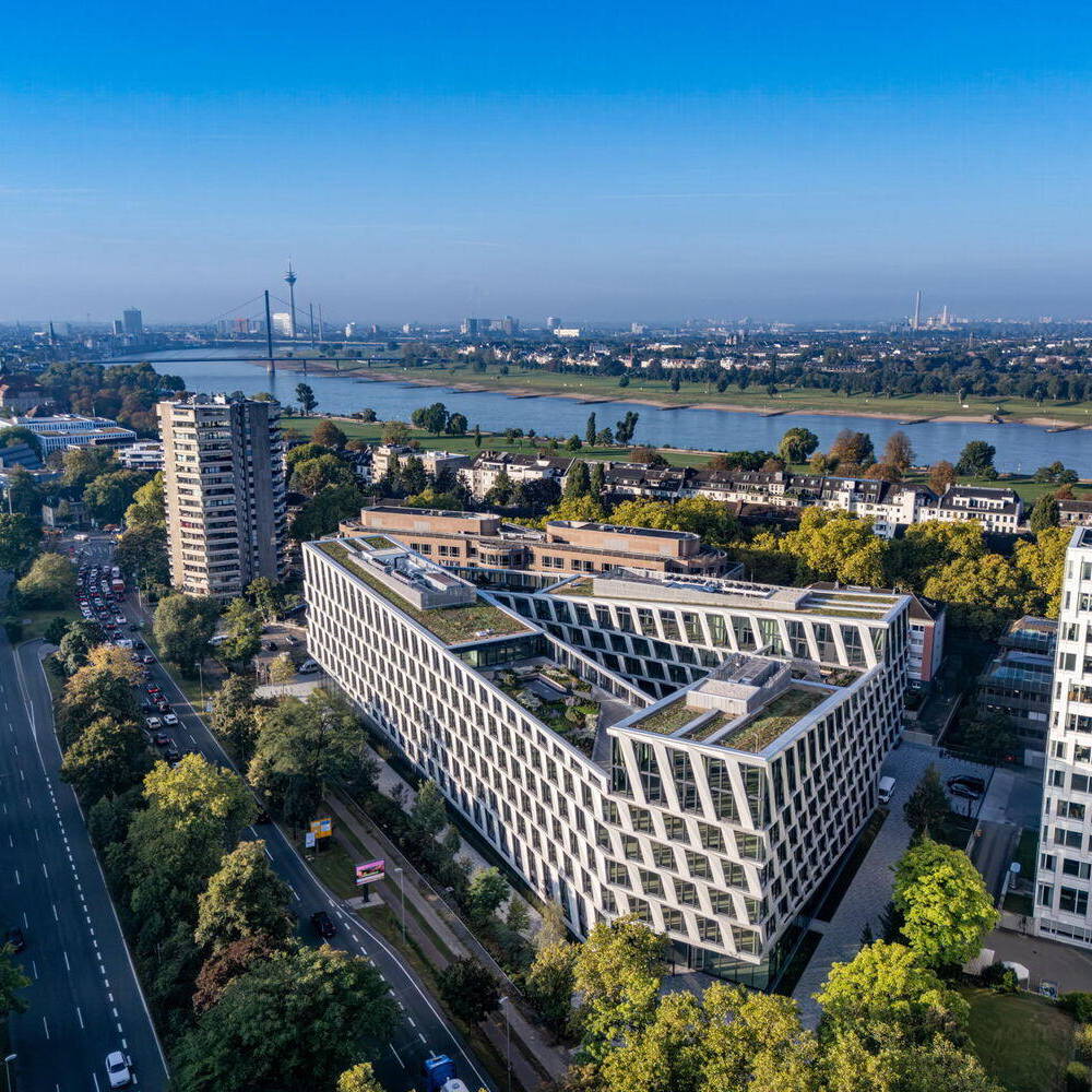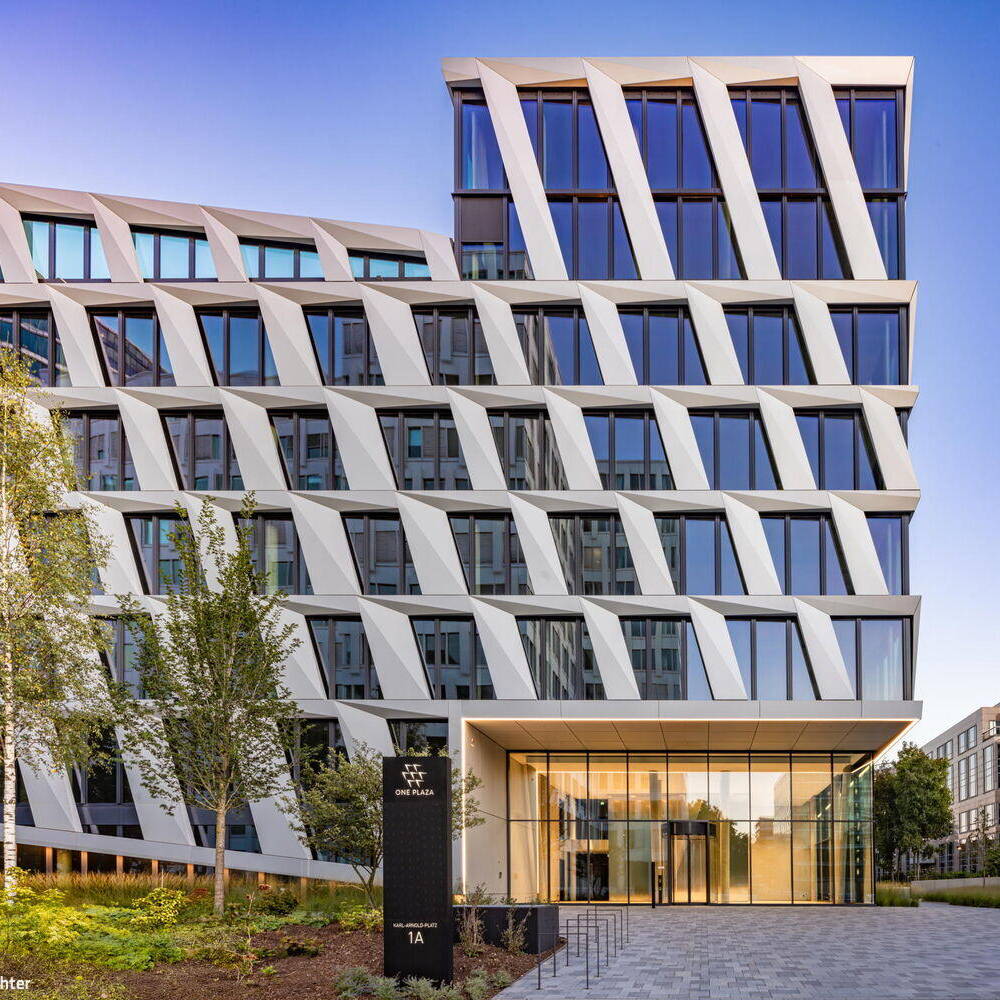 Der Kennedydamm in Düsseldorf-Golzheim gilt als eines der Einfahrtstore zur Düsseldorfer Innenstadt. HPP Architekten haben in den letzten Jahren hier maßgebliche Bauten geschaffen, darunter das Headquarter von L’Oréal Deutschland sowie gemeinsam mit UN Studio den vertikalen Campus Eclipse als prägnanten Stadtbaukörper. Zuletzt entstand nach Planungen des Düsseldorfer Architekturbüros das „One Plaza“: Der Neubau mit über 45.000 m² Bruttogeschossfläche für die Momeni-Gruppe bildet den Auftakt des Kennedydamms Richtung Rhein. Neben seiner Nutzung als Bürogebäude bietet er Flächen für Sondernutzungen, Gastronomie und Nahversorgung. Mit seiner markanten Fassade, einem großzügig begrünten Innenhof, nutzbaren Dachgärten und modernen Arbeitswelten steht das Gebäude für Identität, Nachhaltigkeit und Flexibilität.