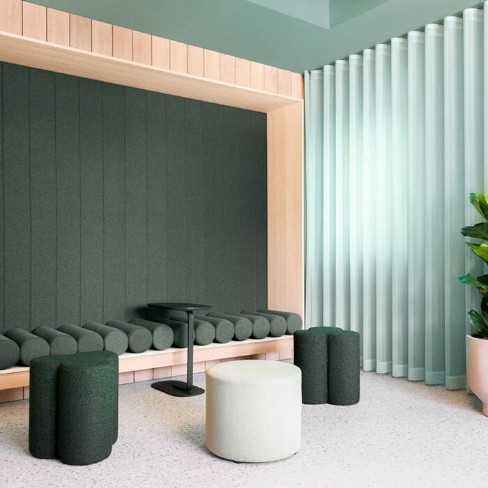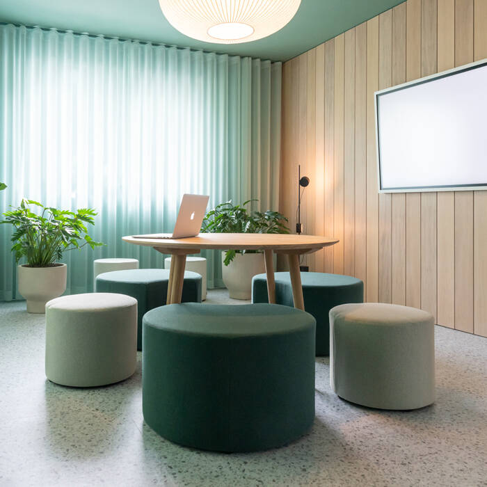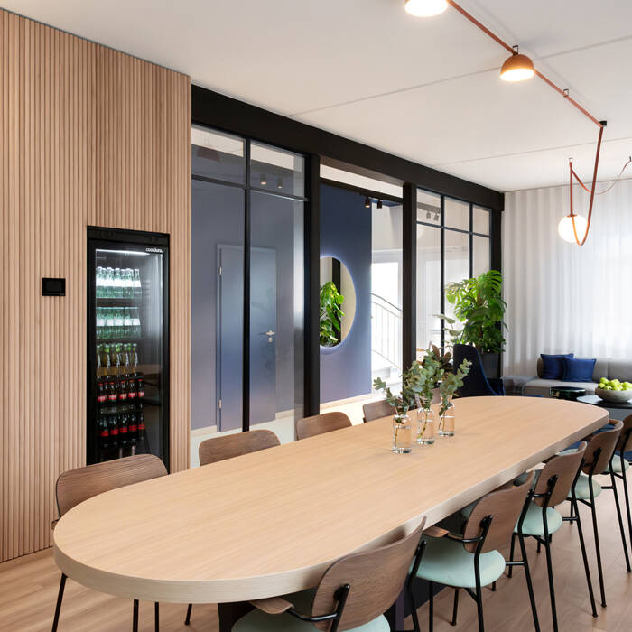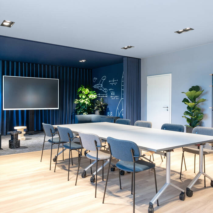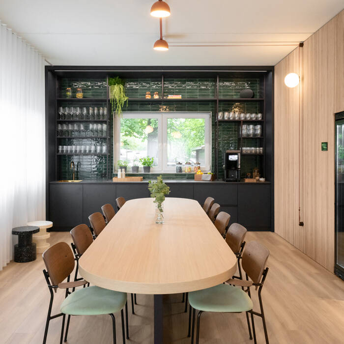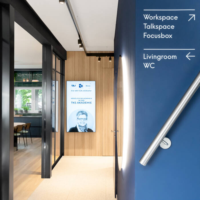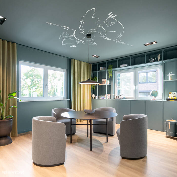 Das zweigeschossige „Manke Kompetenzzentrum“ bietet vier freundliche Seminarräume mit einem abwechslungsreich gestalteten Außenbereich, die eine dynamische Interaktion im Team mit moderner technischer Ausstattung ermöglichen. Die harmonische Farbgebung und ausdrucksstarke Themengestaltung spiegeln dabei auf eine unaufgeregte Weise die CI und den Wertekanon des Unternehmens wider. Jeder Raum wurde individuell gestaltet – mit einer Vielfalt an Naturmaterialien, Farben und Lichtsituationen, flexibel nutzbaren Sitz- und Tagungsmöbeln sowie stilvollen Designelementen, die Kreativität und Visionskraft anregen. Begrüßt werden die Besucher:innen in einem einladenden Eingangsbereich mit integriertem Videodisplay und dem orientierenden Wegleitsystem. Der zentrale Kommunikationsort ist im Erdgeschoss der große, farbenfrohe „Livingroom“: Die lange Tafel vor der Designküchenzeile ist Wohnküche, Begegnungs- und Eventbereich zugleich. Ein Loungebereich mit modularem Sofa eignet sich für den persönlichen Austausch oder Gruppenarbeiten. Ein ausdrucksstarkes Designelement stellt die Deckenlampe dar, die sich durch ihre Kabelführung wie ein „roten Faden“ durch den gesamten Raum erstreckt. Der größte und zugleich flexibelste Tagungsraum ist der „Workspace“, in dem die Zeichen ganz auf transformativen Antrieb, Energie und Arbeitslust stehen: Ein Blauton, der dem CI-Farbkanon des Unternehmens entnommen ist, bietet hier den Hintergrund für eine markante Wandbemalung mit Motiven aus dem Bereich der Raketentechnik. Ein flexibles Bestuhlungskonzept mit Gruppen- oder Einzeltischen für bis zu 20 Personen und eine über Stores abtrennbare Podiumsbühne kreieren den Rahmen für unterschiedlichste Veranstaltungsformate – von Gruppenarbeiten bis hin zu Podiumsdiskussionen und Produktvorstellungen. Konzentration und intensiver Dialog stehen im Fokus des „Talkspace“, der farblich von einem Petrol geprägt wird. Die Decke über dem runden Holztisch ziert – bildhaft und wegweisend zugleich – eine kunstfertige Kompass-Handzeichnung. Bleibt noch die sogenannte „Focusbox“: Die grüne Farbgebung, eine Holzwandverkleidung, der Bodenbelag in Terrazzo-Optik sowie das Bepflanzungskonzept erzeugen hier eine meditative Grundstimmung und verbinden den Raum mit der Natur. Die formschönen Poufs lassen sich leicht in einer Sitznische verstauen und durch Yogamatten ersetzen, um beim morgendlichen Ritual gemeinsam Kraft zu tanken.