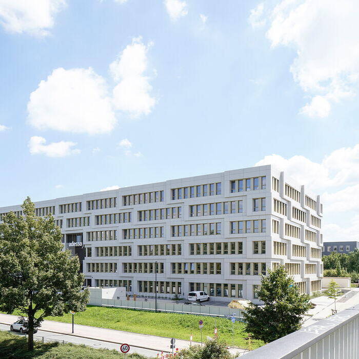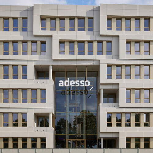 Ein neues Bürogebäude an der Stadtkrone Ost in Dortmund fällt aufgrund seiner ungewöhnlichen 3D-Fassade sofort ins Auge. Der sechsgeschossige Bau mit dem schwungvollen Namen „adesso campus 3“ ist bereits aus der Ferne gut sichtbar. Die Fassade besteht aus gegeneinander pro Geschoss versetzten, geschuppten Fassadenboxen aus Aluminium-Verbundblech. Dabei verläuft die Schuppung der Fassade nur in eine Richtung und wurde so ausgerichtet, dass im Laufe eines Tages unterschiedliche Schatten- und Tiefenwirkungen auf der Fassade entstehen. Auf diese Weise wirkt der ca. 100 Meter lange, 34 Meter breite und 22 Meter hohe Baukörper dynamischer und leichter. Die vertikale Gliederung der Fenster mit goldfarbenen Elementen setzt dazu einen spannungsvollen Kontrapunkt.