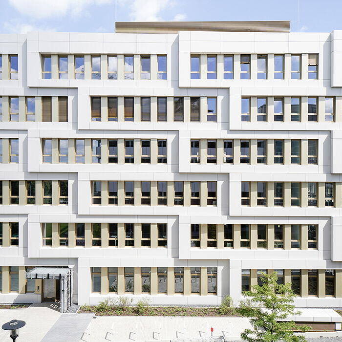 Die gesamte Fassadenkonstruktion wurde im Vorfeld in einem 3D-CAD Modell konstruiert, sodass anhand dieses Modells bereits in der Planung die vielen Detailpunkte planerisch erkannt, konstruktiv gelöst und sauber an der Baustelle umgesetzt werden konnten. Unabhängig davon haben sich die Planenden von Kemper, Steiner & Partner Architekten aus Bochum aufgrund der Besonderheit der Fassade dazu entschieden, vor Baubeginn ein 1:1 Muster der Fassade in Auszügen im Werk zu erstellen. So konnten noch weitere Detailprobleme erkannt und gelöst werden sowie die spätere Produktion der Tafeln mittels CNC-Fräse und die Montage an der Baustelle optimiert werden. Der Eingangsbereich ist mit einer in der Ebene zurückversetzten Pfosten- Riegelfassade über vier Geschosse repräsentativ gestaltet. Dies lässt sowohl spannende Einblicke in das Foyer und die Galeriegänge, als auch Ausblicke aus diesen Bereichen zu.