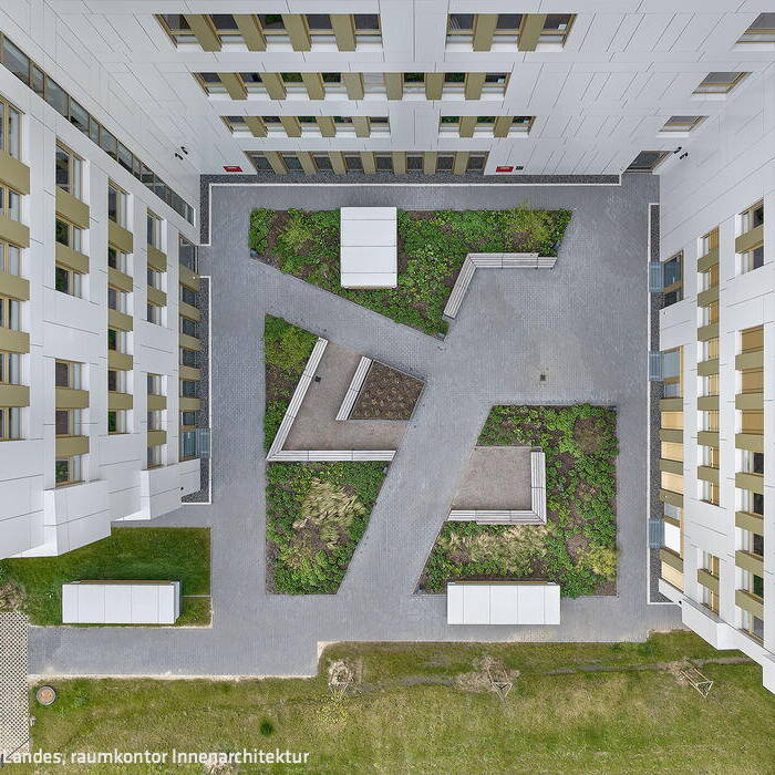 Die Gebäudeform wurde als Kammstruktur geplant, die sich nach Süden öffnet, so dass zwei Innenhöfe entstehen. Dessen Gestaltung schafft einen konstrastierenden Akzent zur Gebäudearchitektur. Der Innenhof, der auch einen Durchgangsraum für die Gebäudestränge bildet, inszeniert sich von oben wie ein gerahmtes Bild: So wurden begrünte Flächen und ein Wegenetz als geometrische Formen ausgebildet. Das aufgehende Gebäude gründet auf einer Tiefgarage mit ca. 5.000 m² Grundfläche und 150 unterirdischen sowie 60 oberirdischen Stellplätzen. Das von der Firma Freundlieb entwickelte und realisierte Gebäude mit flexibel aufteilbaren Nutzungsstrukturen besitzt eine Gesamtnutzfläche von 11.300 m². Angelehnt an die äußere Architektur, wurden die Innenbereiche von raumkontor aus Düsseldorf geplant.