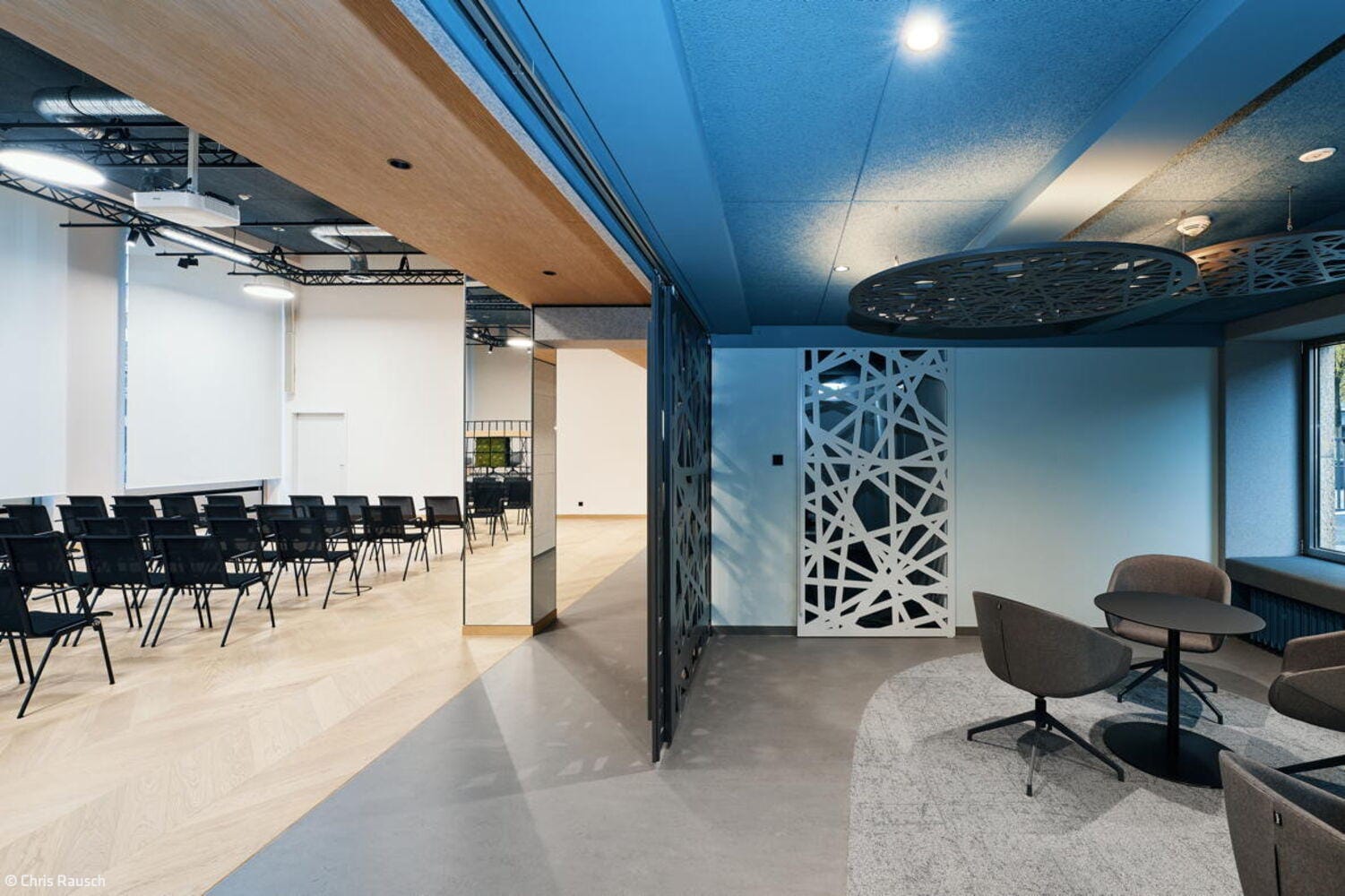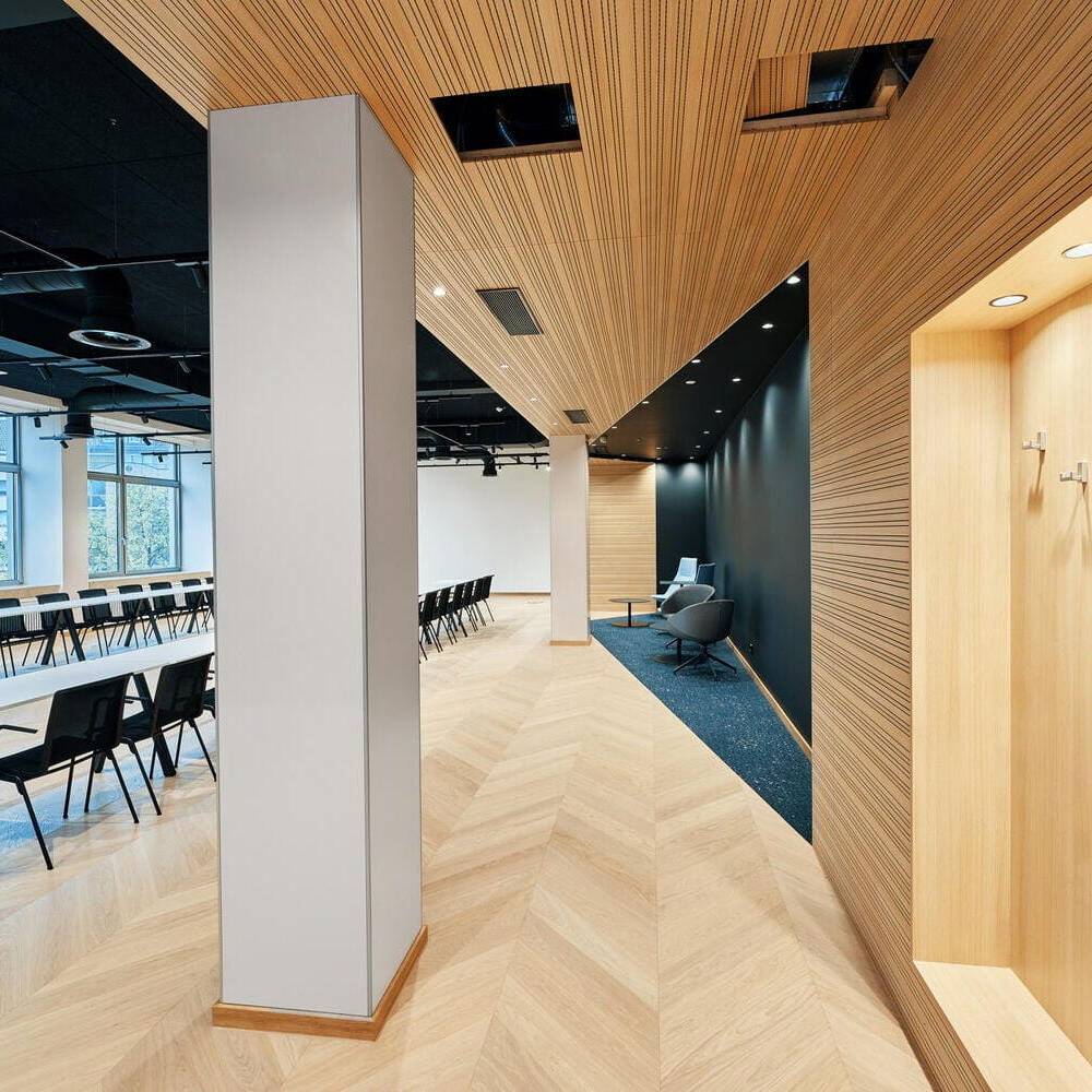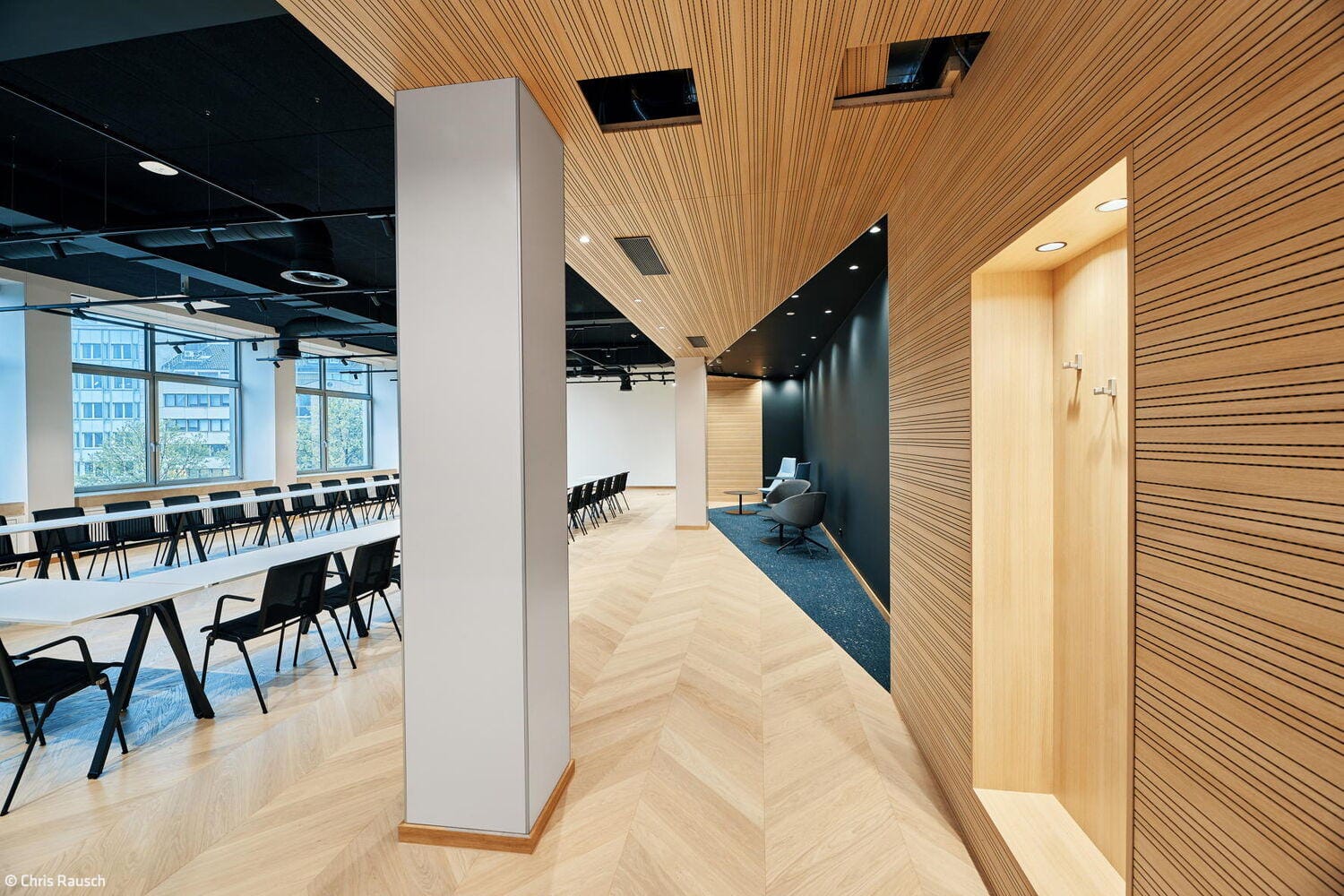 Im Erdgeschoss wurde der bislang sehr funktional ausgestattete Ernst-Schneider-Saal zunächst einmal vollständig entkernt. Neben dem Fußboden wurden auch alle abgehängten Decken entfernt. Die lichte Deckenhöhe von 5,80 Metern blieb beim Umbau bewusst erhalten. Alle in der Technikdecke verborgenen haustechnischen Installatio-nen – Licht, Klimatechnik, Audiotechnik und Sprinkleranlage – wurden offen und einsehbar belassen. Lediglich eine Seitenzone des Saales behielt ihre niedrige Deckenhöhe: Aus dem zuvor räumlich etwas etwas unklar definierten „Cafépoint“ wurde so ein „Blue Room“ mit flexiblen Sitznischen, warmem Naturfilz an den Wänden und bequemen Lounge-Sitzmöbeln. Über filigrane Holzschiebetüren in kontrastierendem Schwarz lässt sich dieser Rückzugsraum flexibel abtrennen, ohne dabei viel Tageslicht zu verlieren. Im erhöhten Eingangsbereich des Saals entstand zudem ein „First Meet“-Bereich: Ein modulares Raumregal definiert hier eine neue Schnittstelle zwischen Aufenthalt und Zugang. Von Anfang an war es dem Bauherren wichtig, dass kein falscher Eindruck entsteht: „Wir sind als Handwerkskammer sowohl für die kleinen Handwerksbetriebe als auch große global agierende Konzerne da“, betont Jan Dirk Hennig, stellvertretender Hauptgeschäftsführer der IHK Düsseldorf, der den Umbau von den ersten Planungen 2022 bis zur Fertigstellung im Januar 2025 begleitet hat. Er freut sich, dass das Projekt im Budget blieb und pünktlich fertiggestellt wurde – trotz Lieferengpässen nach Corona. „Statt Opulenz sollte ein ehrliches, durch und durch transparentes Interior entstehen“, ergänzt Daniel Schwecke, geschäftsführender Gesellschafter bei Lindner Architekten. „You get what you see“ lautet das Leitmotto des Ausbaus – an den geöffneten Decken ebenso ablesbar wie an Holz- und Stoffmaterialien, die traditionell handwerklich verarbeitet wurden und gleichzeiting nachhaltige, dauerhafte Nutzungsaspekte berücksichtigen. Auch auf der dritten Etage, wo weitere Konferenz- und Seminarräume liegen, ist derselbe Material- und Mobiliar-Mix zum Einsatz gekommen. Der gesamte öffentliche Konferenzbereich bietet nun auch etagenübergreifend eine stimmige Visitenkarte für die IHK und ihre Partner.