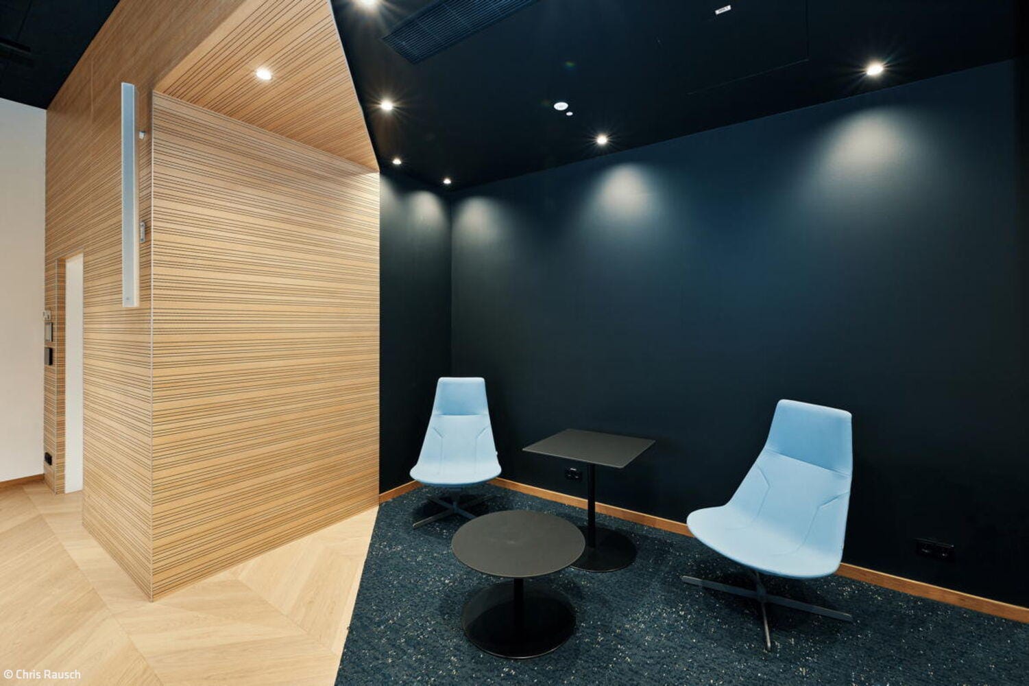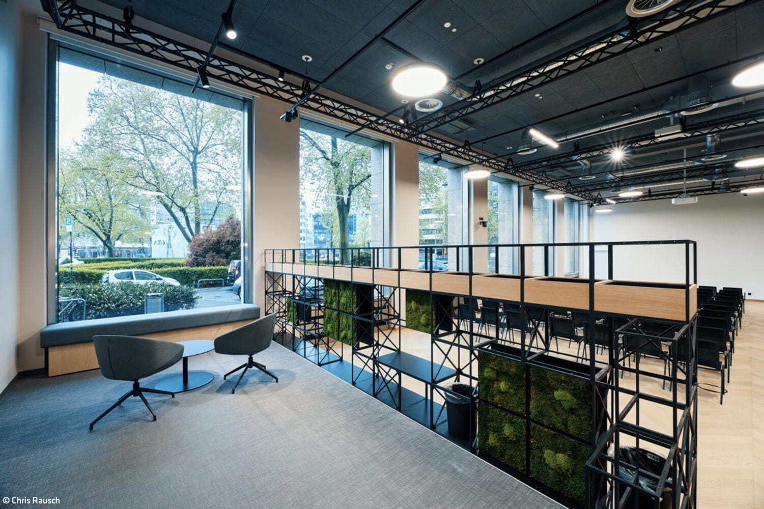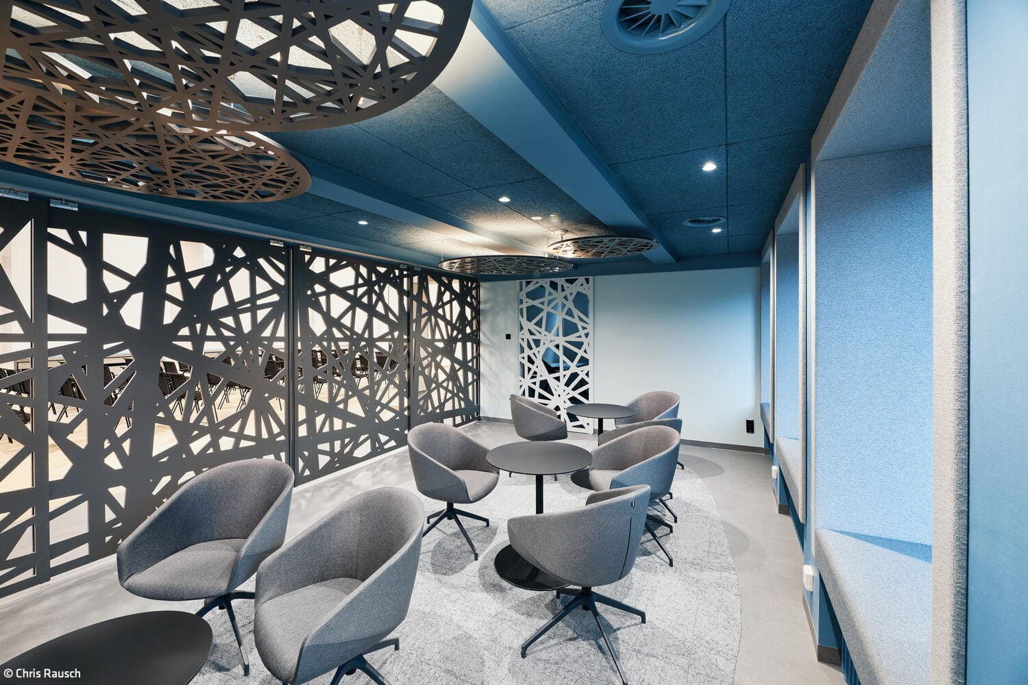 Im Erdgeschoss wurde der bislang sehr funktional ausgestattete Ernst-Schneider-Saal zunächst einmal vollständig entkernt. Neben dem Fußboden wurden auch alle abgehängten Decken entfernt. Die lichte Deckenhöhe von 5,80 Metern blieb beim Umbau bewusst erhalten. Alle in der Technikdecke verborgenen haustechnischen Installatio-nen – Licht, Klimatechnik, Audiotechnik und Sprinkleranlage – wurden offen und einsehbar belassen. Lediglich eine Seitenzone des Saales behielt ihre niedrige Deckenhöhe: Aus dem zuvor räumlich etwas etwas unklar definierten „Cafépoint“ wurde so ein „Blue Room“ mit flexiblen Sitznischen, warmem Naturfilz an den Wänden und bequemen Lounge-Sitzmöbeln. Über filigrane Holzschiebetüren in kontrastierendem Schwarz lässt sich dieser Rückzugsraum flexibel abtrennen, ohne dabei viel Tageslicht zu verlieren. Im erhöhten Eingangsbereich des Saals entstand zudem ein „First Meet“-Bereich: Ein modulares Raumregal definiert hier eine neue Schnittstelle zwischen Aufenthalt und Zugang. Von Anfang an war es dem Bauherren wichtig, dass kein falscher Eindruck entsteht: „Wir sind als Handwerkskammer sowohl für die kleinen Handwerksbetriebe als auch große global agierende Konzerne da“, betont Jan Dirk Hennig, stellvertretender Hauptgeschäftsführer der IHK Düsseldorf, der den Umbau von den ersten Planungen 2022 bis zur Fertigstellung im Januar 2025 begleitet hat. Er freut sich, dass das Projekt im Budget blieb und pünktlich fertiggestellt wurde – trotz Lieferengpässen nach Corona. „Statt Opulenz sollte ein ehrliches, durch und durch transparentes Interior entstehen“, ergänzt Daniel Schwecke, geschäftsführender Gesellschafter bei Lindner Architekten. „You get what you see“ lautet das Leitmotto des Ausbaus – an den geöffneten Decken ebenso ablesbar wie an Holz- und Stoffmaterialien, die traditionell handwerklich verarbeitet wurden und gleichzeiting nachhaltige, dauerhafte Nutzungsaspekte berücksichtigen. Auch auf der dritten Etage, wo weitere Konferenz- und Seminarräume liegen, ist derselbe Material- und Mobiliar-Mix zum Einsatz gekommen. Der gesamte öffentliche Konferenzbereich bietet nun auch etagenübergreifend eine stimmige Visitenkarte für die IHK und ihre Partner.