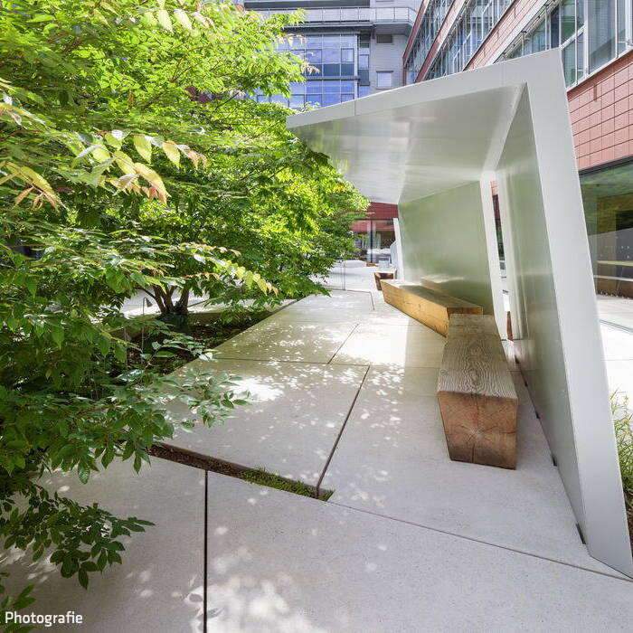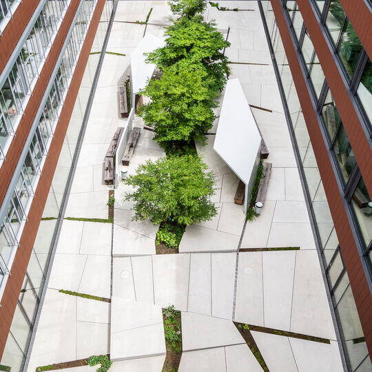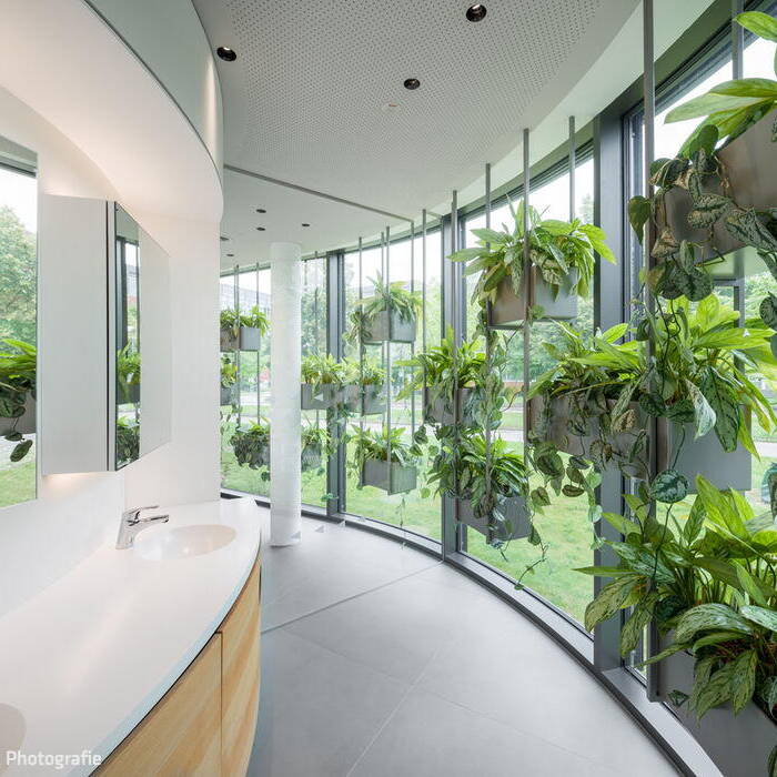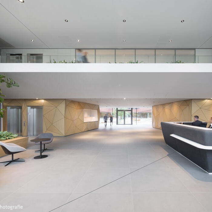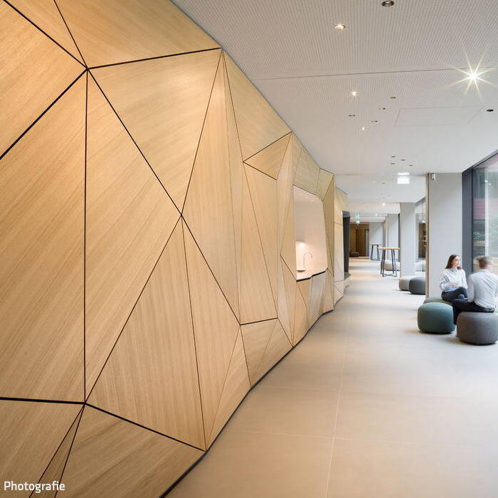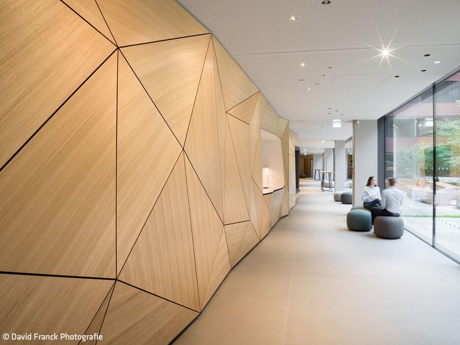 Bereits in der großzügigen, zweigeschossigen Lobby erleben die Besucher:innen die dreidimensional geformte Raumskulpturwand aus Eichenfurnier. Mit ihrer mehrfach gefalteten Oberfläche scheint sie sich permanent in einer sanften Schwingung zu befinden und umfasst rund um den zentralen Innenhof der Akademie einen besonderen Begegnungsraum für die Schulungsgäste aus der ganzen Welt. Das Bild von sich treffenden und schneidenden Vektoren ist beim Betrachten der Wand stets präsent und passt wie ein Maßanzug zum Namen des Unternehmens. Die skulpturale Wand ist dabei weit mehr als nur optisches Gestaltungsmittel: Sie verengt und weitet den Raum, be- und entschleunigt die Bewegungen der Gäste und formt Plätze für Begegnungen sowie Rückzugszonen. Darüber hinaus bildet sie Nischen aus, die bequeme Sitzgelegenheiten oder praktische Teeküchen aufnehmen. In und hinter der Wandskulptur verschwinden alle wichtigen Technikinstallationen wie die ausfahrbaren Brandschutzwände. Konsequent zieht sich die Idee des gebauten Vektorenraums in den begehbaren Innenhof weiter und findet sich etwa in den Bodenfugen und Holzbänken wieder. Einen emotionalen Kontrapunkt setzt die phantasievolle Pflanzeninstallation der Greenterior-Designerin Miriam Köpf.