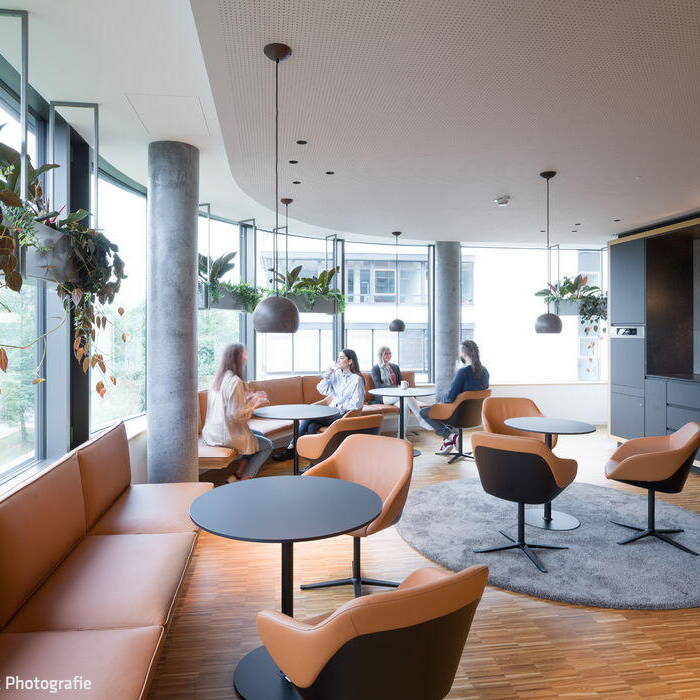 Die Academy ist die gebaute Visitenkarte für Vector, denn sie ermöglicht Kund:innen meist den ersten physischen Kontakt mit dem Unternehmen. Die neun Schulungsräume im Erdgeschoss wurden entlang der Fassade angeordnet, um möglichst viel – auf natürliche Weise belebendes – Tageslicht in die Räume zu bringen. Innenarchitektur und Materialität tragen dazu bei, dass sich das Lernen als positives Erlebnis verankert. Die Academy ist aber auch ein Ort, der zu zwischenmenschlichen Begegnungen inspiriert, die Sinne anregt und zugleich angenehm beruhigt.
