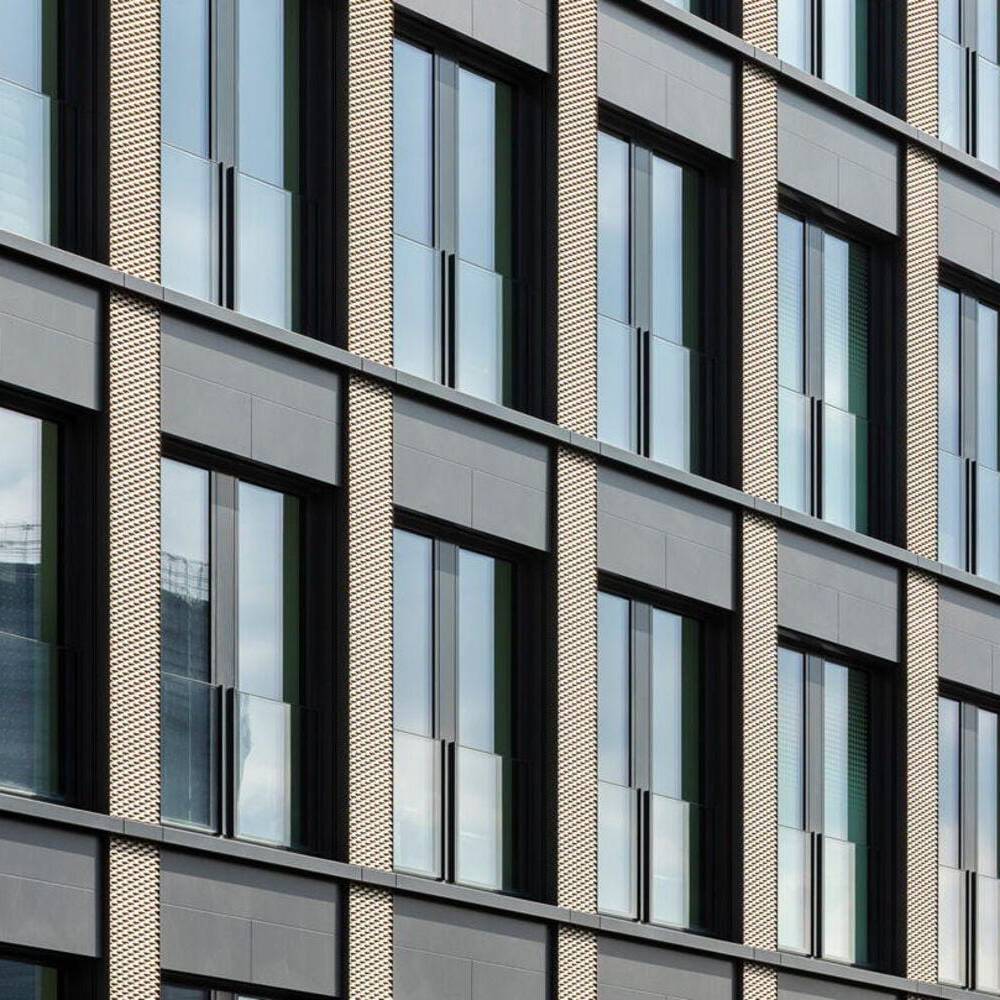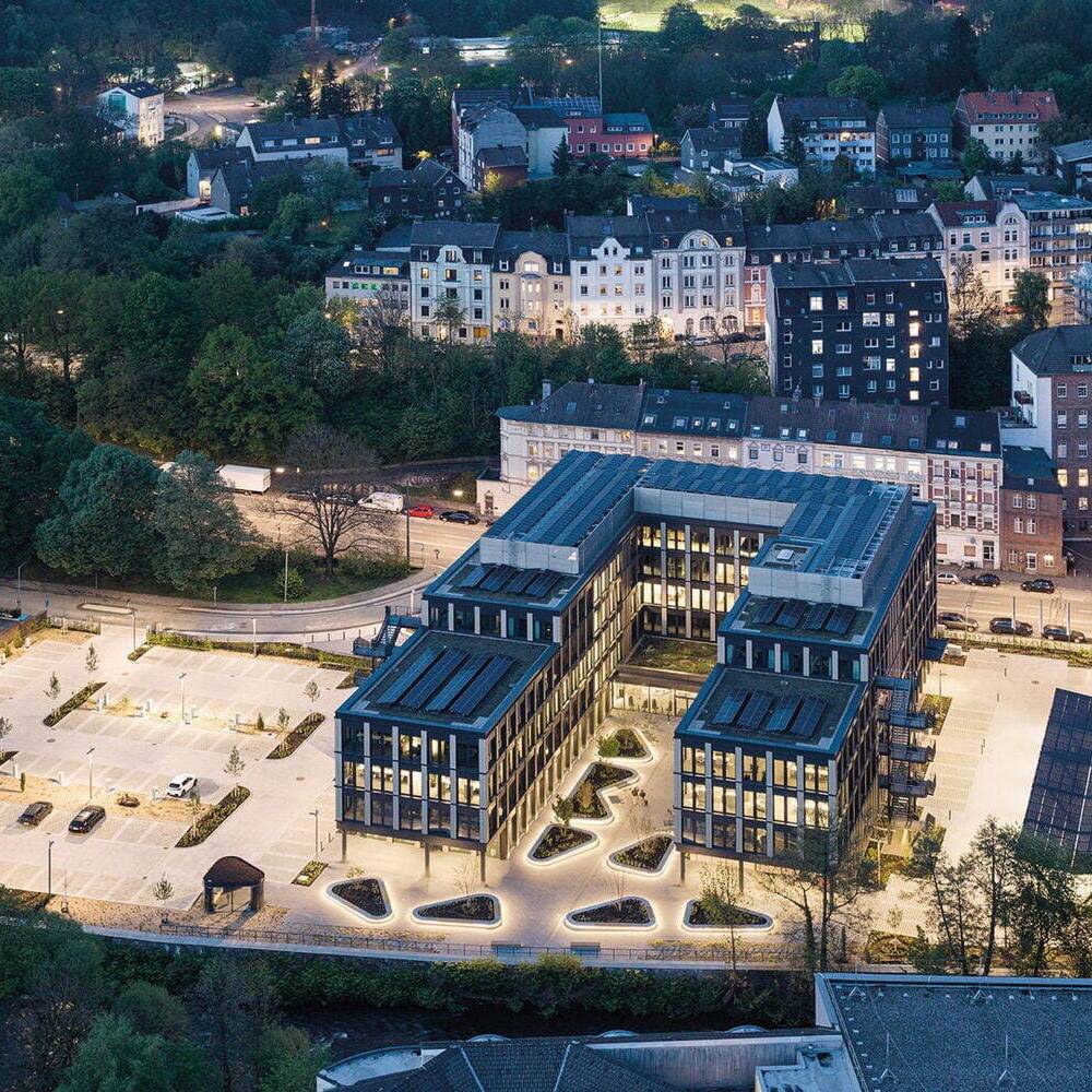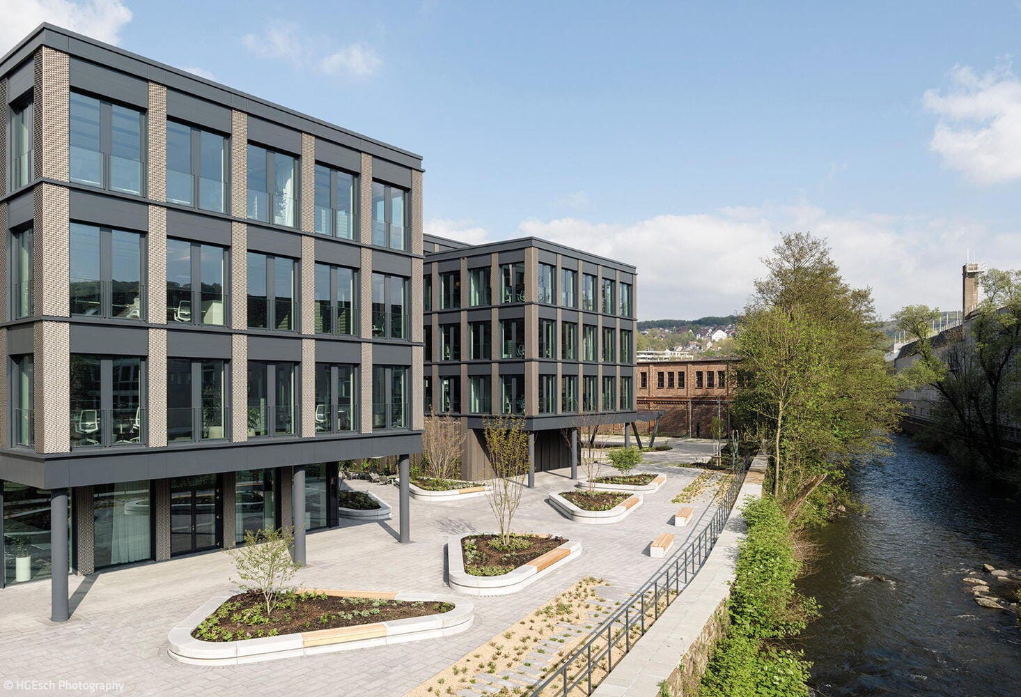 Entstanden ist ein U-förmiger Baukörper mit ca. 9.500 m² Bruttogeschossfläche, in dem rund 375 Mitarbeitende eine moderne, lichtdurchflutete und nachhaltige Arbeitsumgebung vorfinden. Offene Raumkonzepte, multifunktionale Arbeitsbereiche und Konferenzzonen prägen den Arbeitsalltag. Nach dem Prinzip „New Work“ stehen Flexibilität, Agilität und Kommunikation im Vordergrund, ergänzt durch ergonomische Möblierung und eine technisch hochwertige Ausstattung. Das Gebäude orientiert sich harmonisch an der Wupper und besticht durch eine elegante und hinterlüftete Fassade aus champagnerfarbenem Streckmaterial, die Ästhetik und Funktionalität vereint. Großformatige Fenster eröffnen von innen den Blick auf den inspirierenden Außenbereich mit begrünten Sitzinseln, die an Kieselsteine im Fluss erinnern und zu kreativen Pausen einladen. Zur konsequent nachhaltigen Planung gehören auch teilbegrünte Dächer sowie Photovoltaik-Anlagen auf dem Dach, die mit Luft/Wärmepumpen rund 55 Prozent des Energiebedarfs durch erneuerbare Energien abdecken. Ergänzt durch ein Photovoltaik-Carport und 45 Ladepunkte für E-Autos wurde die höchste DGNB-Zertifizierung Platin erreicht. Vom großzügigen Vorplatz gelangt man zum Empfang, dem sich in Richtung Nordwesten eine Kaffeebar anschließt. Ebenfalls im Erdgeschoss befinden sich der Konferenzbereich, das Betriebsrestaurant mit 80 Plätzen, die Küche und Poststelle sowie Technikräume. Dass Inklusion bei Vorwerk einen hohen Stellenwert einnimmt, ist an zahlreichen Details erlebbar: Innen wie außen ist ein schwellenloser Zugang möglich. Neben zwei Haupttreppenhäusern stehen drei Aufzüge bereit. Visuelle Leitsysteme und eine sichere Wegeführung unterstützten sehbehinderte Menschen. Weiterhin sind die Gänge bewusst breit angelegt, Böden mit rutschhemmenden Belägen ausgestattet und die Sanitärräume barrierefrei gestaltet. Darüber hinaus runden behindertengerechte Stellplätze das inklusionsorientierte Gesamtkonzept ab. Auf eine Tiefgarage wurde aufgrund der Nähe zur Wupper verzichtet und das Gebäude stattdessen auf eine erhöhte Bodenplatte platziert. In Kombination mit einer wasserundurchlässigen Konstruktion und der optimalen Gestaltung des Geländes wurden so bestmögliche Vorkehrungen zum Hochwasserschutz getroffen.
