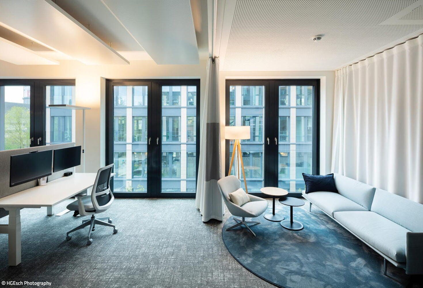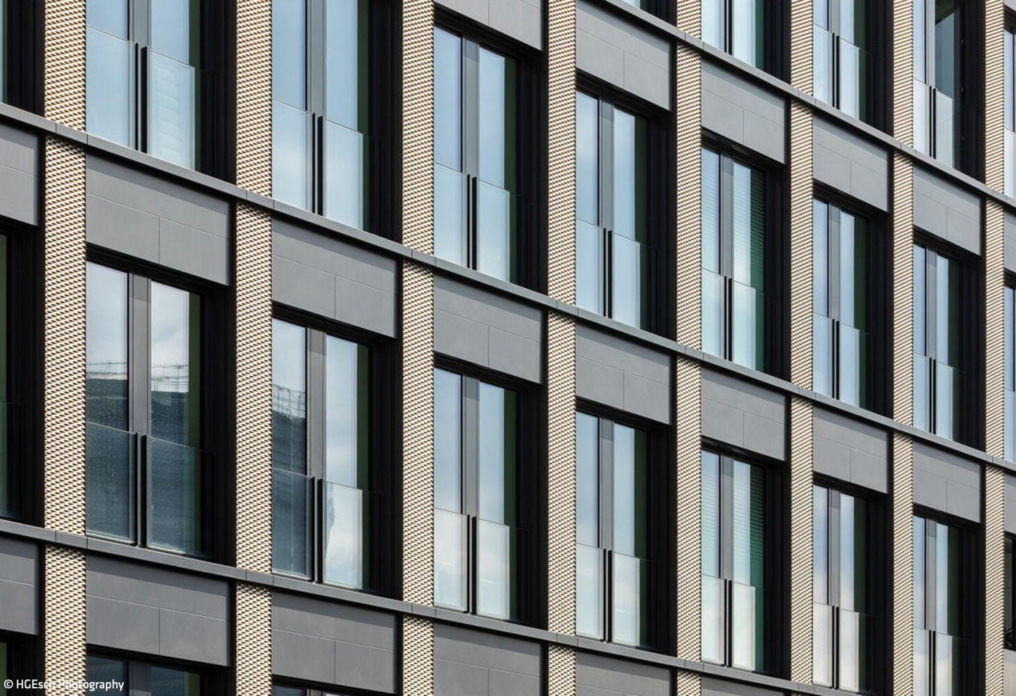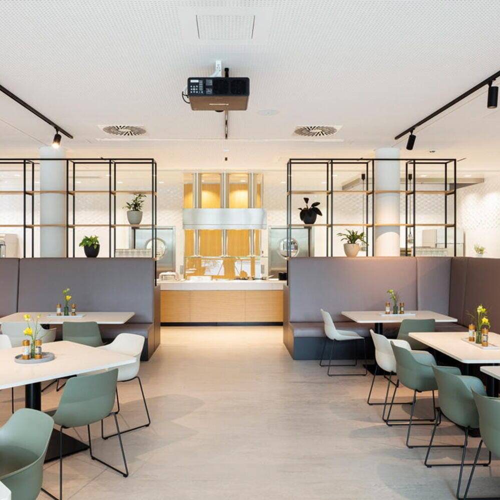 Entstanden ist ein U-förmiger Baukörper mit ca. 9.500 m² Bruttogeschossfläche, in dem rund 375 Mitarbeitende eine moderne, lichtdurchflutete und nachhaltige Arbeitsumgebung vorfinden. Offene Raumkonzepte, multifunktionale Arbeitsbereiche und Konferenzzonen prägen den Arbeitsalltag. Nach dem Prinzip „New Work“ stehen Flexibilität, Agilität und Kommunikation im Vordergrund, ergänzt durch ergonomische Möblierung und eine technisch hochwertige Ausstattung. Das Gebäude orientiert sich harmonisch an der Wupper und besticht durch eine elegante und hinterlüftete Fassade aus champagnerfarbenem Streckmaterial, die Ästhetik und Funktionalität vereint. Großformatige Fenster eröffnen von innen den Blick auf den inspirierenden Außenbereich mit begrünten Sitzinseln, die an Kieselsteine im Fluss erinnern und zu kreativen Pausen einladen. Zur konsequent nachhaltigen Planung gehören auch teilbegrünte Dächer sowie Photovoltaik-Anlagen auf dem Dach, die mit Luft/Wärmepumpen rund 55 Prozent des Energiebedarfs durch erneuerbare Energien abdecken. Ergänzt durch ein Photovoltaik-Carport und 45 Ladepunkte für E-Autos wurde die höchste DGNB-Zertifizierung Platin erreicht. Vom großzügigen Vorplatz gelangt man zum Empfang, dem sich in Richtung Nordwesten eine Kaffeebar anschließt. Ebenfalls im Erdgeschoss befinden sich der Konferenzbereich, das Betriebsrestaurant mit 80 Plätzen, die Küche und Poststelle sowie Technikräume. Dass Inklusion bei Vorwerk einen hohen Stellenwert einnimmt, ist an zahlreichen Details erlebbar: Innen wie außen ist ein schwellenloser Zugang möglich. Neben zwei Haupttreppenhäusern stehen drei Aufzüge bereit. Visuelle Leitsysteme und eine sichere Wegeführung unterstützten sehbehinderte Menschen. Weiterhin sind die Gänge bewusst breit angelegt, Böden mit rutschhemmenden Belägen ausgestattet und die Sanitärräume barrierefrei gestaltet. Darüber hinaus runden behindertengerechte Stellplätze das inklusionsorientierte Gesamtkonzept ab. Auf eine Tiefgarage wurde aufgrund der Nähe zur Wupper verzichtet und das Gebäude stattdessen auf eine erhöhte Bodenplatte platziert. In Kombination mit einer wasserundurchlässigen Konstruktion und der optimalen Gestaltung des Geländes wurden so bestmögliche Vorkehrungen zum Hochwasserschutz getroffen.