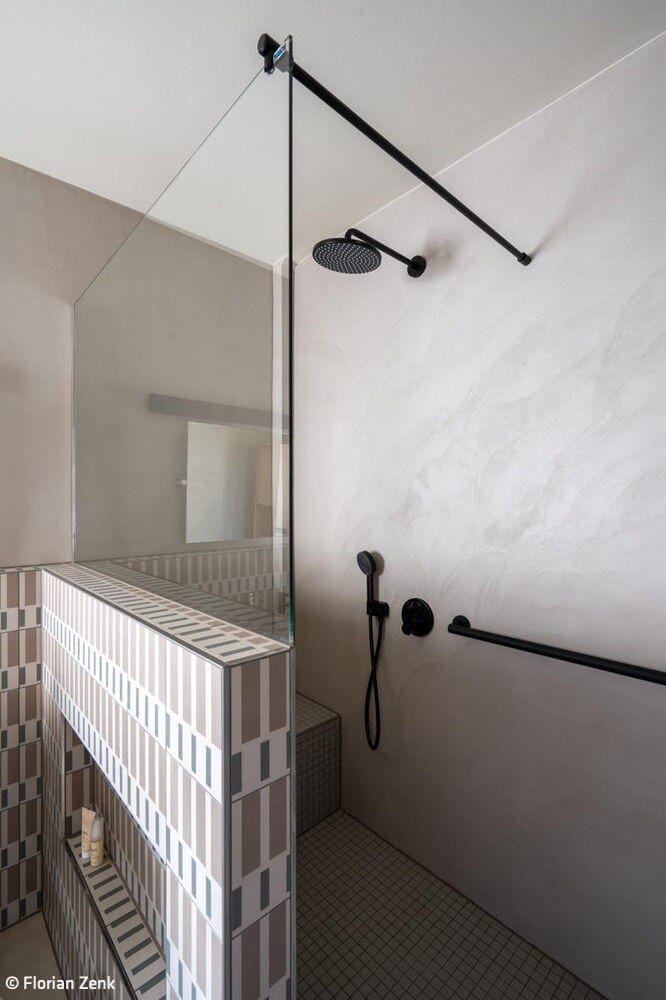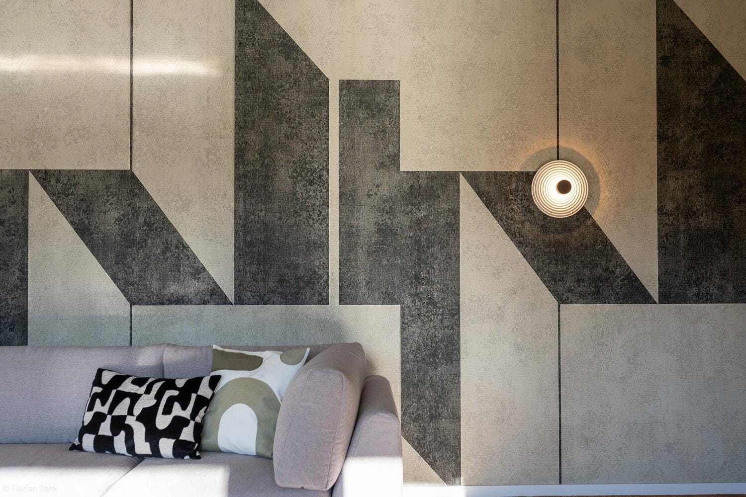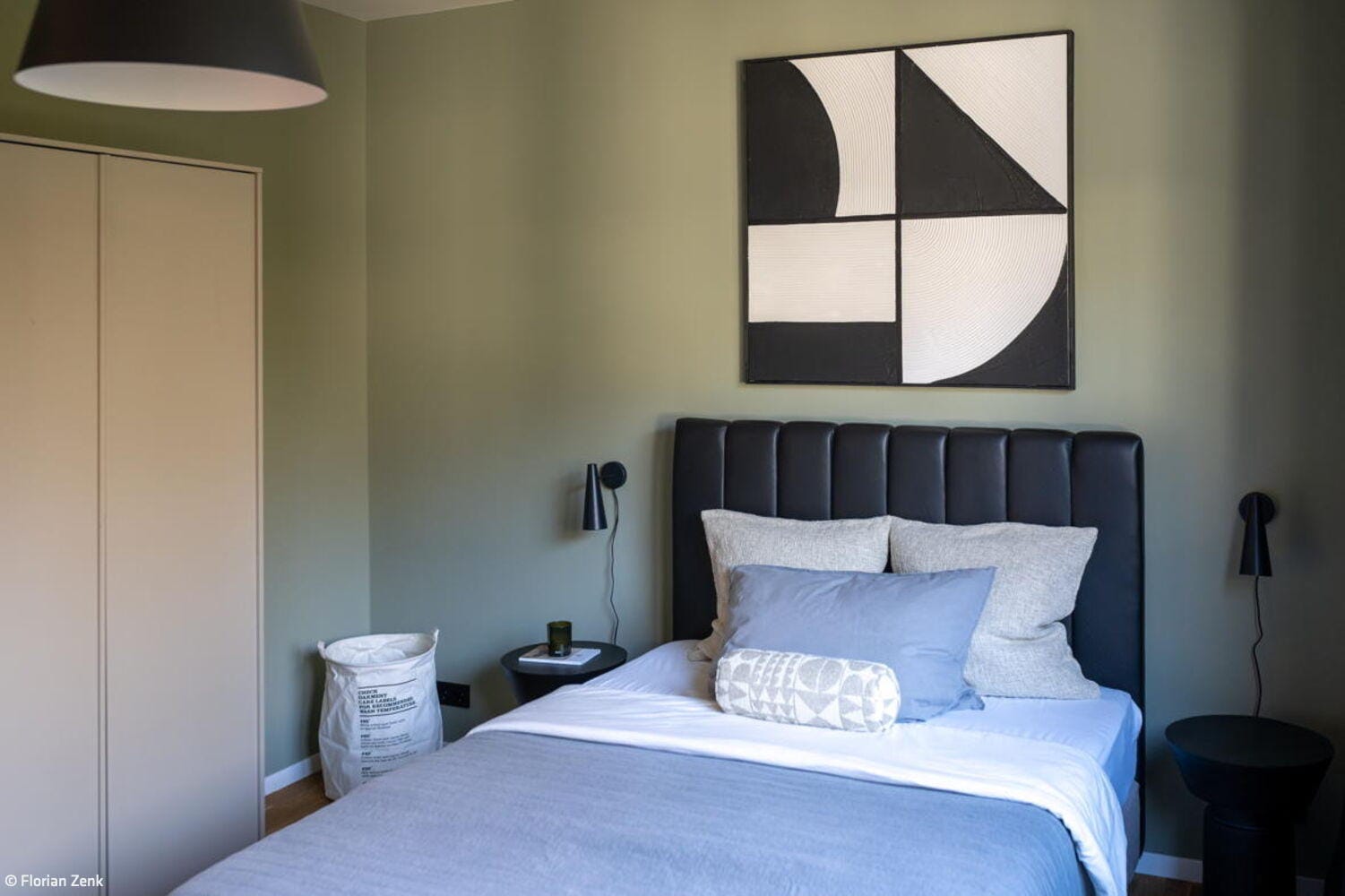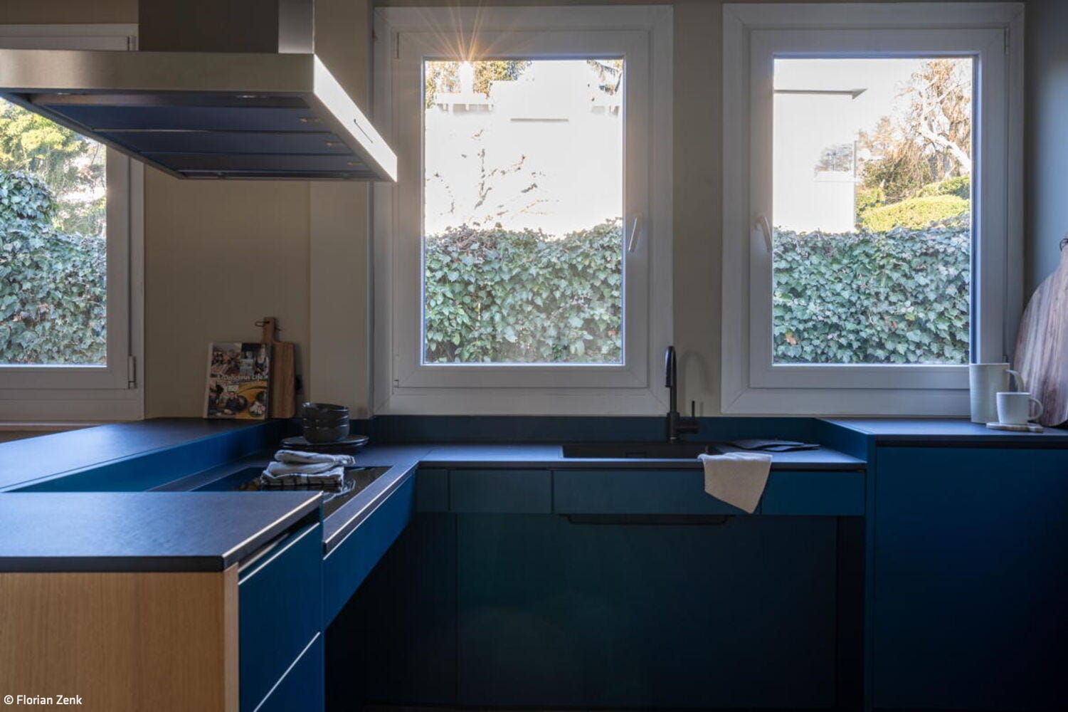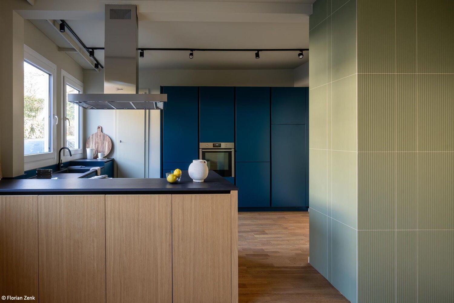 Die Innenarchitekten begegneten ihrer Aufgabe mit einem klaren gestalterischen Leitgedanken: Räume zu schaffen, die Rücksicht und Offenheit zugleich verkörpern – architektonisch wie atmosphärisch. Der Bestand aus den 1960er-Jahren brachte dabei durchaus Hürden mit sich: Der Grundriss musste neu gedacht, Höhenunterschiede ausgeglichen und Wege großzügig geplant werden. Gleichzeitig galt es, das typische Flair des Bungalows – sein offenes, lichtdurchflutetes Wohngefühl – zu bewahren. So entschieden sich die Innenarchitekten für eine sensible Balance aus Bewahren und Verwandeln: Großzügige Durchgänge, schwellenlose Übergänge und maßgefertigte Einbauten ermöglichen heute Bewegungsfreiheit und Komfort. Materialien wie Eichenholz, Quarzkomposit und samtig matte Fliesen schaffen eine wohnliche Atmosphäre, die Wärme und Wertigkeit ausstrahlt. In der Küche prägt ein mutiger Kontrast das Herzstück des Hauses: Hochschränke in kräftigem Königsblau treffen auf hochformatige Fliesen in Grün, deren vertikales Liniendesign die fein kannelierte Oberfläche der Kücheninsel aufgreift. Unterfahrbare Arbeitsflächen, ergonomische Höhen und robuste Materialien verbinden Funktionalität mit Eleganz. Die Küche wird damit zum kommunikativen Zentrum, in dem Inklusion im Alltag selbstverständlich gelebt wird. Auch das Badezimmer beweist, wie Ästhetik und Alltagstauglichkeit zusammenfinden: Ein absenkbares Waschbecken, eine großzügige, bodengleiche Dusche und durchdachte Bewegungszonen zeigen, dass Barrierefreiheit nicht nach Klinik aussehen muss. Sanfte Farben und warme Lichtakzente schaffen hier einen Raum, der Geborgenheit vermittelt. Im Schlafzimmer trifft ein ledernes Betthaupt auf weiche Stoffe und eine ruhige Farbpalette. Tagsüber verwandelt ein Schreibtisch den Raum in ein kleines Homeoffice – ein Zeichen für das flexible Raumkonzept, das den individuellen Bedürfnissen der Bewohner:innen gerecht wird. Das Wohnzimmer schließlich erzählt vom neuen Gemeinschaftsgeist des Hauses: Ein großes Loungesofa, Tapeten mit feinem Musterspiel und ein Teppich im grafischen Design schaffen einen Ort der Begegnung, ohne visuelle Reizüberflutung.