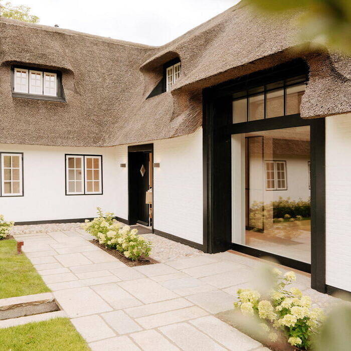 Insbesondere die Dörfer mit den reetgedeckten uthlandfriesischen Häusern mit ihrem typischen Zwerchgiebel entlang schmaler Straßen vermitteln ein authentisches Bild des früheren Sylts. Einem Ehepaar aus Nordrhein-Westfalen liegen diese historischen Friesenhäuser sehr am Herzen, sie haben in der Vergangenheit viele solcher, meist denkmalgeschützter Objekte auf Sylt mit originalen Materialien nach alten Vorlagen wiederherrichten lassen. Jetzt haben sie in Keitum einen Hof von 1746 für sich selbst liebevoll renoviert. Er besteht aus einem denkmalgeschützten Haupthaus und einem rechtwinklig angrenzenden Nebenhaus, das früher als Scheune genutzt wurde. Dieses hatte keinen Bestandsschutz, war mehrfach verändert worden und wurde neu errichtet. Ziel des Bauherrenpaars war es, den ursprünglichen Charakter des Hofes wieder zu beleben, Neu und Alt harmonisch miteinander zu verbinden. Dazu arbeiteten sie mit einheimischen Handwerksbetrieben zusammen, die mit alten Materialien und Techniken vertraut sind. Die komplette Interior-Planung, Aufbau und Fertigstellung wurde von Yomei aus Detmold ausgeführt.