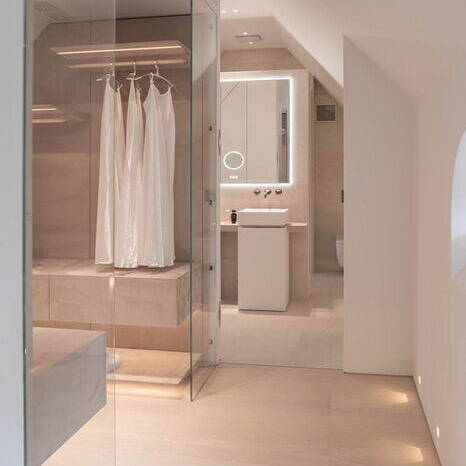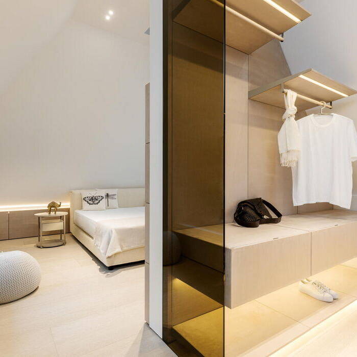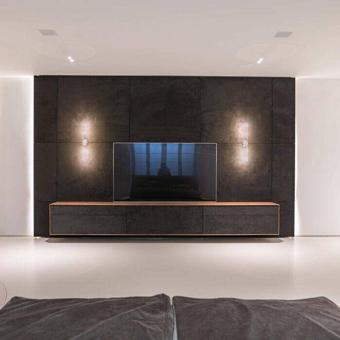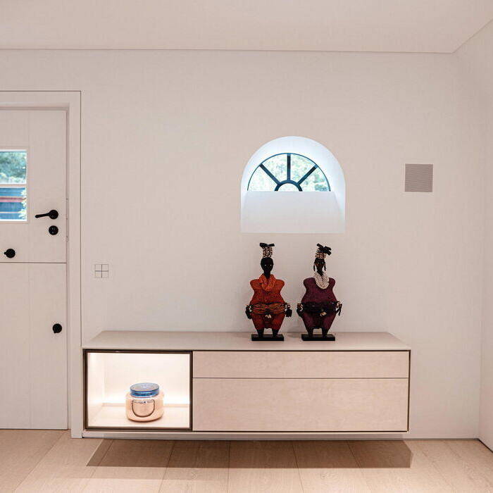 Die gesamte Innengestaltung lebt von den Einbauten und Lösungen von Yomei. Alles wurde perfekt auf die Räumlichkeiten abgestimmt, viele stimmige Funktionsdetails sind formal optimal eingebracht worden. Eine klare Linienführung, die deckenhohen, rahmenlosen Türen, der Verzicht auf Fußleisten und eine durchgängige Flächenbündigkeit in Kombination mit einer subtilen Farbgebung zeichnen die Gestaltung des Hauses aus. Aus der Symbiose von Funktion und Design entsteht eine zeitlose Eleganz.