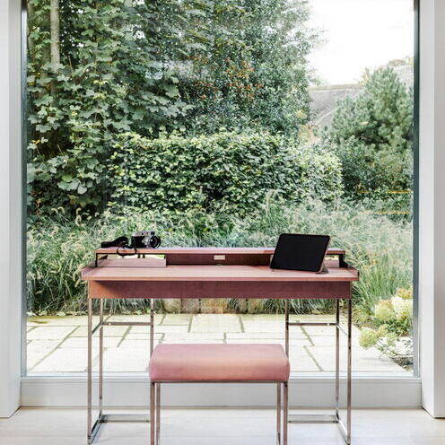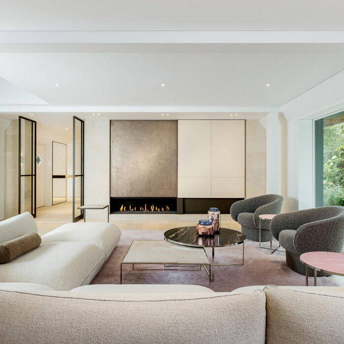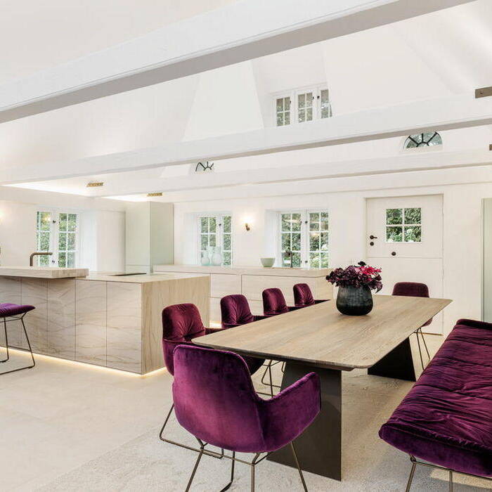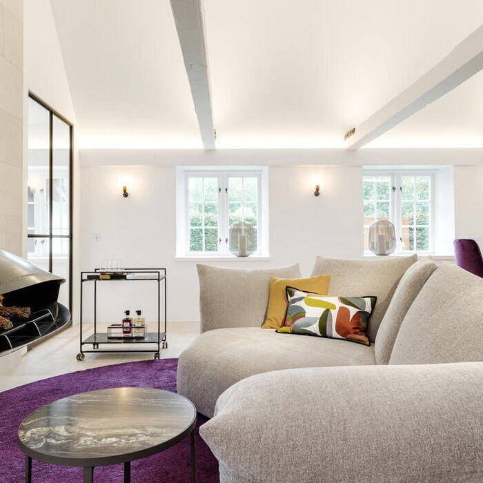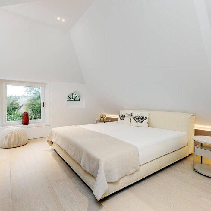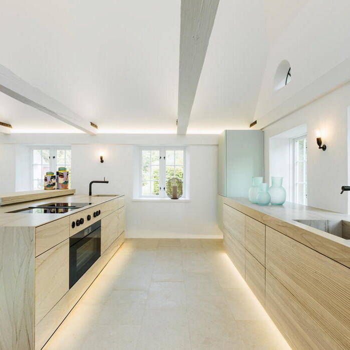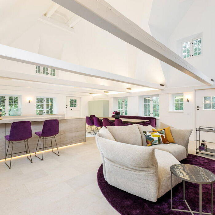 Im Schnittpunkt der beiden Gebäude liegt der Eingang, im Bestandshaus besticht der 70 m² große Koch- und Essbereich. Hochwertige Küchengeräte und Ausstattungsdetails erfüllen alle Wünsche. Einladende Sitzgelegenheiten ermöglichen unterschiedliche Nutzungen in kleiner oder großer Runde. Eine intime Sofainsel am freihängenden Kamin bildet ein besonderes Extra. Der gesamte Raum ist bis unter das Dach offen, die historischen Balken und die schiefen Wände prägen das Ambiente. Die doppelte Reihe der Sprossenfenster sorgt für Licht und erlaubt Ausblicke in das üppige Grün des Gartens. Im Neubau wird der 60 m² große Wohnbereich geprägt durch die beiden gegenüberliegenden, großflächigen Fensteröffnungen, eine Reminiszenz an die früheren Scheunentore. Sie lassen sich unsichtbar komplett öffnen. Das historische Friesenhaus war nicht unterkellert, im Neubau war dies aber möglich. Hier wurde der Wellnessbereich mit Indoorpool untergebracht. Im Obergeschoss des neuen Teils liegen die privaten Räume, Schlafzimmer, Ankleiden, Bäder – alles maßgeschneidert und auf die persönlichen Bedürfnisse abgestimmt.
