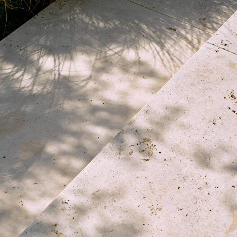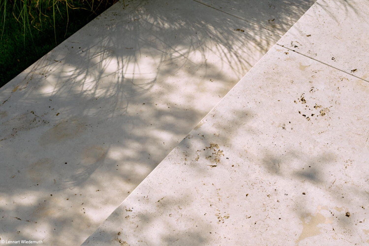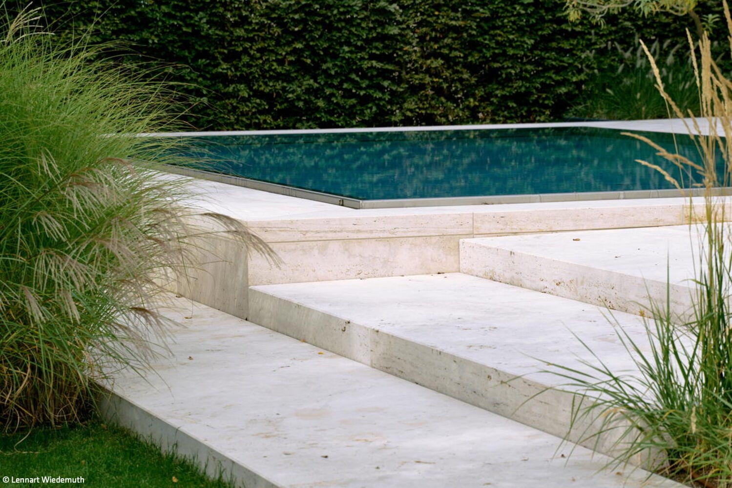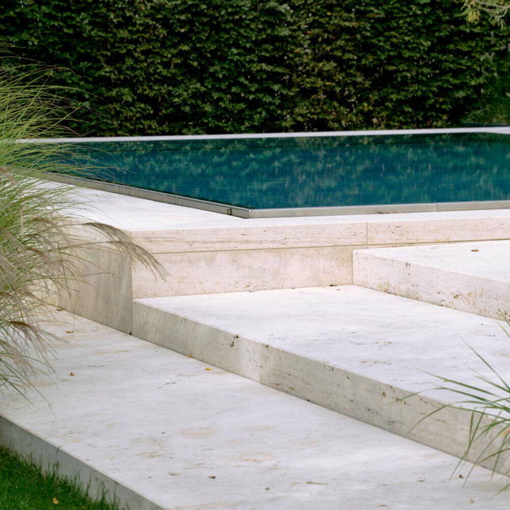 Es entstand ein präzise komponierter Außenraum, der Nutzung und Rückzug gleichermaßen ermöglicht. Bei den Bauherren entfaltet der Garten genau die gewünschte Wirkung: „Bei Sonnenschein dominiert der strahlend helle, fast weiß wirkende Travertin im kontrastreichen Zusammenspiel mit dem satten Grün der Ziergräser. Die Geometrie der Gartenanlage reflektiert dann eindrucksvoll die geradlinige Architektur des Hauses. In der Abenddämmerung übernehmen dann die über die Gartenbeleuchtung angestrahlten mehrstämmigen Gehölze im Zusammenspiel mit den Holzelementen der Fassade. Man fühlt sich warm und geborgen.“