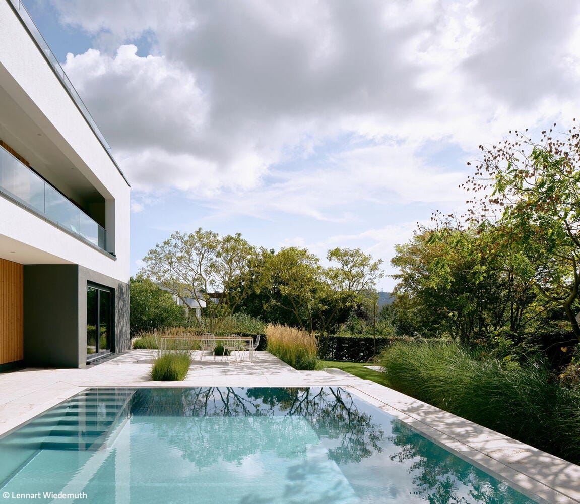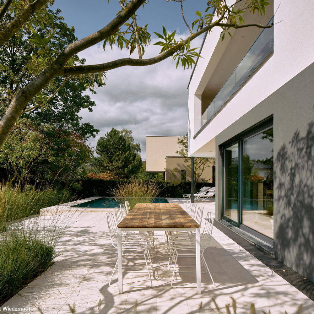 Eine sanfte Hanglage öffnet den Blick in die Landschaft, Weite und Ruhe liegen spürbar in der Luft. Als die Bauherren das Büro Wewer Landschaftsarchitektur mit der Planung ihres Privatgartens beauftragten, war die Architektur des Wohnhauses bereits definiert. Was noch fehlte, war das landschaftsarchitektonische Gegenüber. Früh kristallisierte sich eine klare Leitidee heraus: Es sollte ein Ort der Kontemplation entstehen, ein Garten, der Ruhe ausstrahlt und dennoch vielfältige Nutzungen zulässt, die zugleich auch den Außenraum strukturieren. Der große Tisch auf der Terrasse fungiert als Erweiterung des Wohnbereichs und als sozialer Mittelpunkt; Liegemöglichkeiten am Pool laden zum Rückzug ein, während kleine Leseinseln im Garten intime Momente abseits des Geschehens schaffen.