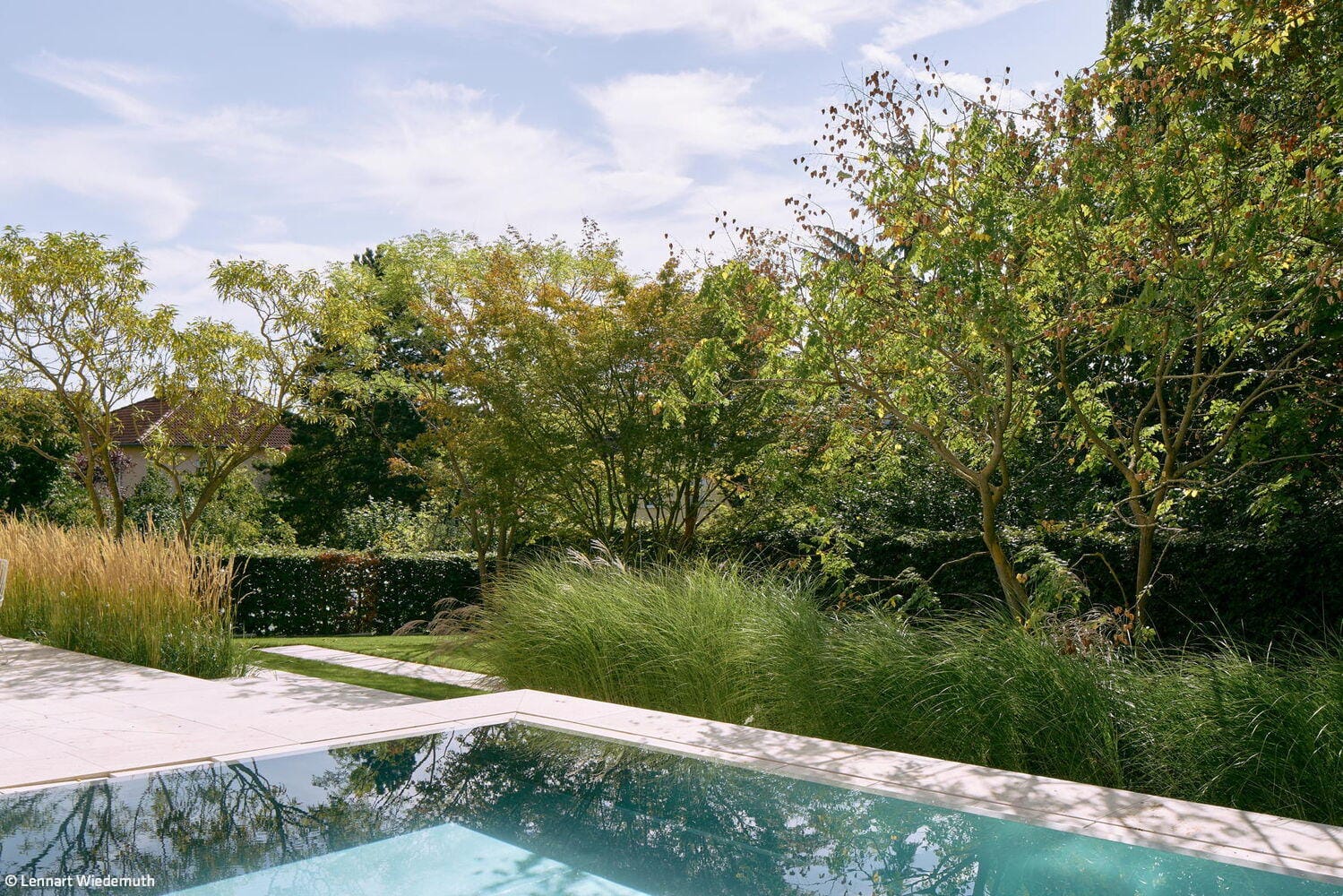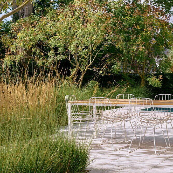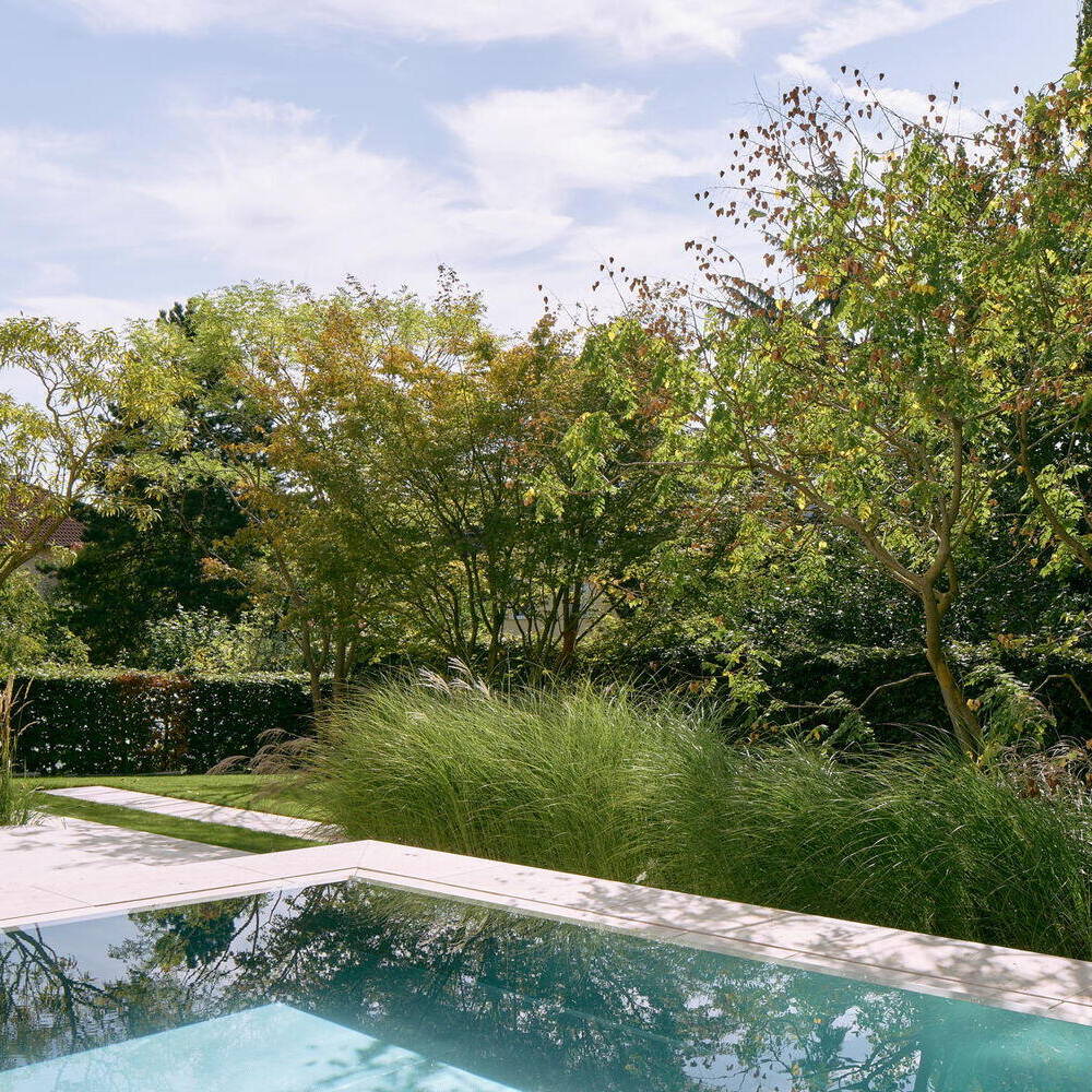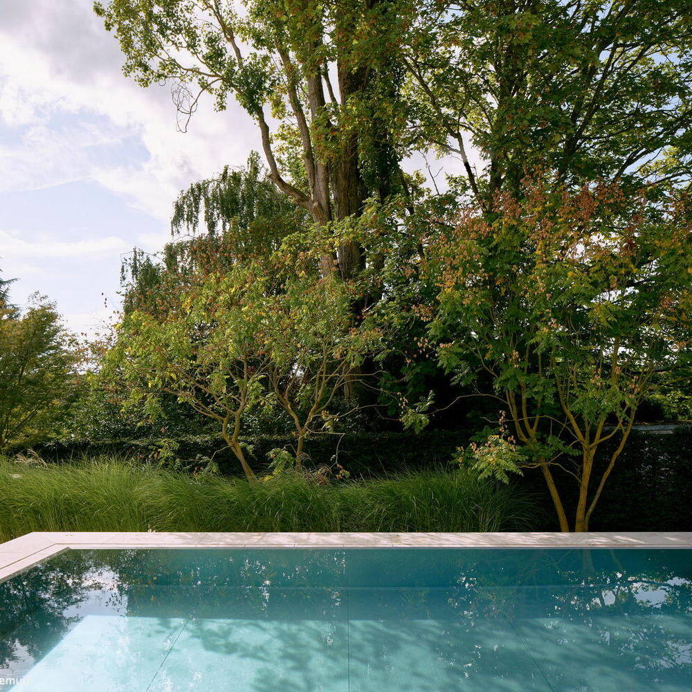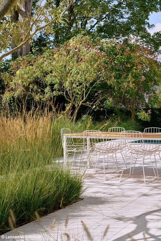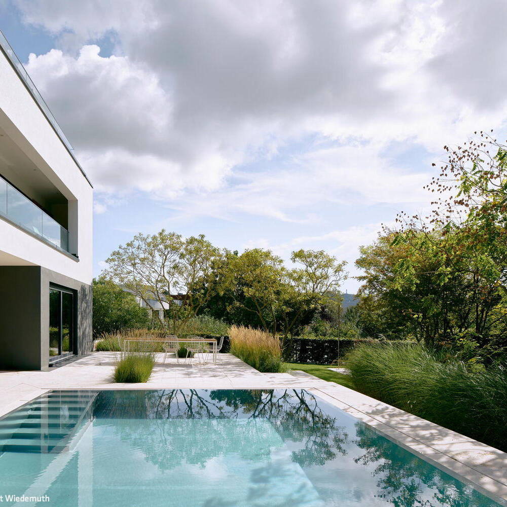 Die Landschaftsarchitekten mussten Offenheit und Geborgenheit in ein ausgewogenes Verhältnis bringen. Der ursprünglich vorgesehene Standort des Pools wurde im Zuge der Konzeptarbeit neu gedacht und schließlich so positioniert, dass er ein selbstverständlicher Teil der Gesamtkomposition wurde. Klare Geometrien ordnen den Garten, reduzierte Formen schenken ihm Ruhe, Architektur und Landschaftsplanung greifen ineinander. Hauptakteure sind durchaus etwas eigenwillige, knorrige, mitunter fast bizarre Bäume. Gräser ergänzen sie mit Leichtigkeit und Bewegung; Grün- und Weißtöne dominieren, im Vordergrund stehen Blattstrukturen, Kontraste und das Spiel im Wind. Auch das Licht folgt dieser zurückgenommenen Haltung.