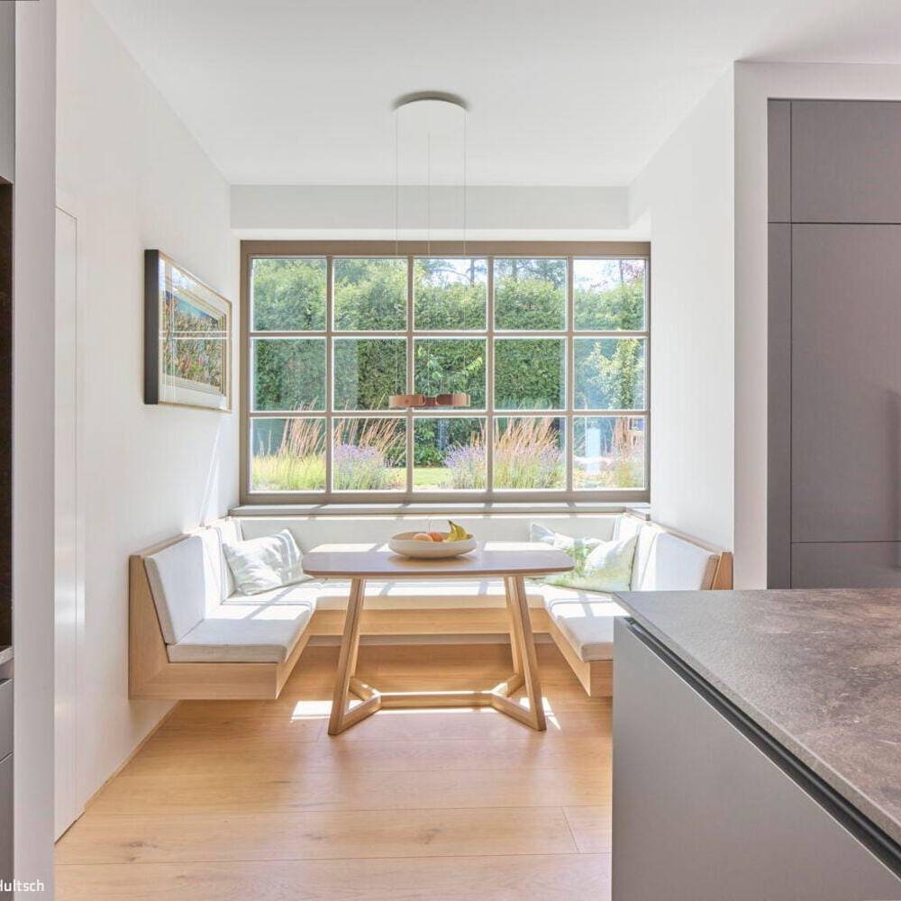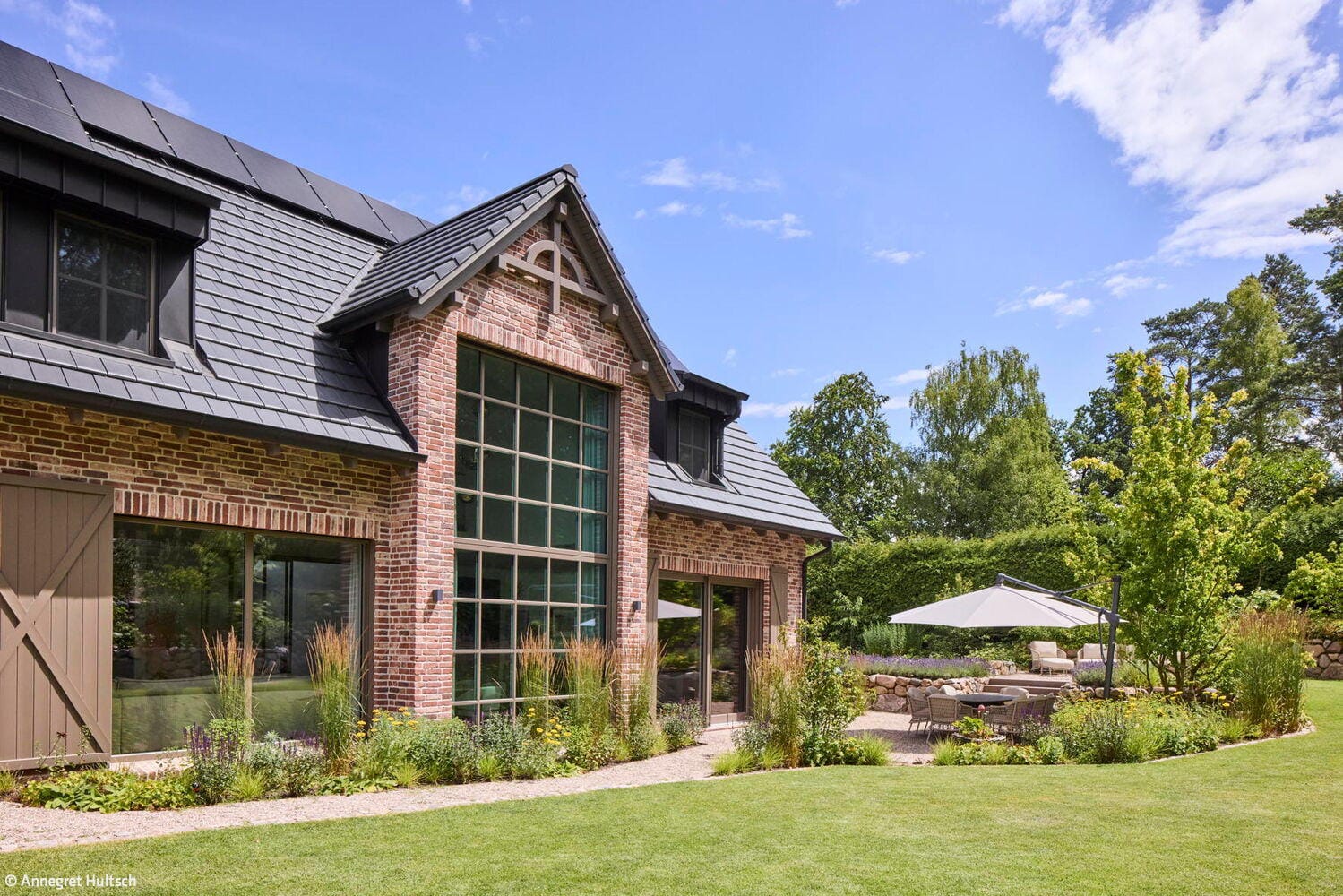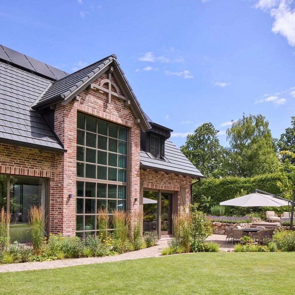 Das deutliche Gefälle des Grundstücks wurde gestalterisch aufgegriffen, indem der Wohnbereich um zwei Stufen angehoben wurde. Auf diese Weise entstand eine natürliche Gliederung in unterschiedliche Bereiche im Erdgeschoss. Auch der Garten wurde auf mehreren Ebenen terrassenartig angelegt. Den Landhauscharakter unterstreichen der traditionelle, kleinformatige Verblendstein sowie die markanten Schlagtüren, die an historische Scheunentore erinnern. So fügt sich das Haus harmonisch in die ländliche Umgebung ein und überzeugt innen durch den modernen, großzügigen Grundriss, der zeitgemäßes Wohnen mit behaglicher Atmosphäre verbindet. Zusätzlich verfügt das Haus über einen Wellnessbereich mit Sauna, eine Tiefgarage und moderne Haustechnik.