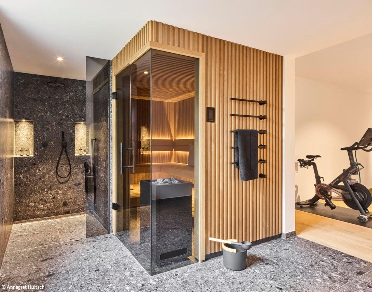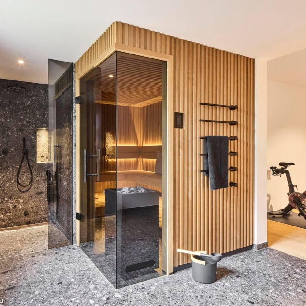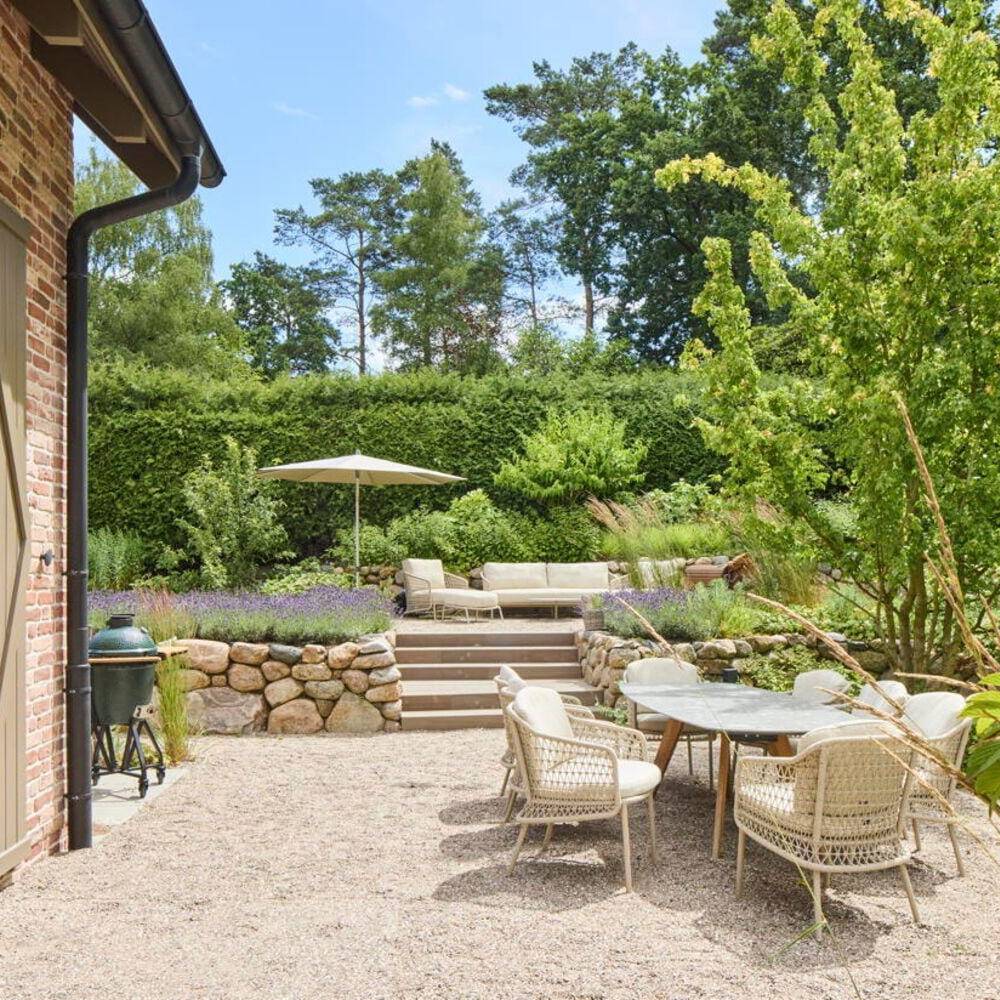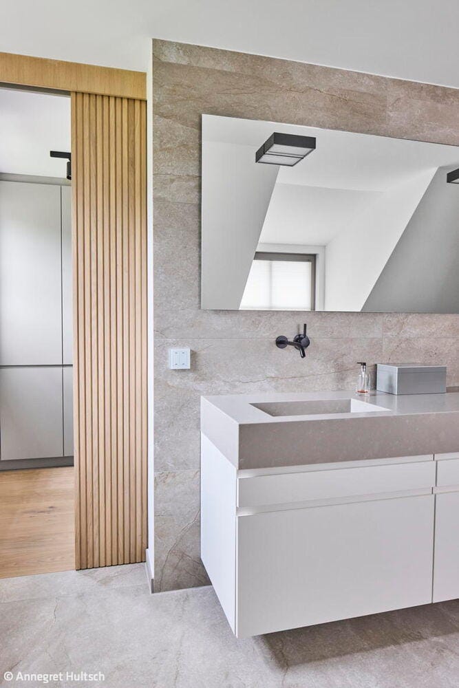 Das deutliche Gefälle des Grundstücks wurde gestalterisch aufgegriffen, indem der Wohnbereich um zwei Stufen angehoben wurde. Auf diese Weise entstand eine natürliche Gliederung in unterschiedliche Bereiche im Erdgeschoss. Auch der Garten wurde auf mehreren Ebenen terrassenartig angelegt. Den Landhauscharakter unterstreichen der traditionelle, kleinformatige Verblendstein sowie die markanten Schlagtüren, die an historische Scheunentore erinnern. So fügt sich das Haus harmonisch in die ländliche Umgebung ein und überzeugt innen durch den modernen, großzügigen Grundriss, der zeitgemäßes Wohnen mit behaglicher Atmosphäre verbindet. Zusätzlich verfügt das Haus über einen Wellnessbereich mit Sauna, eine Tiefgarage und moderne Haustechnik.