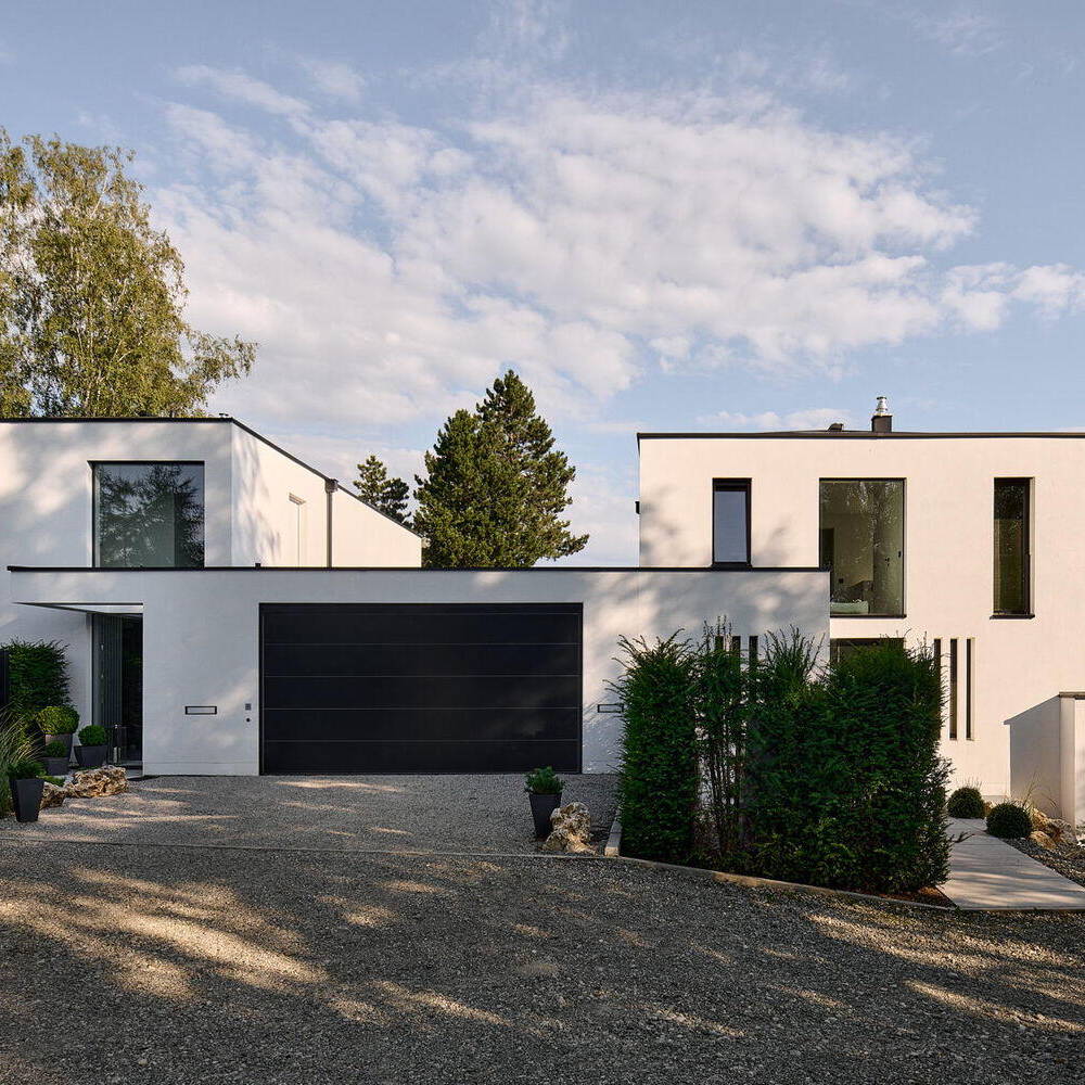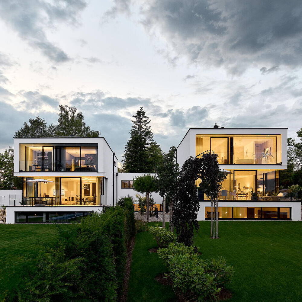 Die Bauherren wünschten sich ein Wohnensemble mit zwei separaten Wohneinheiten, das nicht den Eindruck eines Doppelhauses erweckt, sondern wie zwei eigenständige Einfamilienhäuser anmutet. Gleichzeitig musste das Bauvorhaben laut Bebauungsplan von der Straßenseite als geschlossene Einheit wahrgenommen werden. Um diesen scheinbaren Widerspruch zu lösen, wurde eine der beiden Doppelgaragen zentral zwischen den Wohnhäusern positioniert. Dadurch entstand auf der Gartenseite ein Innenhof, der die Wohneinheiten klar trennt, während sich die Gebäude auf der Straßenseite zusammen mit den Garagen zu einer harmonischen Gesamtstruktur verbinden. Ein markantes gestalterisches Merkmal ist die skulpturale Form der Gebäude, die sich nahtlos in das Gelände einfügt. Die Hanglage wurde genutzt, um das Untergeschoss im südlichen Bereich natürlich zu belichten, wodurch die Architektur eine unverwechselbare Dynamik erhält und so an eine doppelte liegende „Sphinx” erinnert, beschreibt der Architekt Tobias Schmidt von WSM Architekten seinen Entwurf. Die innenseitigen Fassaden sind geschlossener gestaltet, um gegenseitige Einblicke zu minimieren, während sich die Seiten- und Frontfassaden großzügig zur Natur öffnen. Die Obergeschosse bieten durch große Fenster einen malerischen Blick auf den Starnberger See. Um den gewünschten Eindruck eines Flachdachs zu erzeugen, obwohl der Bebauungsplan nur Sattel- oder Zeltdächer erlaubte, wurde ein besonders flach geneigtes, nach innen versetztes Zeltdach mit Attika entwickelt. Die Bauweise basiert auf hoch wärmedämmenden Massivziegeln, die in Kombination mit zwei Luft-Wasser-Wärmepumpen eine hohe Energieeffizienz gewährleisten und den KfW-40-Standard erfüllen, den Energieverbrauch minimieren und einen umweltfreundlichen Betrieb ermöglichen. Das auskragende Dachgeschoss dient als passiver Sonnenschutz, indem es in den Sommermonaten direkte Einstrahlung reduziert und so eine Überhitzung der Wohnräume verhindert, während die großzügigen Glasflächen lichtdurchflutete Räume schaffen. Die vorstehende Sockelzone am Hang ermöglicht einen ebenerdigen Zugang zu den Wohnräumen im ebenfalls gut mit Tageslicht versorgten Untergeschoss.