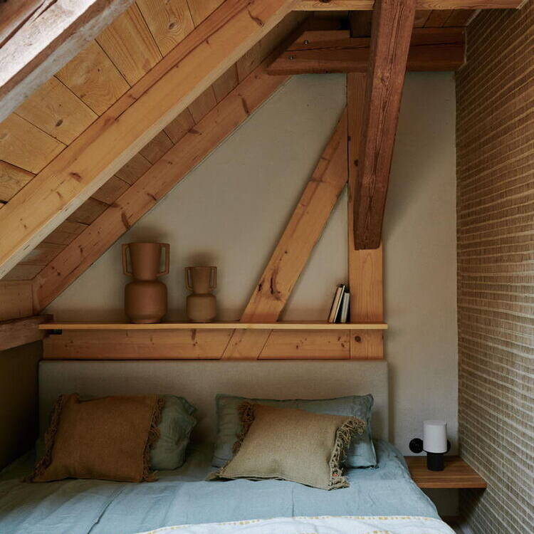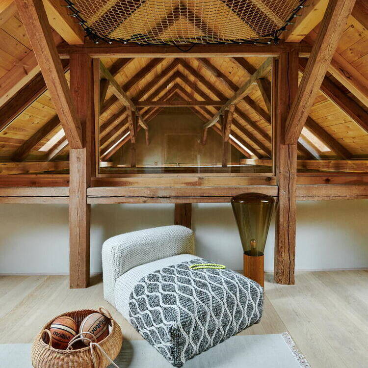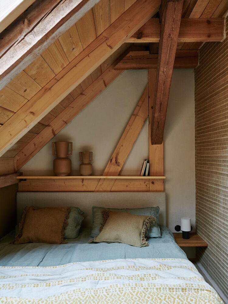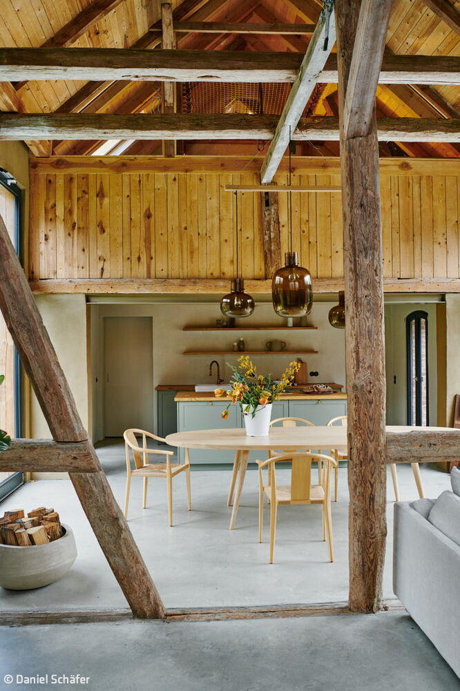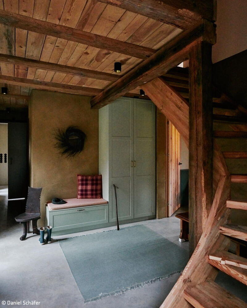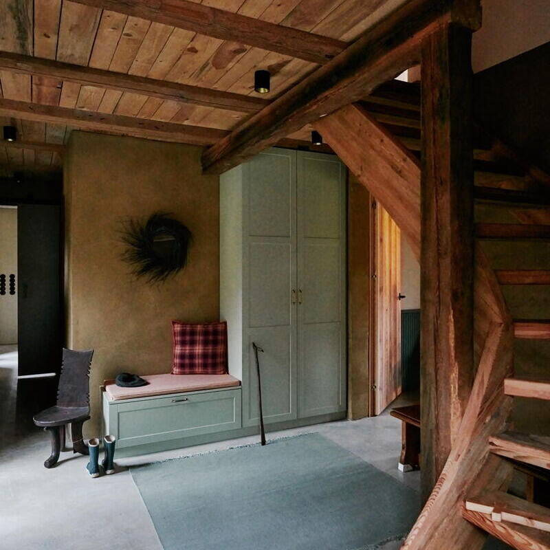 Die baulichen Eingriffe umfassen die Freilegung der Scheune bis auf die sichtbare Holz- und Balkenstruktur sowie den Einbau einer zweiten Ebene, die zwei Drittel des Grundrisses belegt und als Schlafraum und Rückzugsort dient. Charlotte Wiessner, Gründerin von Carlo-Berlin, holte für ihren Umbau mit der Baubiologin und Bauphysikerin Elke Wulf Fachkräfte an Bord, die dabei behilflich waren, den traditionellen Charakter, seine Ursprünglichkeit und Naturverbundenheit nicht nur zu bewahren, sondern deutlich zu stärken. Gemeinsam mit ihrem Team gewann Charlotte Wiesner Einsichten in das Schaffen eines gesunden Raumklimas auf Basis natürlicher Baustoffe. Verarbeitet wurden ausschließlich Holz, Stein und Lehm. An den Innenwänden sorgt Lehmputz mit dahinter liegender Dämmung für eine nachhaltige Atmosphäre. In Verbindung mit dem alten Gebälk, seinen Maserungen und Spuren der Zeit entsteht so ein authentisches Wohngefühl. Für zusätzliche Elemente, wie neue Holzteile, kamen „seawashed“ Hölzer zum Einsatz – vom Meer ausgewaschen und ausgebleicht – die sich optisch dem Bestand anpassen. Hieraus wurden beispielsweise Treppen und auch Möbel gefertigt.