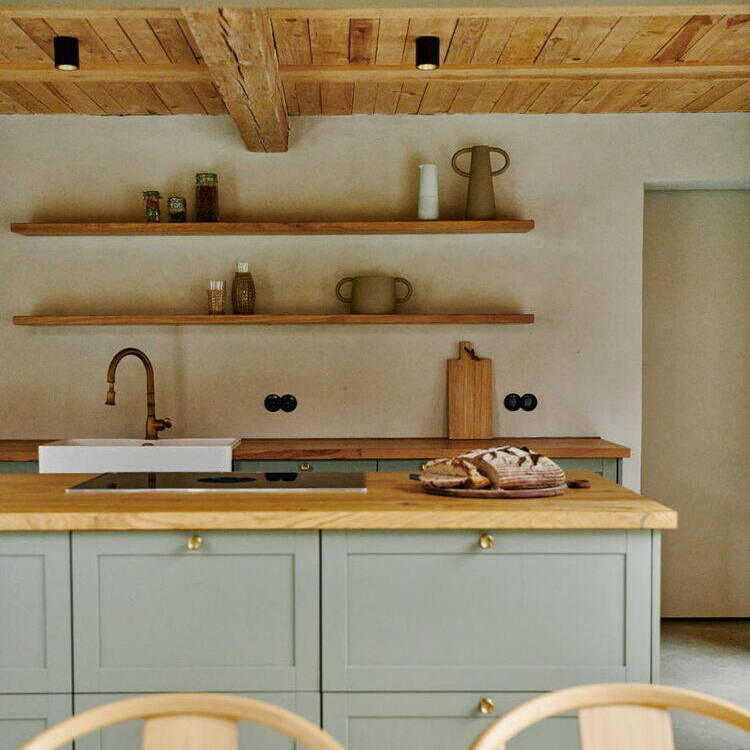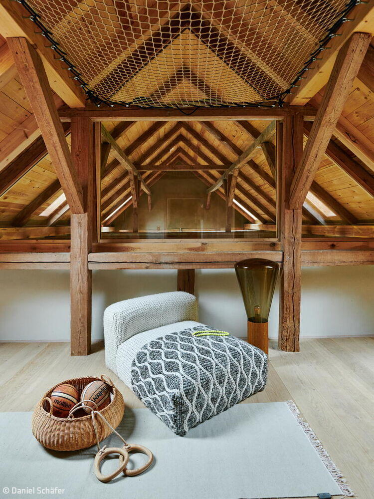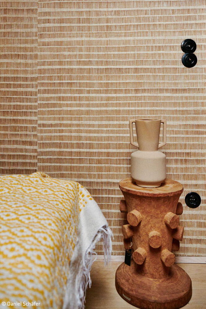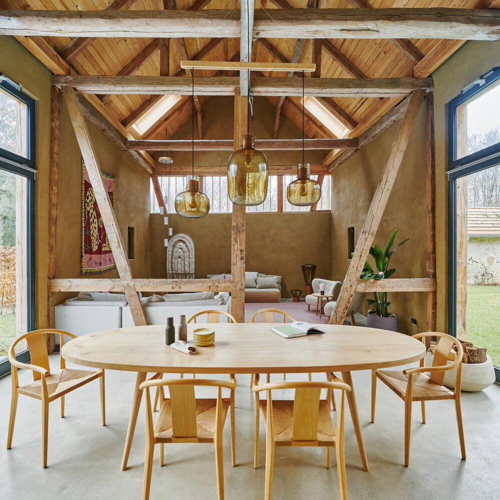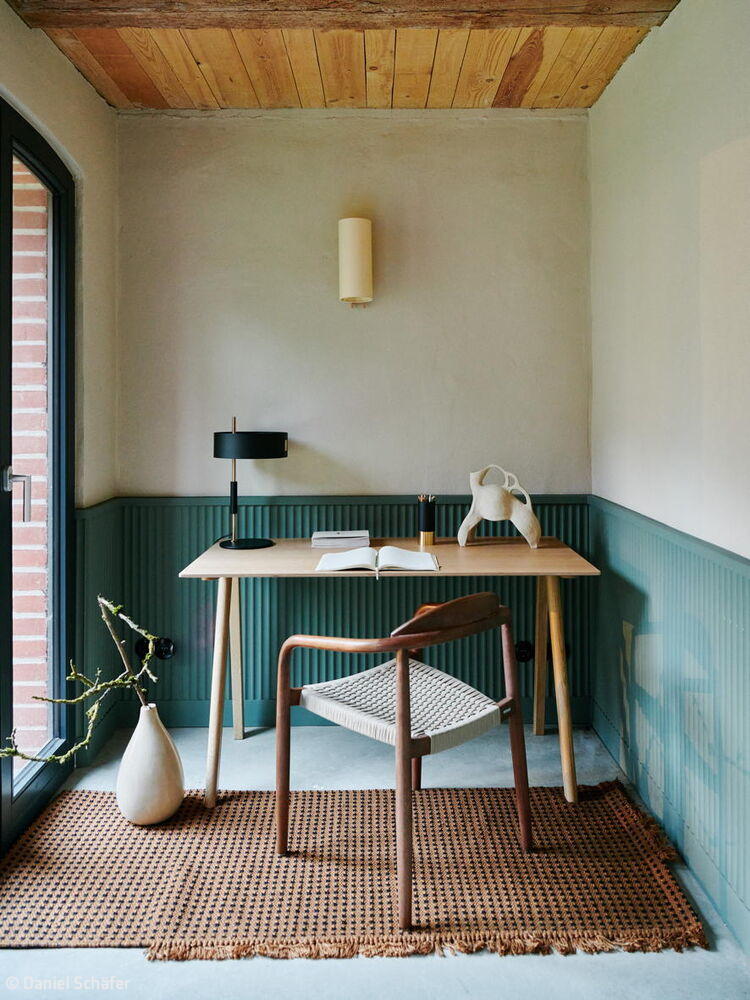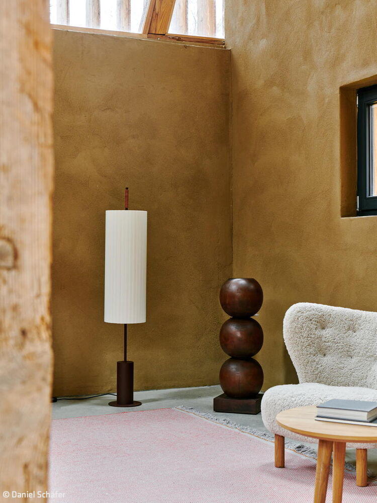 Die baulichen Eingriffe umfassen die Freilegung der Scheune bis auf die sichtbare Holz- und Balkenstruktur sowie den Einbau einer zweiten Ebene, die zwei Drittel des Grundrisses belegt und als Schlafraum und Rückzugsort dient. Charlotte Wiessner, Gründerin von Carlo-Berlin, holte für ihren Umbau mit der Baubiologin und Bauphysikerin Elke Wulf Fachkräfte an Bord, die dabei behilflich waren, den traditionellen Charakter, seine Ursprünglichkeit und Naturverbundenheit nicht nur zu bewahren, sondern deutlich zu stärken. Gemeinsam mit ihrem Team gewann Charlotte Wiesner Einsichten in das Schaffen eines gesunden Raumklimas auf Basis natürlicher Baustoffe. Verarbeitet wurden ausschließlich Holz, Stein und Lehm. An den Innenwänden sorgt Lehmputz mit dahinter liegender Dämmung für eine nachhaltige Atmosphäre. In Verbindung mit dem alten Gebälk, seinen Maserungen und Spuren der Zeit entsteht so ein authentisches Wohngefühl. Für zusätzliche Elemente, wie neue Holzteile, kamen „seawashed“ Hölzer zum Einsatz – vom Meer ausgewaschen und ausgebleicht – die sich optisch dem Bestand anpassen. Hieraus wurden beispielsweise Treppen und auch Möbel gefertigt.