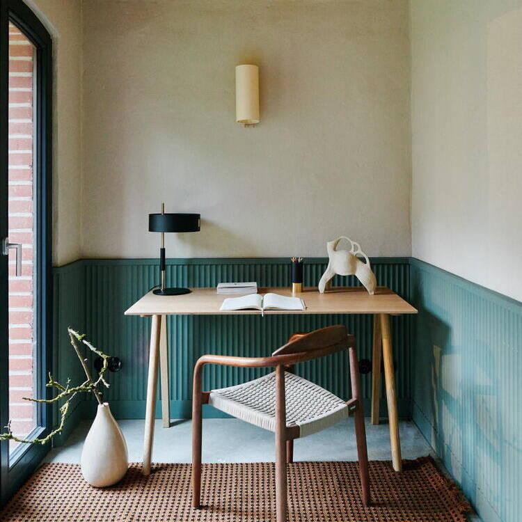 Das gesamte Farbkonzept orientiert sich an den von der Natur vorgegebenen pastelligen Tönen. So sind auch die Braun- und Gelbtöne der mundgeblasenen Leuchten ein Zitat der Natur. Die Längsseiten wurden mit bodentiefen Glasfronten in Stahlrahmen ausgestattet. Auch im oberen Geschoss sorgen Fensterbänder und Oberlichter im Dach für Tageslicht im Innern. Der offene Grundriss im Erdgeschoss bietet Raum für eine Küchenzeile, ein Esszimmer und eine durch tragende Holzbalken gegliederte Wohnlandschaft zum Entspannen und zum Erholen – ein Wohlfühlort par excellence.