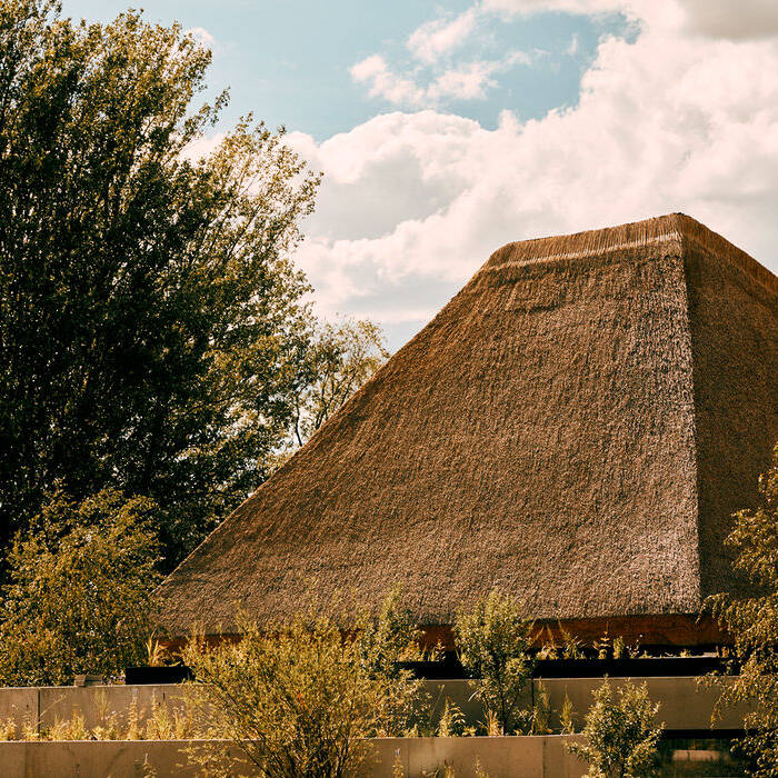 So ein Bauwerk würde man in der industriell geprägten Region an der Rummelsburger Bucht nicht vermuten. Der neue Flussbad-Campus beginnt sich zum Kultort zu entwickeln, besonders seit dort ein unter einem Reetdach verstecktes Gebäude – das „Reethaus“ – am Wasser steht. Es besitzt eine Dachform, die man in Schleswig Holstein, aber nicht in Berlin vermuten würde. Das Reethaus entwickelt sich rund um einen zentralen Veranstaltungsraum, der zwar „Ritualraum“ genannt wird, in dem aber durchaus weltliche Veranstaltungen wie musikalische Darbietungen oder Performances stattfinden. Erdacht und entworfen wurde der untypische Berliner Neubau von der Tiroler Architektin Monika Gogl, die für dieses Gebäude und vor allem für den Innenraum den begehrten „Ahead Europe Award“ erhielt. Wie kommt man auf so einen kühnen Entwurf und zu dem Mut, ihn für Berlin zu entwickeln? Monika Gogl wuchs in den Tiroler Bergen auf, und wenn Sie ab und zu ihre Großeltern in Bad Gastein besuchte, empfand sie tiefe Bewunderung für das dortige Bergbad des Architekten Gerhard Gerstenauer. Dadurch, schildert sie, habe sie früh die Verbundenheit von Natur und Architektur gespürt und sie fühle sich bis heute dieser reziproken Spannung verbunden. Die bevorzugten Baustoffe Gogls sind naturnahe Materialien wie Beton, Holz, Stein und eben auch Schilf wie hier. Monika Gogl hat es tatsächlich geschafft, den letzten in Berlin lebenden Handwerker zu finden, der diese Technik noch beherrscht. Trotz des geschlossenen Äusseren, das einer Pyramide mit gekappter Spitze gleicht, ist das Reethaus eine offene Institution. Vom Eingang, einer sanft ansteigenden Rampe, gelangt man zunächst in ein Foyer, das den im Zentrum liegenden „Ritualraum“ umgibt und sich im Südwesten zu einer Terrasse öffnet. An den Seiten liegen Arbeits- und Besprechungsräume und im hinteren Bereich sind die Nutzräume –Küche, Büros sowie Sanitärräume untergebracht. Zum Wasser hin gibt es einen Innenhof, einen Lichthof und eine Lounge zum Verweilen. Das Haus wirkt wie ein spiritueller Meditationsort. Durch das aus Stroh gefertigte Dach entsteht der Eindruck von Abgeschiedenheit und Stille, daher nennt die Architektin es einen modernen Tempel. Monika Gogl hat ein breites Spektrum an Genres vorzuweisen, das Reethaus ist jedoch unter ihren Wohnhäusern, Retails, Hotels und Bars, Gewerbe & Industriebauten ein ganz besonderer Bau. Das Schaffen der Architektin steht für ungewöhnliche Entwürfe – wie im Fall des Reethauses, diesem sympathischen „Alien“ im Berliner Häuserwald.