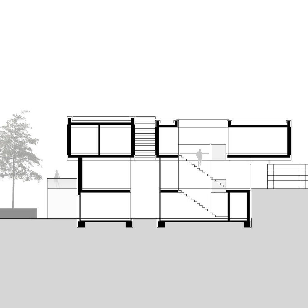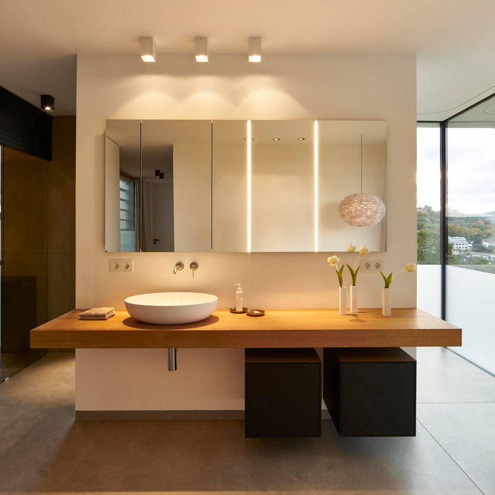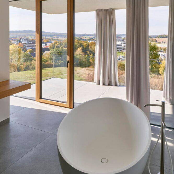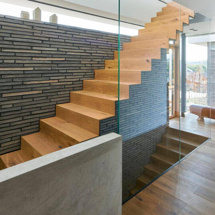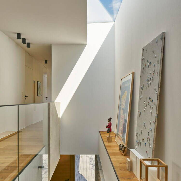 Die Raumorganisation folgt dem Alltag der Bewohner:innen. Das Erdgeschoss öffnet sich über einen offenen Grundriss für Kochen, Essen und Wohnen – immer den Blick auf die Landschaft gerichtet. Drei Kinderzimmer samt eigenem Bad, Spielbereich und einem Elterntrakt mit Sauna und Wellnesszone sind im Obergeschoss verortet. Die behutsam gelenkte Blickführung schenkt nicht nur immer wieder unverbaubare Blicke, sondern schützt auch die Privatsphäre der Familie: So sind raumhohe Fenster vor der freistehenden Badewanne ebenso möglich wie ein Panoramablick durch die Glasfront der Sauna. Im Untergeschoss finden zwei Homeoffices Platz, verbunden durch einen hellen Tiefhof, der natürliches Licht tief ins Gebäude bringt. Ein offener Treppenraum mit handwerklich gefertigter Faltwerktreppe aus Rohstahl und Eichenbelag wird von einem schmalen, scheinbar bündig zur Außenwand abschließenden Oberlichtband gekrönt. Gemeinsam mit dem Tiefhof und großen Fensterfronten sorgt er für lichtdurchflutete Räume, auch in den hangseitigen Fluren des Erd- und Untergeschosses, sowie abwechslungsreiche Sichtbeziehungen.