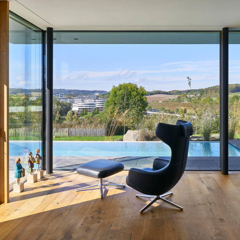 Das Grundstück, ein langgezogenes Areal am Rand eines Neubaugebiets, verlangte aufgrund seiner Hanglage, seiner schmalen Zufahrt und dem offenen Landschaftsbezug eine sensible Planung. Die Idee des Architekten: die Masse gliedern, Leichtigkeit schaffen und die Natur fokussieren. So entstand das Wohnhaus mit drei ineinander verschachtelten Baukörpern. Deren Staffelung folgt nicht nur der Topografie, sondern ordnet auch die Funktionen klar: Büro und Service im Hanggeschoss, Leben und Begegnung im Erdgeschoss, Rückzug und Privatheit im Obergeschoss. Stahlstützen tragen das weit auskragende Obergeschoss, eine Glasfuge trennt die Ebenen visuell und strukturell. Dadurch ruht das schwerste Volumen scheinbar schwerelos über dem Sockel.