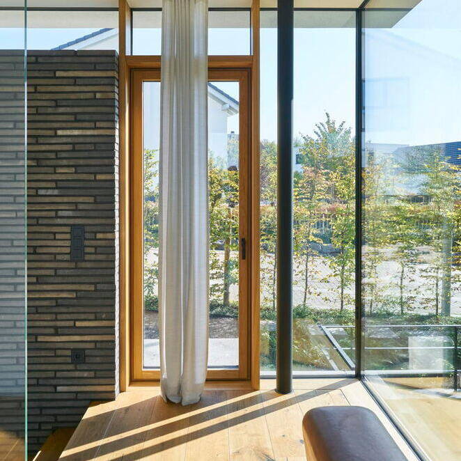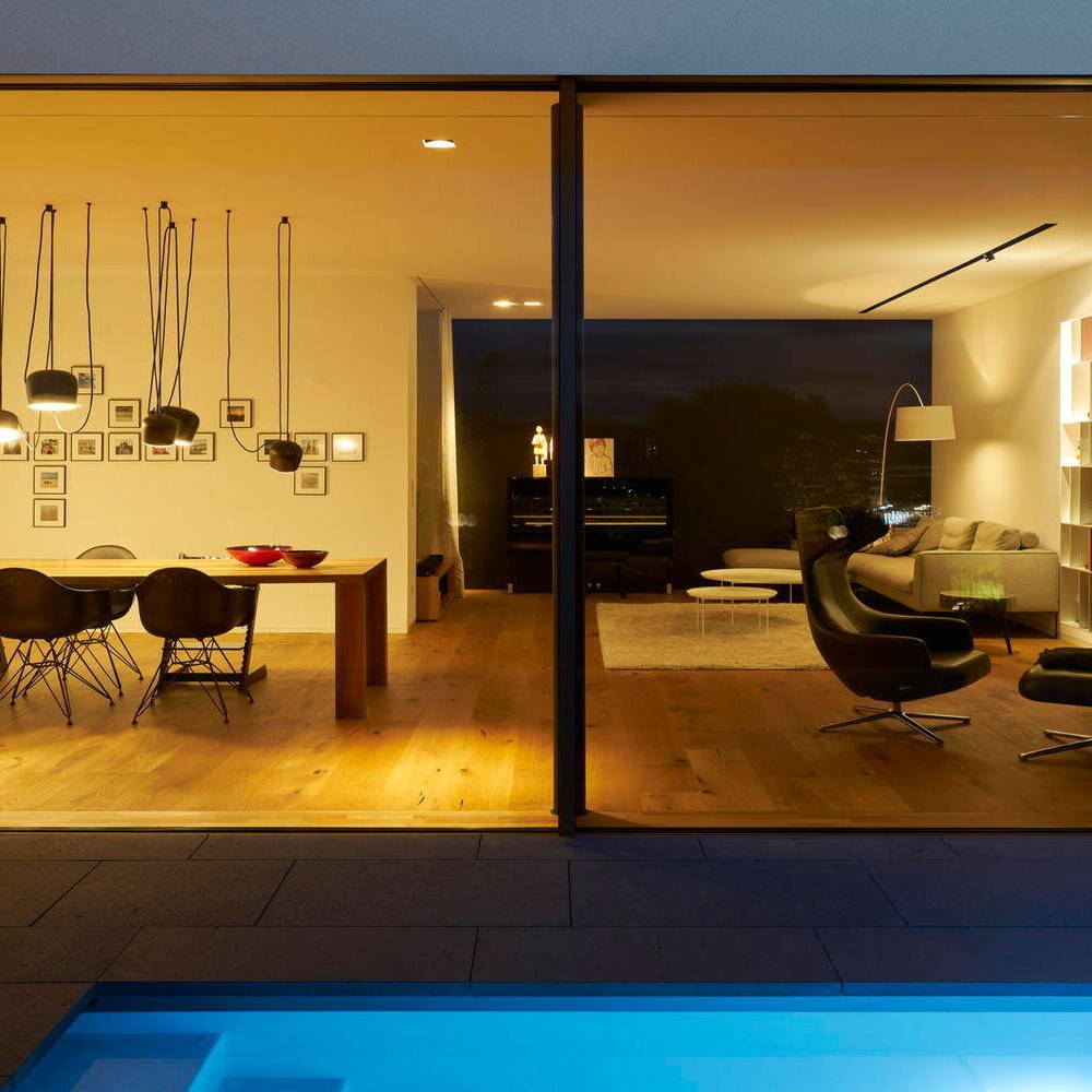Der Garten wurde über das angrenzende Wiesengrundstück als Übergang in die Natur formuliert. Sogar für die Zukunft wurde vorgesorgt: Das Hanggeschoss lässt sich später bei Bedarf als eine eigene Einheit abtrennen. Materialität ist bei dem neuen Familiendomizil keine Staffage, sondern Haltung. Handgeformter Klinker, naturbelassene Eichendielen, Sichtbeton im Bürobereich, roh geölter Stahl für Treppen und Verkleidungen – alles ist spürbar echt. Selbst die Aluminiumfenster und -fassade bleiben durch Eloxierung statt Pulverbeschichtung metallisch lebendig. Der helle Kratzputz des Obergeschosses ist unbehandelt und bietet zusätzlich einen Selbstreinigungseffekt. Eine Erdsonden-Wärmepumpe, eine Lüftungsanlage mit Wärmerückrückgewinnung und eine 25 kWp-Photovoltaikanlage sorgen für eine nachhaltige Energieversorgung – auch bei dem in den Hang integrierten Pool. Eine logische Konsequenz der energieeffizienten Planung.