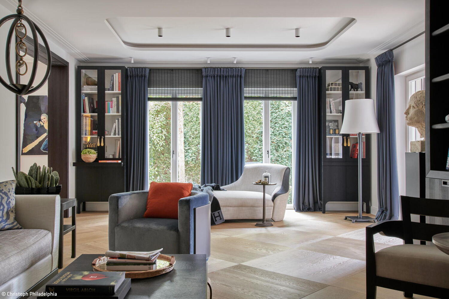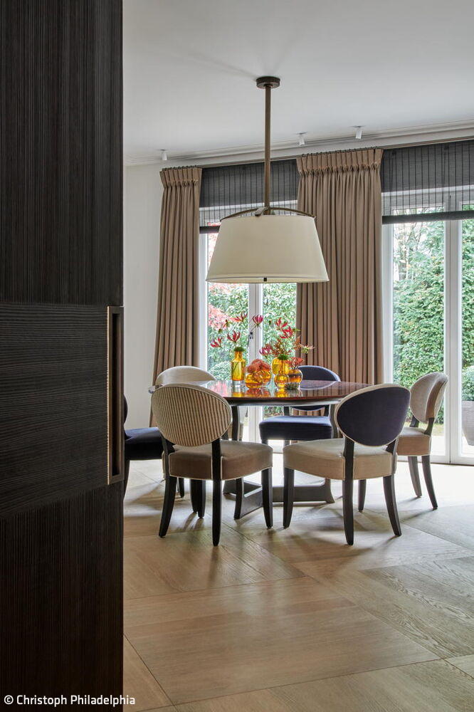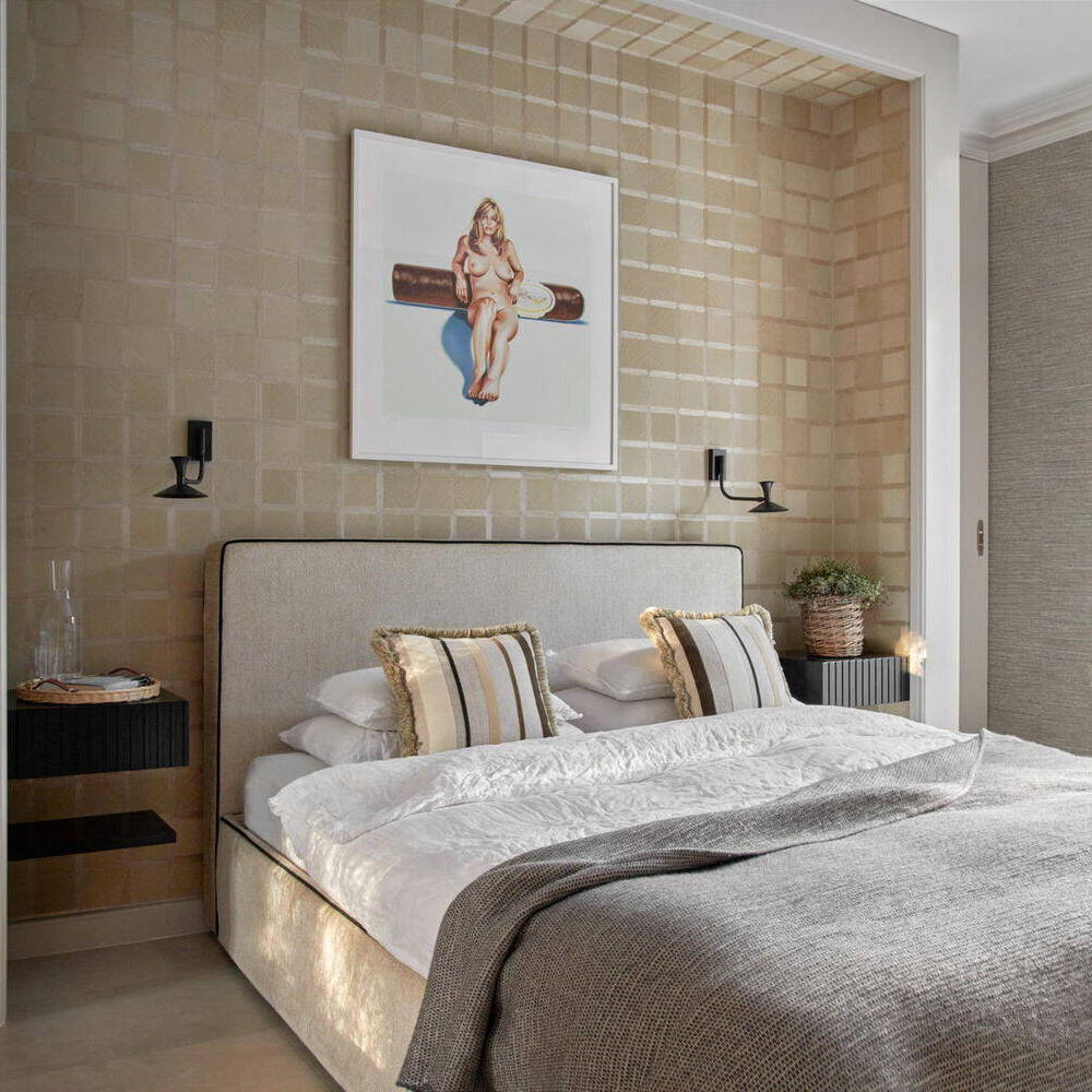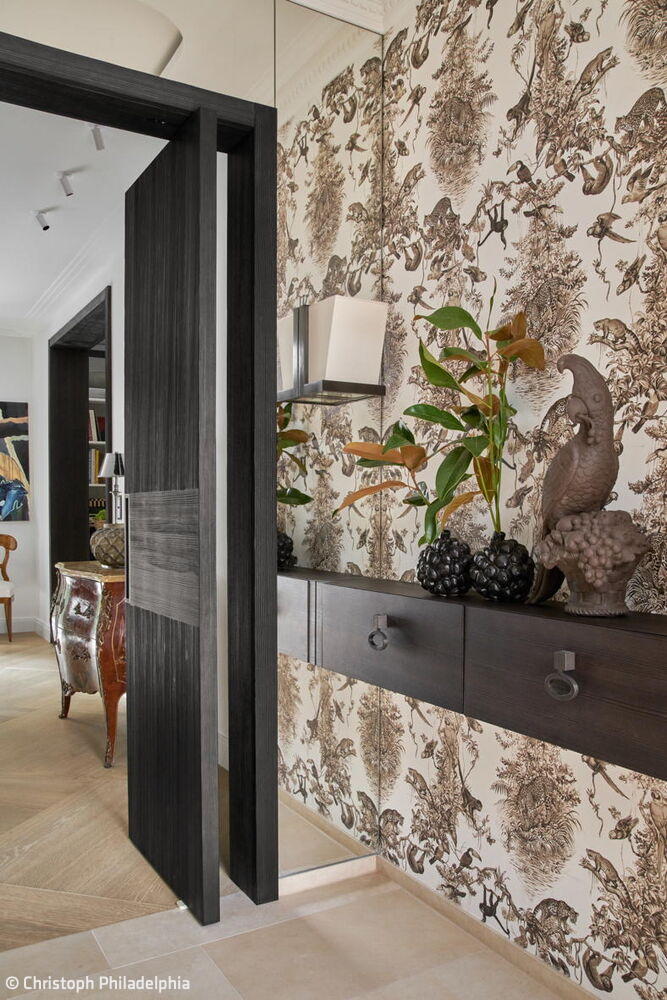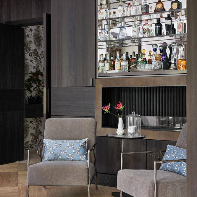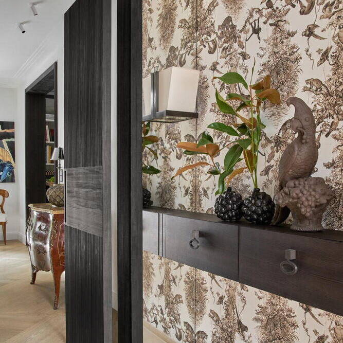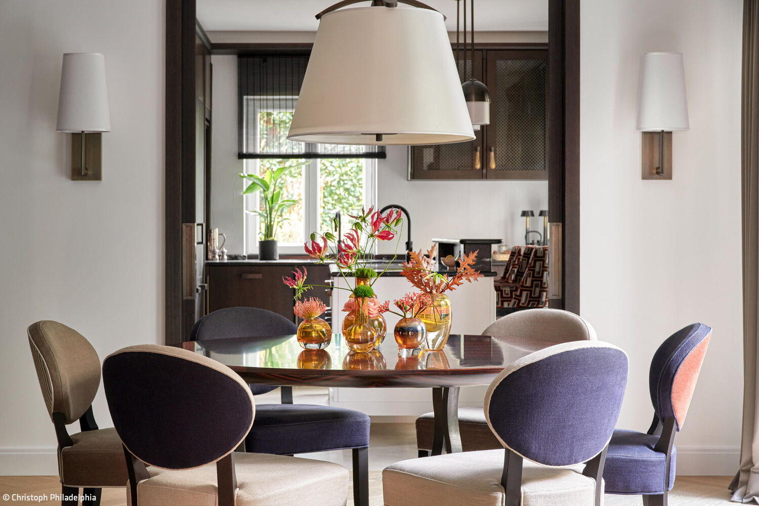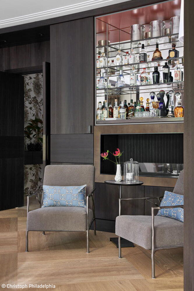 Die besondere Atmosphäre entsteht durch eine fein abgestimmte Tonalität natürlicher Farben, die warm und erdig wirken. Sand-, Taupe- und Beigetöne bilden die ruhige Basis. Akzentuierende Farben wie tiefes Nachtblau, Anthrazit und punktuell gesetztes Terrakotta erzeugen feine Kontraste. Warme, natürliche Materialien wie gebürstetes Tannenholz und ein aufwendig verlegtes Eichenparkett im dezenten Schachbrettmuster verleihen den Räumen eine ruhige, zugleich einladende Grundstimmung. Durch gezielte Hell-Dunkel-Kontraste entfalten sich Spannung und visuelle Tiefe. Für textile Wärme sorgen edle italienische Stoffe – fließend, weich und bewusst kontrastierend eingesetzt. Das Interieur wird durch Ledertapeten ergänzt, deren samtige Oberfläche eine unvergleichliche Haptik bietet. Handgefertigte Murano-Beschläge und Bronzegriffe verleihen dem Apartment subtile Eleganz – jeder Griff und jedes Finish wirken einzigartig und künstlerisch. Ein weiteres Merkmal des Apartments ist sein kuratierter Charakter: Antiquitäten und ausgewählte Fundstücke aus Paris fügen dem modernen Kontext eine erzählerische Tiefe und einen Hauch Bohème hinzu. So entstand kein reines Wohnobjekt, sondern ein lebendiger Lebensraum. „Für mich ist es die perfekte Verbindung aus urbanem Leben und privatem Rückzug“, beschreibt der Bauherr sein neues Domizil. In dem auch Gäste gerne willkommen sind: Der einladende Essbereich mit rundem Tisch und stimmungsvoller Statement-Leuchte sowie die elegante Küche mit einem großen Counter und Bartresen aus dunklem Naturstein laden zum Verweilen, Kochen und geselligen Beisammensein ein.