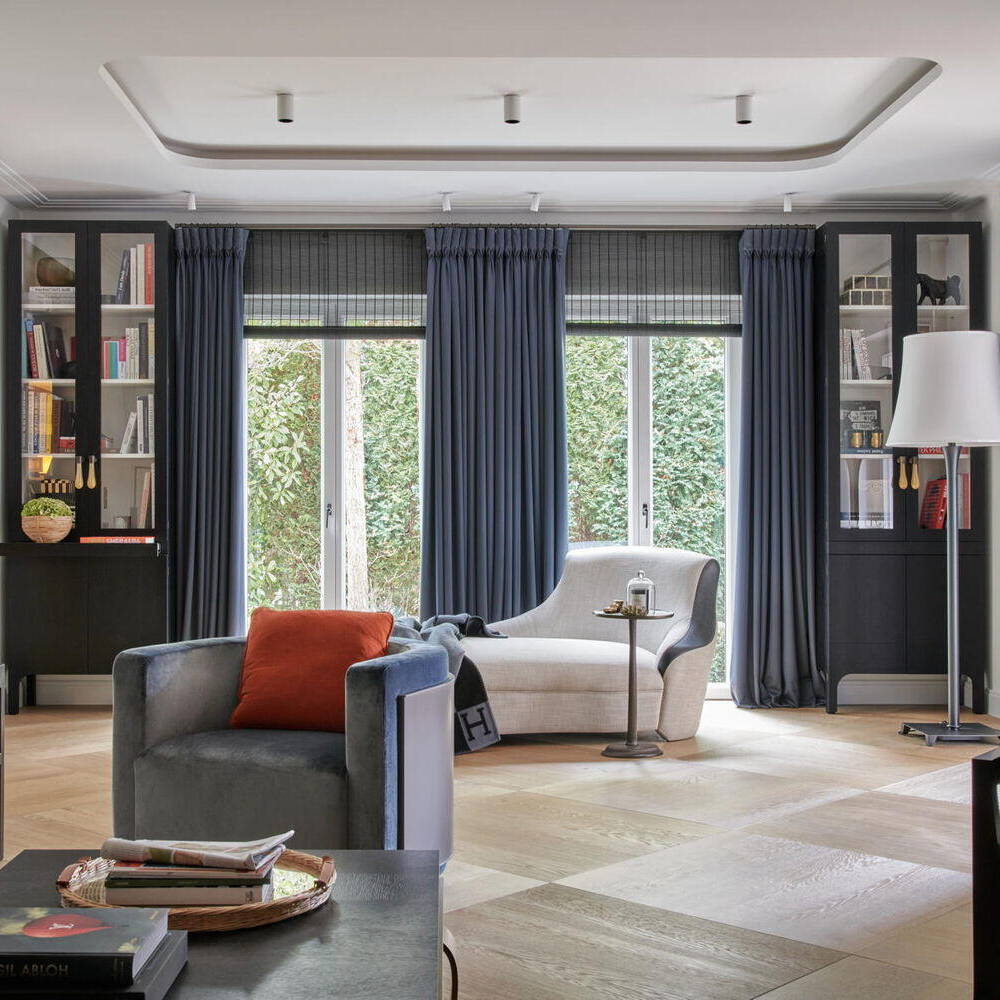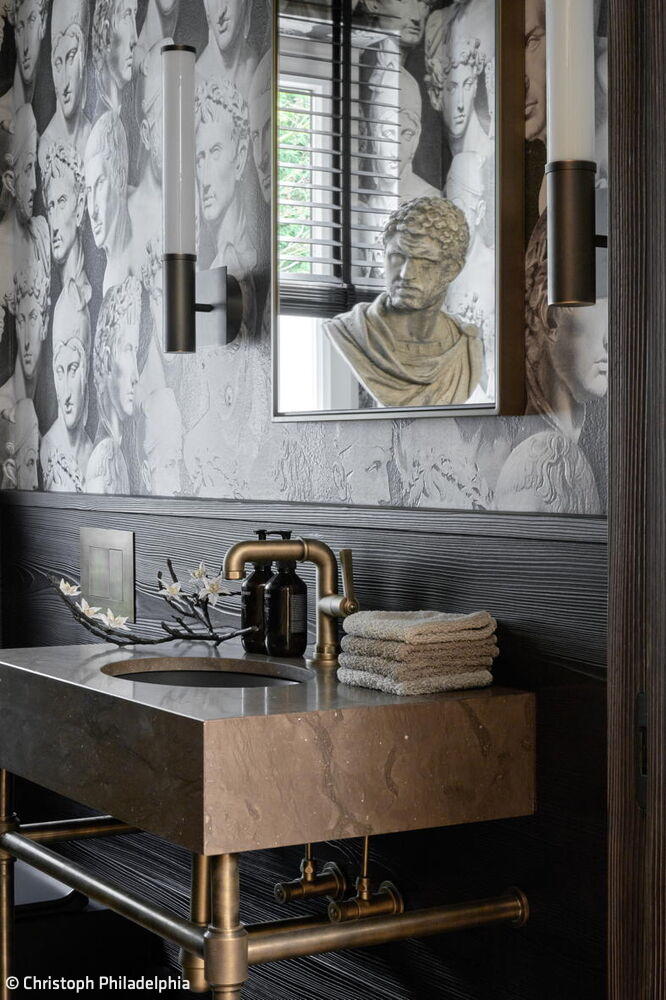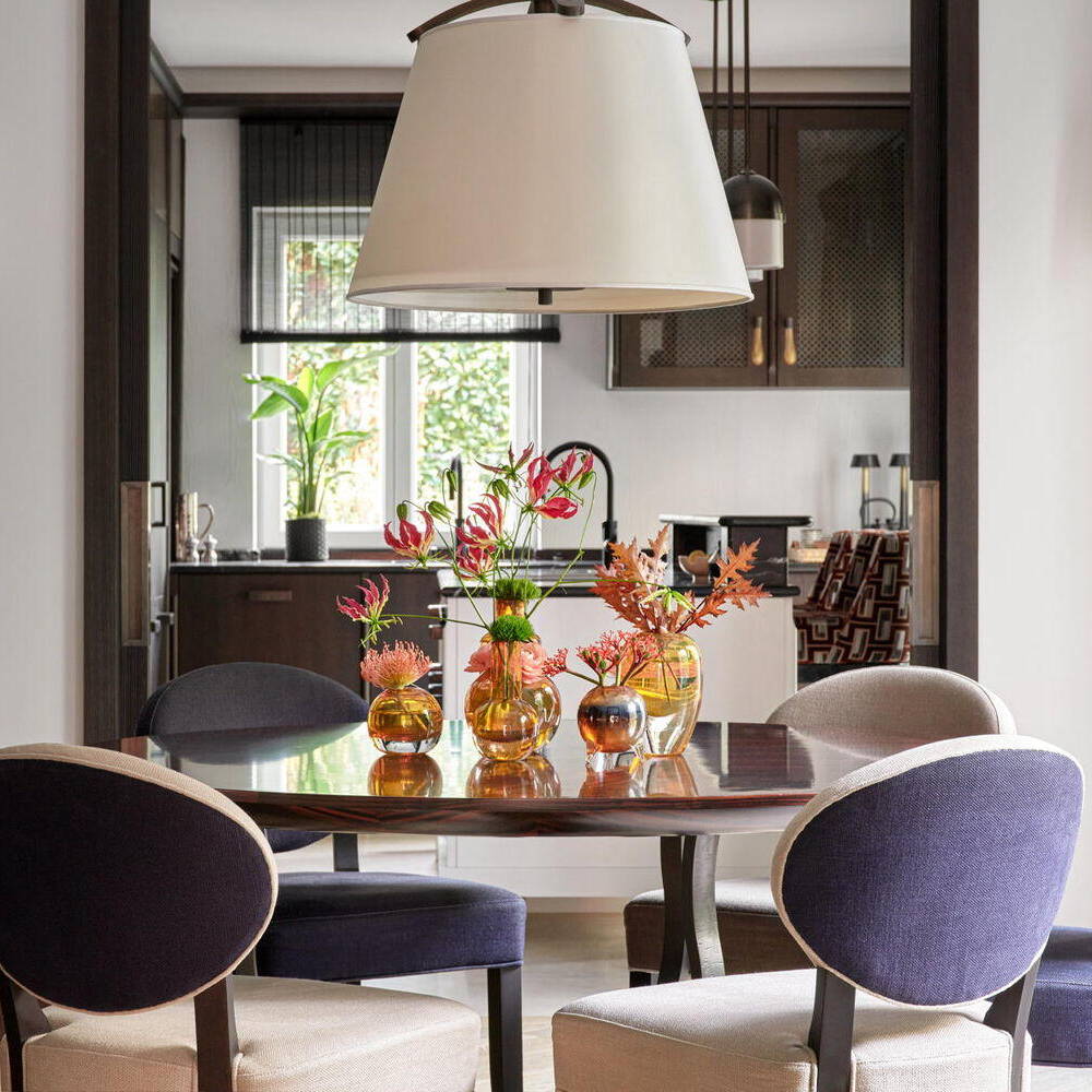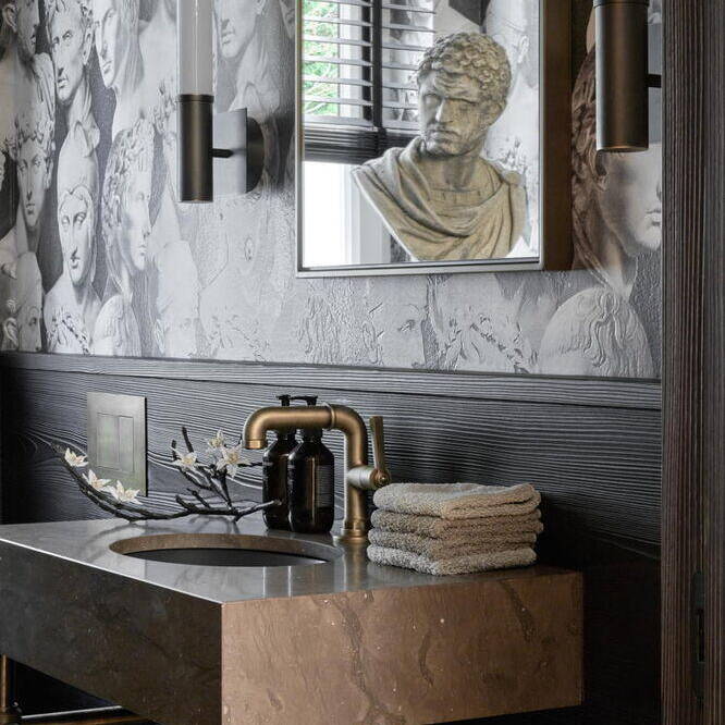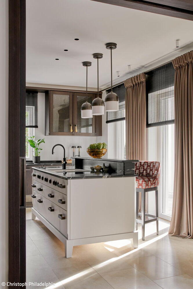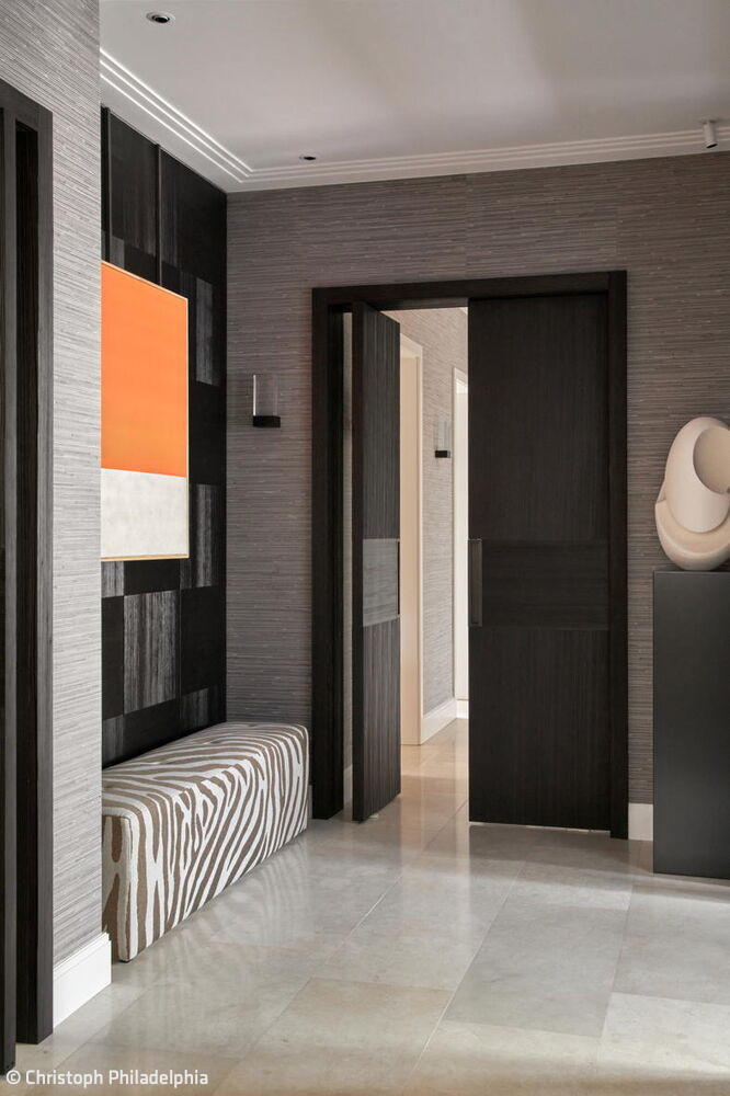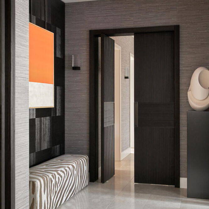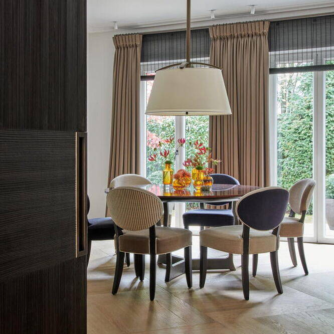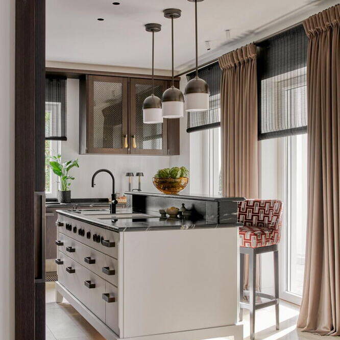 Die besondere Atmosphäre entsteht durch eine fein abgestimmte Tonalität natürlicher Farben, die warm und erdig wirken. Sand-, Taupe- und Beigetöne bilden die ruhige Basis. Akzentuierende Farben wie tiefes Nachtblau, Anthrazit und punktuell gesetztes Terrakotta erzeugen feine Kontraste. Warme, natürliche Materialien wie gebürstetes Tannenholz und ein aufwendig verlegtes Eichenparkett im dezenten Schachbrettmuster verleihen den Räumen eine ruhige, zugleich einladende Grundstimmung. Durch gezielte Hell-Dunkel-Kontraste entfalten sich Spannung und visuelle Tiefe. Für textile Wärme sorgen edle italienische Stoffe – fließend, weich und bewusst kontrastierend eingesetzt. Das Interieur wird durch Ledertapeten ergänzt, deren samtige Oberfläche eine unvergleichliche Haptik bietet. Handgefertigte Murano-Beschläge und Bronzegriffe verleihen dem Apartment subtile Eleganz – jeder Griff und jedes Finish wirken einzigartig und künstlerisch. Ein weiteres Merkmal des Apartments ist sein kuratierter Charakter: Antiquitäten und ausgewählte Fundstücke aus Paris fügen dem modernen Kontext eine erzählerische Tiefe und einen Hauch Bohème hinzu. So entstand kein reines Wohnobjekt, sondern ein lebendiger Lebensraum. „Für mich ist es die perfekte Verbindung aus urbanem Leben und privatem Rückzug“, beschreibt der Bauherr sein neues Domizil. In dem auch Gäste gerne willkommen sind: Der einladende Essbereich mit rundem Tisch und stimmungsvoller Statement-Leuchte sowie die elegante Küche mit einem großen Counter und Bartresen aus dunklem Naturstein laden zum Verweilen, Kochen und geselligen Beisammensein ein.