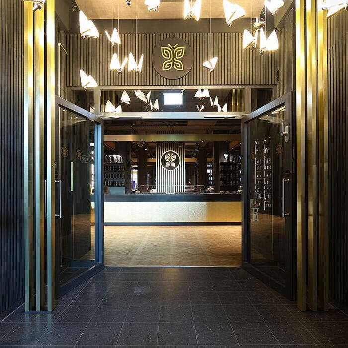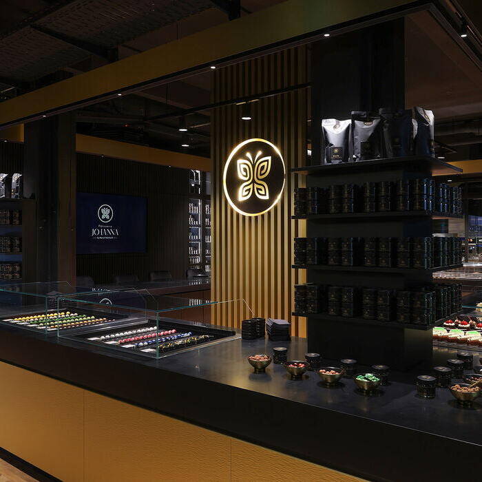 Für die Umsetzung im Erdgeschoss der Unesco Welterbestätte, das zuvor eine Markthalle mit verschiedenen Food-Stationen beherbergt hatte, haben die Inhaber Inka und Ralph Orth Visionen ihrer Tochter Johanna zusammengeführt. Die junge Konditormeisterin war bei der Flut im Ahrtal ums Leben gekommen. Das Interior der Pâtisserie sollte eine ganz besondere Ausstrahlung erhalten und die Produkte wie kostbare Juwelen in Vitrinen präsentiert werden, so die Leitidee. Beim Farbkonzept dominieren Schwarz und Gold, so auch beim Logo, einem stilisierten, goldfarbenem Schmetterling auf schwarzem Grund. Bereits am Eingang empfängt Besucher:innen eine Lichtinstallation in Form eines goldfarbenen Schmetterlingsschwarms. Dieses Motiv taucht innen in verschiedenen Materialen, als LED Wand, beleuchtetes Logo, auf Gläsern und verschiedensten Materialen auf. Die edlen Naschereien werden wie in einem Juweliergeschäft in Vitrinen, dezent aber, punktuell effektiv ausgeleuchtet, präsentiert. Um größtmögliche Transparenz zu erreichen, wurden Glasabtrennungen, Glas-Faltanlagen mit Vollholzrahmen hergestellt. Sitzbänke an den Wänden sind mit schwarzem Leder bezogen, pulverbeschichtete Regale aus Stahl im Barbereich in Gold ausgeführt. Mattschwarze Arbeitsflächen aus HiMacs, ein Vinylboden in Versailles-Holzoptik, Stühle mitgold/bronze-farbenem Sitzpolstersowie Tische mit schwarzer Oberfläche schaffen einen edlen Industrial Look.