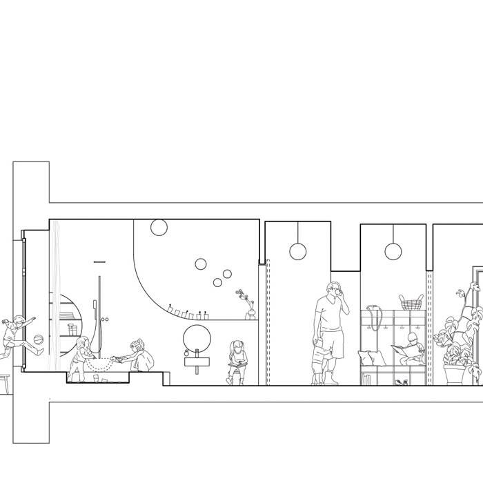 Im Ortsteil Gesundbrunnen ergab sich durch den glücklichen Umstand, dass die Gewerbeeinheit in Nachbarschaft einer Montessori-Kita frei wurde, die Gelegenheit, den Bestand um eine inklusive Nestgruppe zu erweitern. Das Gebäude liegt in einem verkehrsberuhigten Abschnitt der Eulerstraße, sodass die Kinder im Sommer auch im Freien spielen können. Die Gegend, in der die neue Kita liegt, gilt als Problemquartier, daher sind Bildungseinrichtungen besonders wichtig, damit die Kinder von früh auf lernen, sich eigenständig zu entwickeln. Die Architektinnen Katja Thorwarth und Jeanne-Francoise Fischer entwickelten ein Konzept nach den Vorgaben der Montessori-Pädagogik für eine Gruppe von sechs  Kleinkindern im Alter von 1 bis 3 Jahren. Sie schufen nicht nur die Räumlichkeiten, sondern entwarfen auch Teile des Mobiliars und Inventars. Die freie Fläche im Erdgeschoss ist nicht besonders groß. Gerade mal 65 m² standen den Planerinnen zur Verfügung, um eine Spiellandschaft mit allen für die Kleinen notwendigen Aufenthaltszonen – Spielflächen, Ruheraum, Garderobe, Sanitärbereich und eine kleine Teeküche – zu realisieren und farblich zu gestalten. Bedingt durch die geringe Größe mussten die Räume über eine gewisse Multifunktionalität verfügen. Lediglich durch zwei vergleichsweise kleine Eingriffe, einen Rundlauf und eine Badelandschaft, so erzählt Katja Thorwarth, war es möglich, Voraussetzungen für eine Wandelbarkeit einzelner Bereiche zu schaffen. Bei offener Spielfläche können die Kinder ohne Begrenzung im Kreis laufen. Durch eine einfache Schiebetür werden Teilbereiche zu Garderobe und abgetrenntem Ruheraum. Einer der wichtigsten Grundsätze der Montessori-Pädagogik ist, dass die Kinder sich durch Neugier ihre Welt selbst erobern. Diesem Grundsatz entsprechend entwickelten die Architektinnen die Badelandschaft. Hier sollen die Kleinkinder die Chance haben, das Element Wasser und den Umgang damit spielerisch zu erfahren. Die Wasserlandschaft – nicht größer als ein normales Badezimmer – ist farblich mit einem roséfarbenen Feinsteinzeug gestaltet. Toiletten und Waschbecken für kleine Menschen sind ebenfalls vorhanden. Durch das bodentiefe Fenster wird die Badelandschaft zum begrünten Innenhof geöffnet, so dass der Raum größer und heller wirkt. Es gibt eine runde Wanne auf einem 25 Zentimeter hohen beheizten Podest, eine Regendusche sowie ein Kaskadenbecken aus Naturstein zum Planschen und Experimentieren: Was für ein Element ist das? Warum fliesst es davon, und warum kann man es nicht festhalten? Was passiert, wenn man es in ein Glas füllt und und dann in ein zweites usw. – alles lebenswichtige Lernerfahrungen. In dieser sympathischen kleinen Welt wurde durch wenige Eingriffe ein erlebbarer Mehrwert geschaffen.