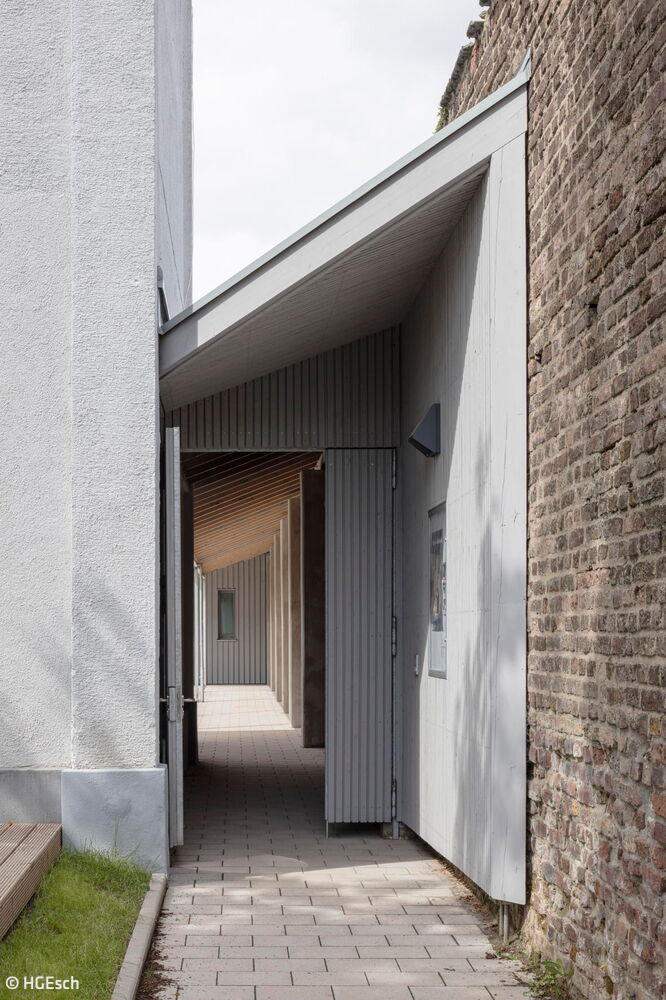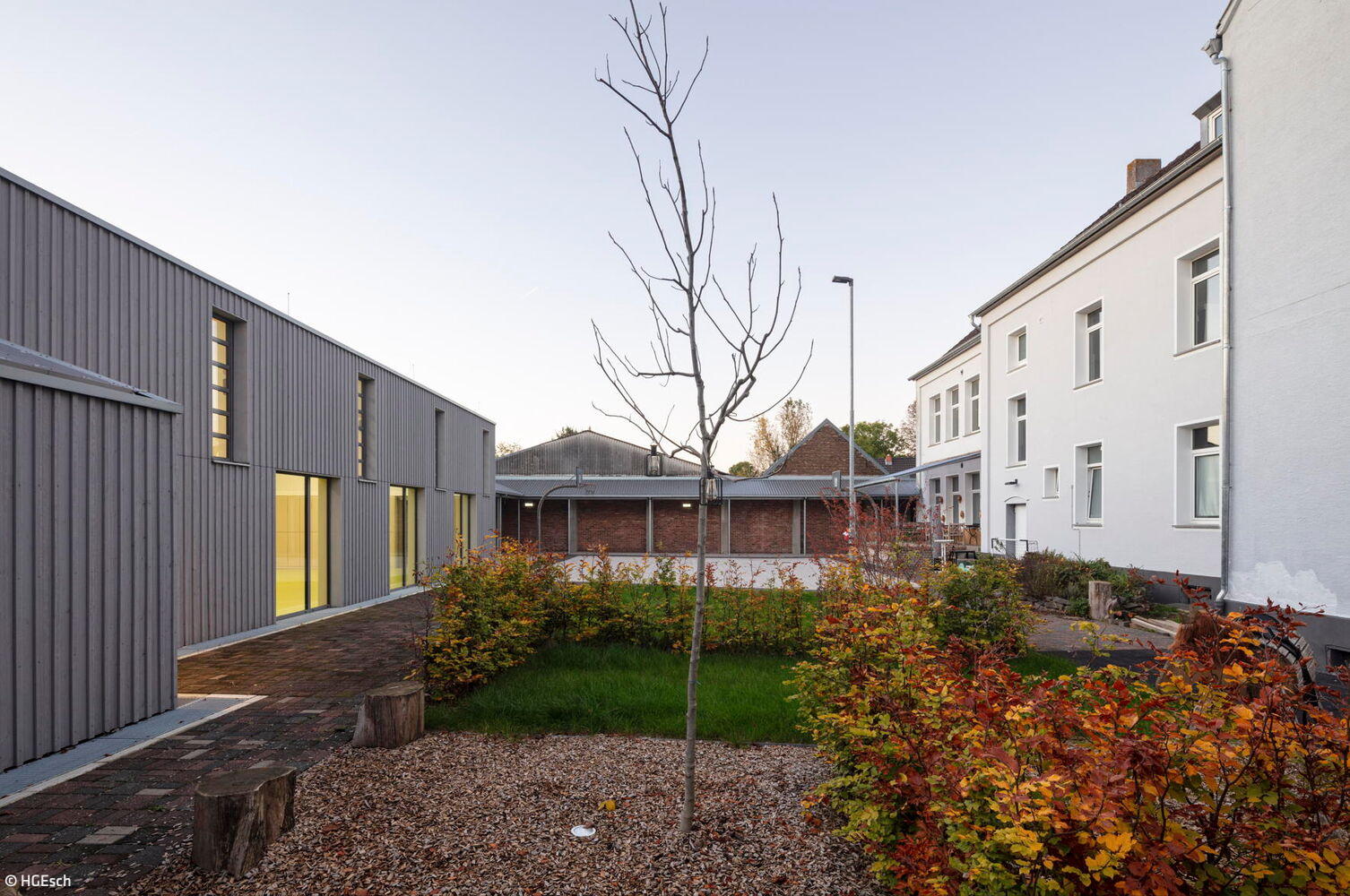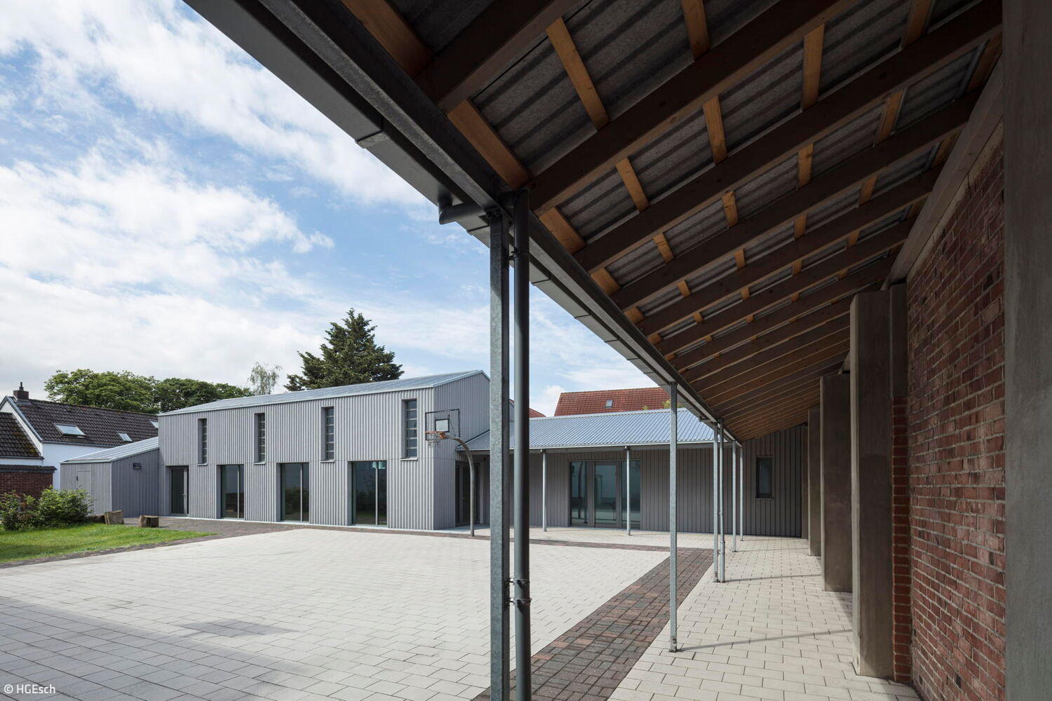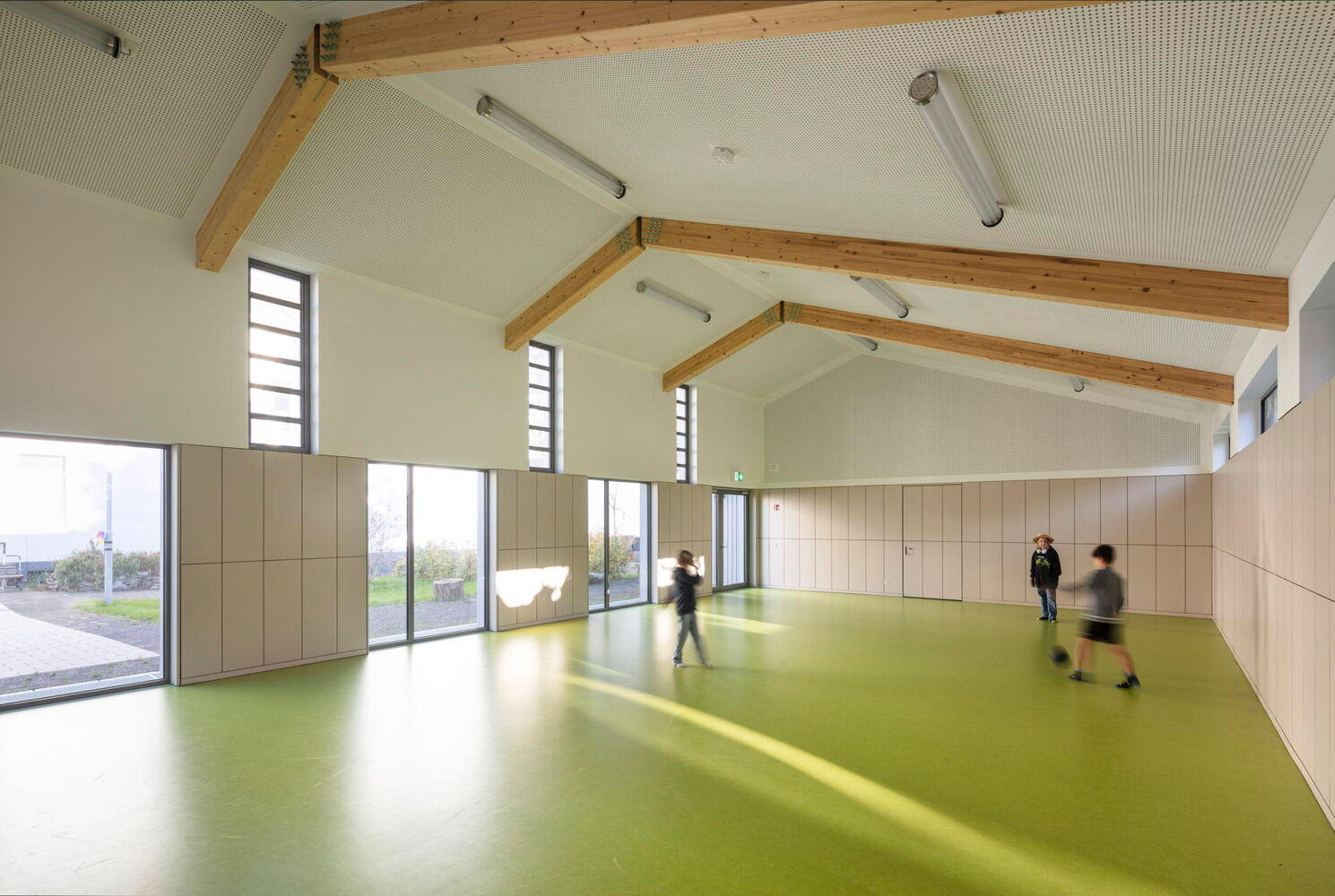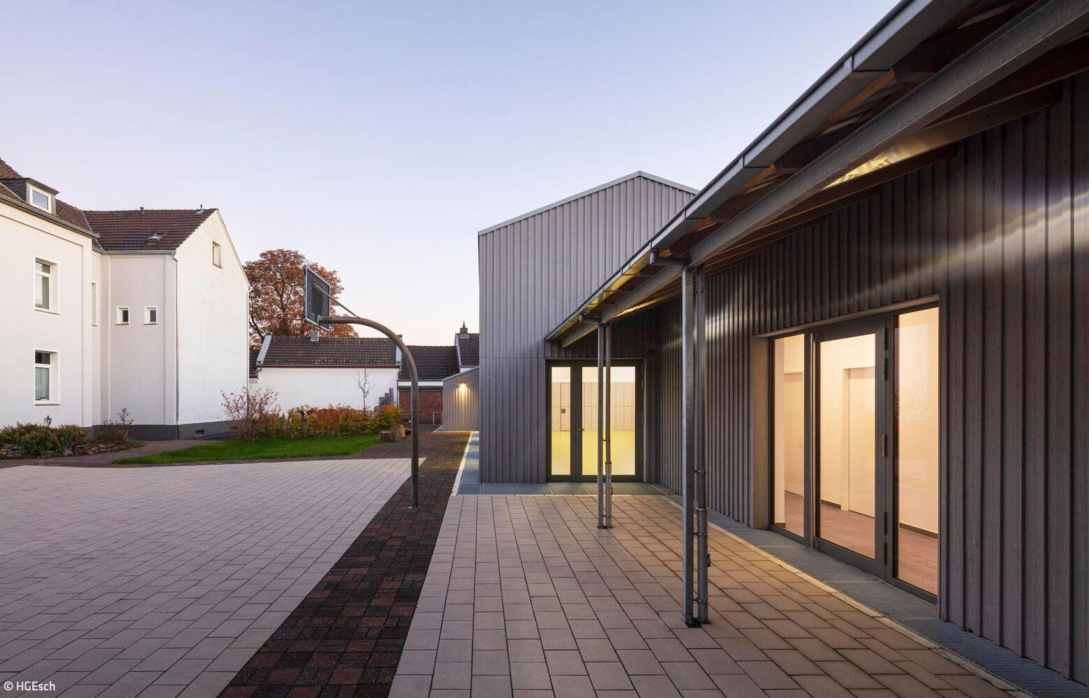 Über 250 Kinder und Jugendliche nutzen pro Woche die sportpädagogischen Angebote des Jugendzentrums „Alte Schule“. Als die Bestandshalle von einem Tag auf den anderen gesperrt werden musste, war das ein herber Verlust. Zumal das Stadtviertel durch Zuzug und Neubaugebiete wächst, während die soziale Infrastruktur nur schwer Schritt hält. Mit Mitteln der Städtebauförderung des Landes NRW im Rahmen des Förderaufrufes „Investitionspaket Soziale Integration im Quartier“ wurde ein barrierefreier Ersatzneubau realisiert. Dieser bietet Platz für bis zu 270 Personen und ist mit einem flächenelastischen Schwingboden ausgestattet, der vielfältige Aktivitäten wie Indoor-Spiel, Kampfsport, Gymnastik und Tanz ermöglicht. Der Neubau erhält die ursprüngliche hofbildende Anordnung der Gebäude und schreibt sie weiter fort. Mit seinen Eingängen und den großzügigen Glasflächen, die viel Tageslicht in den Innenraum holen, richtet sich das Gebäude auf den Hof aus – was unter anderem auch die Lärmemissionen minimiert. Zusätzlich zum Zugang über das alte Schulgebäude wurde ein neuer Außenzugang geschaffen: Der bereits vorher an der westlichen Grundstücksmauer vorhandene Arkadengang erhielt eine Verlängerung bis in den nördlichen Vorderbereich des Grundstückes. Dieses neue Entrée ermöglicht einen wettergeschützten Zugang zum neuen Bewegungspavillon auch außerhalb der Öffnungszeiten des Hauptgebäudes. Der Neubau teilt sich dabei in drei miteinander verbundene Volumen auf, die mit variierenden Höhen und Versätzen den alten Schulhof gliedern. Sie nehmen die kleinteilige Körnung der dörflichen Nachbarbebauung auf. Zugleich interpretieren sie – modern-reduziert – die ruhigen, langgestreckten Satteldächer der umliegenden Gehöfte rund um die Dorfkirche. Wegen der nur schwer zugänglichen Baustelle, aber auch aus Gründen der Nachhaltigkeit wurde der Neubau als Holzbau ausgeführt: Drei asymmetrische Zweigelenkbinder aus sichtbar belassenem Brettschichtholz bilden dabei das Haupttragwerk. Die Stahlprofil-Stützen, auf denen das Tragwerk lastet, sind biegefest mit diesem verbunden und im Wandaufbau verborgen. Auf diese Weise wird eine eben durchlaufende Prallwand ohne Versprünge möglich. Die Aussteifung der Konstruktion erfolgt über vorgefertigte Holztafelelemente, die bereits werkseitig gedämmt und beidseitig beplankt wurden. Die Fassaden erhielten eine hinterlüftete vertikale Lärchenholzschalung mit einer Vorvergrauung als Finish. Zusammen mit der grauen Trapezblech-Eindeckung der Dachflächen entsteht so ein einheitliches Bild, das sich dezent vom Bestand abhebt.