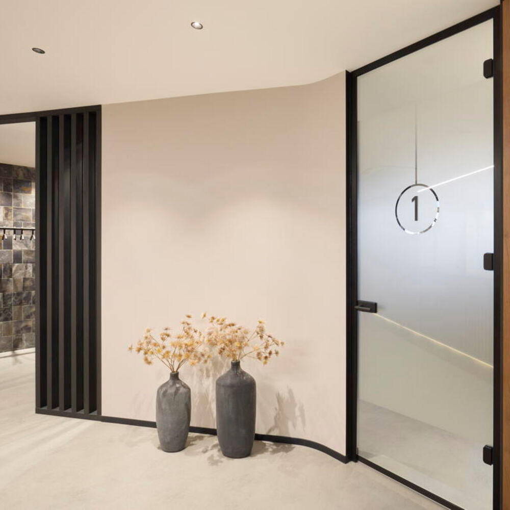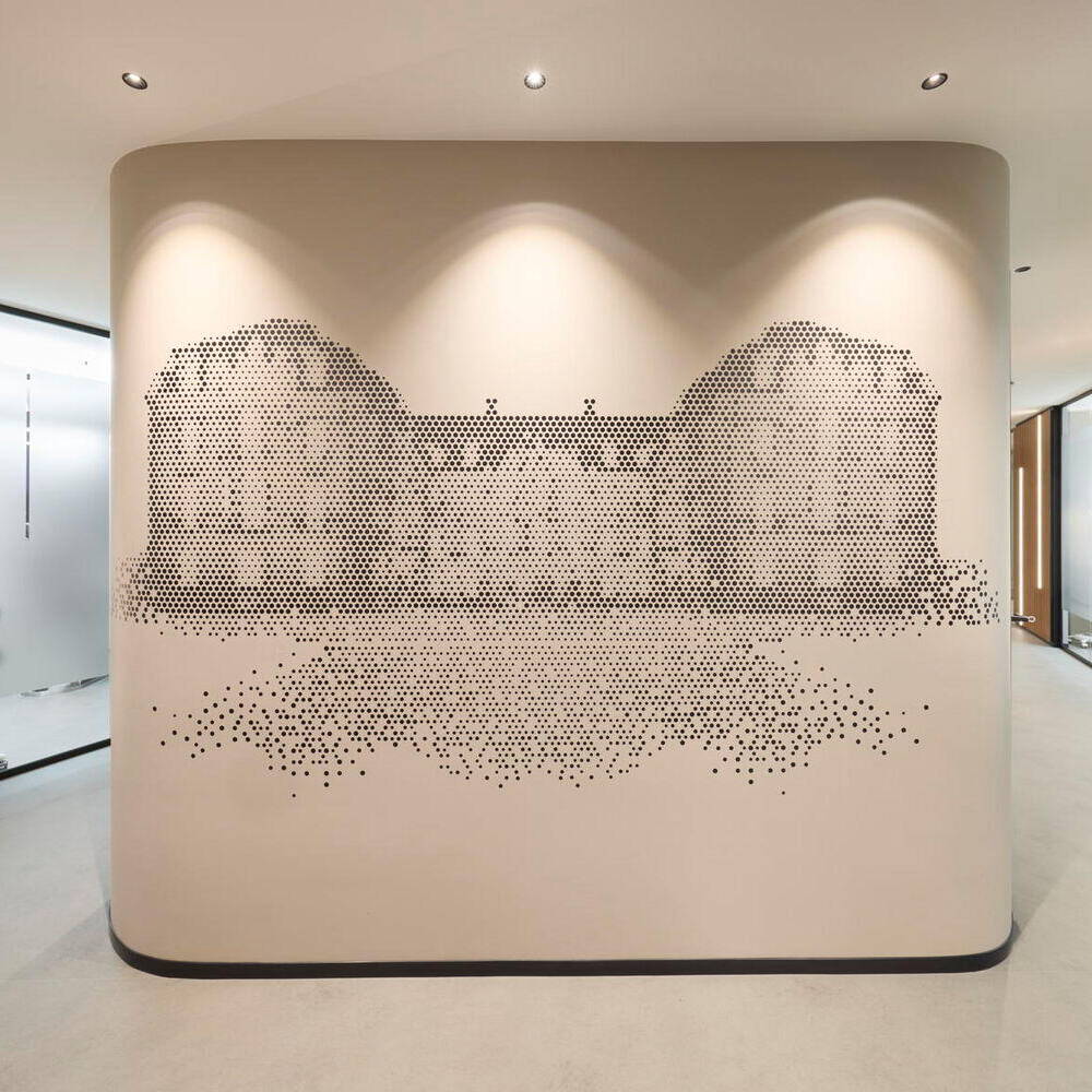Im Inneren empfängt die Patient:innen eine Referenz an das Brühler Schloss: Eine Wand des zentralen Kubus gegenüber dem Praxiseingang wurde mit 7.328 Folienpunkten gestaltet, die das Schloss stilisiert abbilden und der Praxis eine unverwechselbare Identität geben. Bei den Materialien entschieden sich die Innenarchitekten für einen neutralen Zementoptik-Boden kombiniert mit warmen Eichenholzflächen mit schwarzen Nuten an der Empfangstheke und Wandscheiben, die für ein einladendes Ambiente sorgen. Schwarze, lamellierte Flächen beispielsweise rahmen die Empfangstheke ein, während eine schwarze Filzdecke mit akustischer Wirkung für angenehme Raumakustik sorgt. Akustikelemente an der Kopfwand des Wartebereichs sowie gezielt platzierte Begrünung verstärken das behagliche Raumgefühl. Satinierte Glasflächen trennen die Behandlungsräume visuell ab, die dabei Transparenz und Lichtdurchlässigkeit vereinen.
