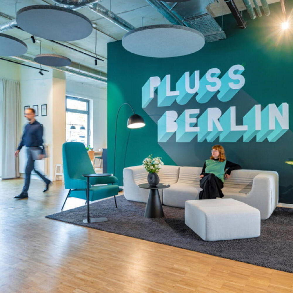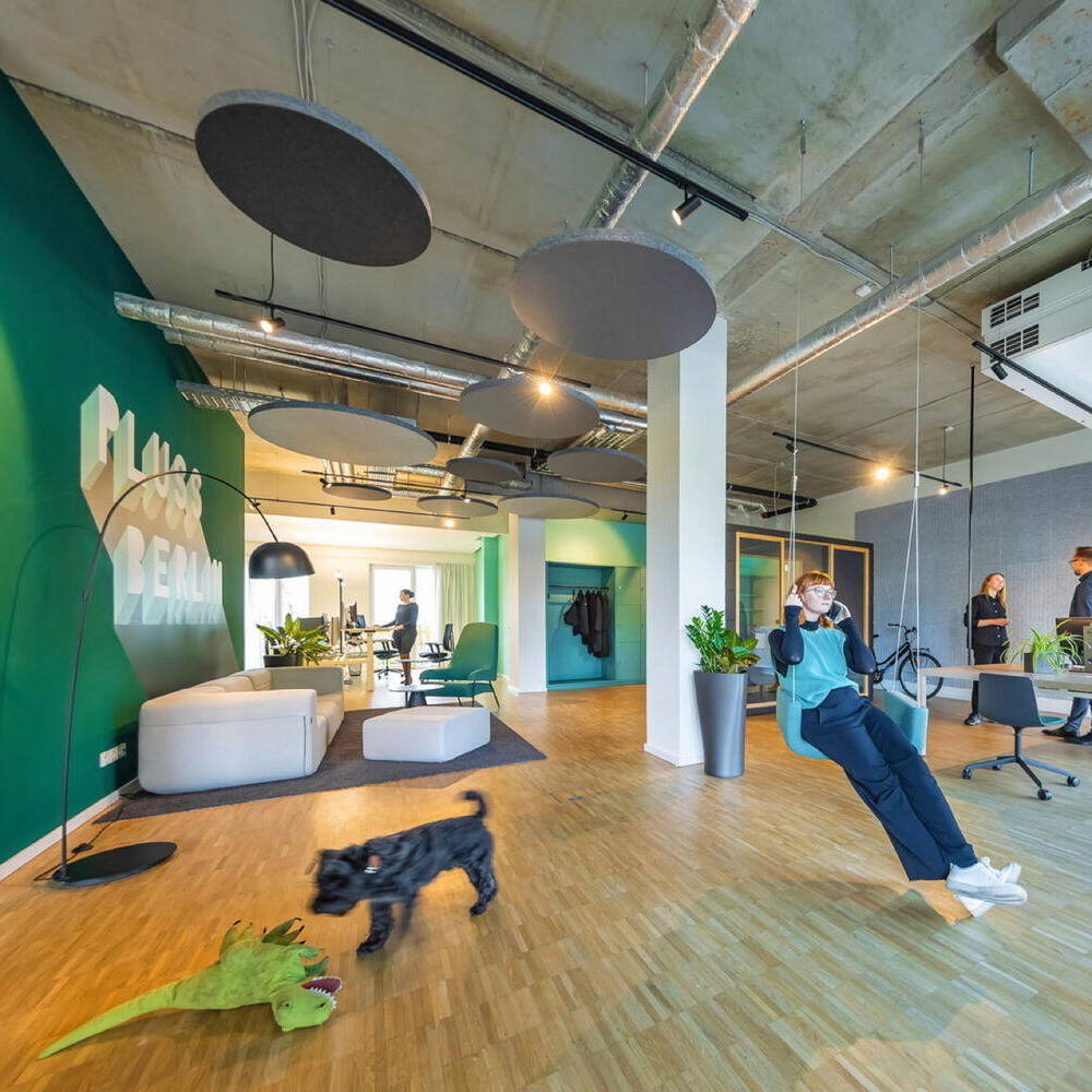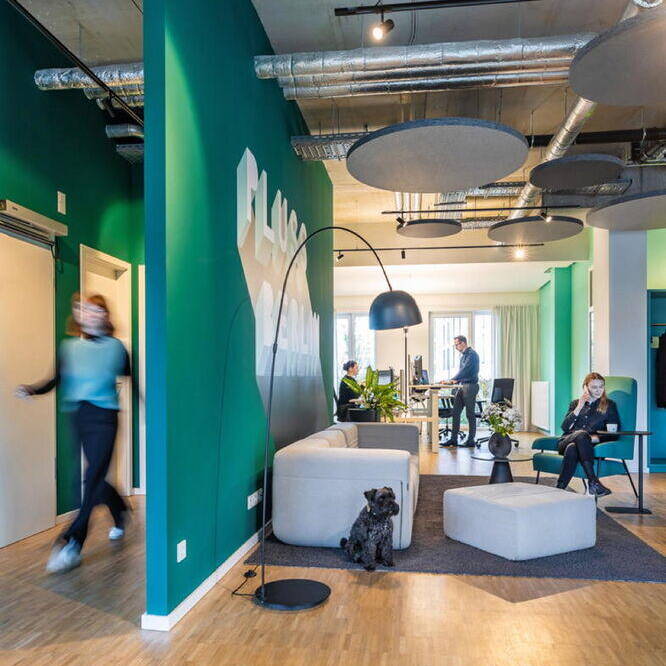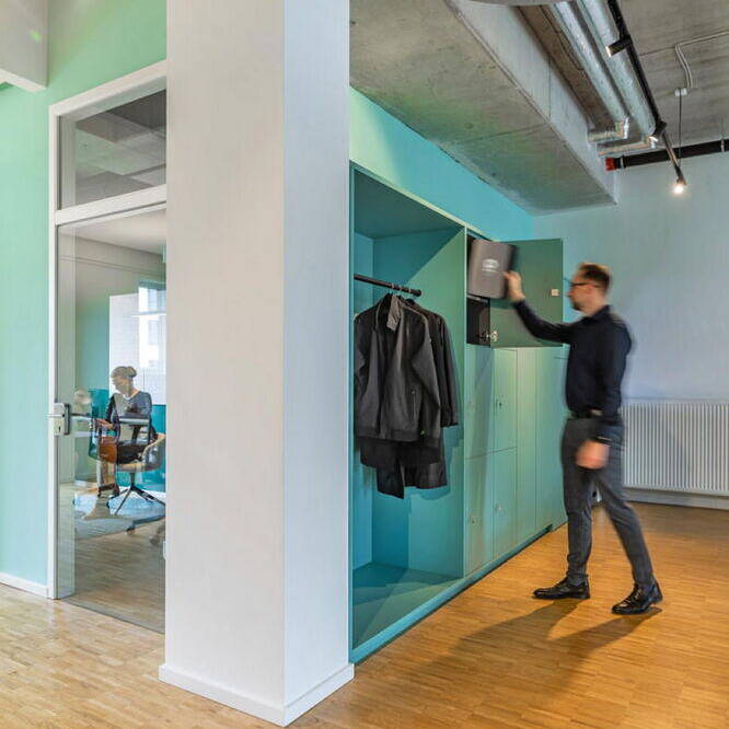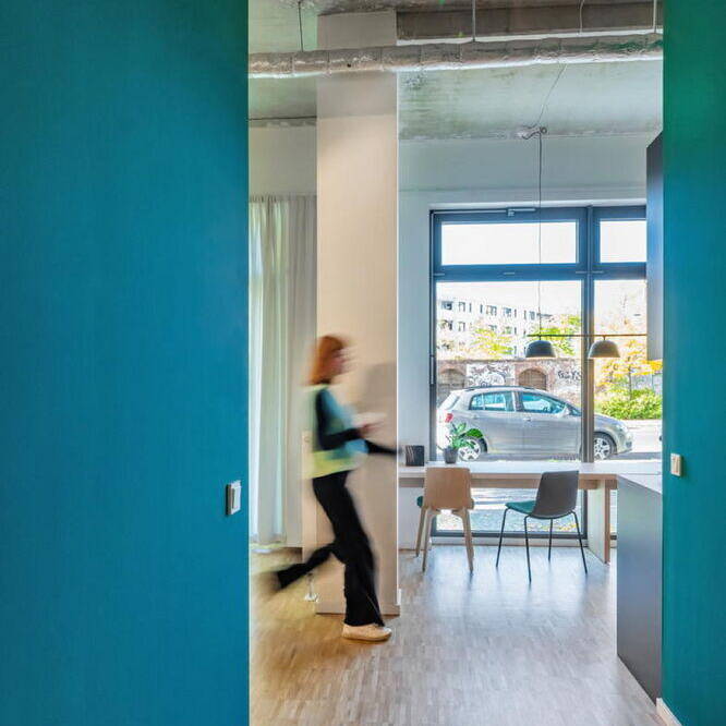 Zunächst begab man sich gemeinsam auf die Suche nach einer geeigneten Location am Hauptstandort Berlin und wurde in Friedrichshain fündig. Bei den Räumlichkeiten handelt es sich um ein ehemaliges Ladengeschäft in Friedrichshain. Dort mussten zunächst Renovierungsarbeiten vorgenommen werden, wie zum Beispiel die Reparatur des stellenweise beschädigten Bodens. Nach dieser ersten Phase galt es die Fläche von 155 m² so aufzuteilen, dass sie dem Anforderungskatalog des Auftraggebers entsprach. Der Grundgedanke war der einer offenen Bürofläche mit verschiedenen Zonen für unterschiedliche Tätigkeiten: gemeinsame Meetings in der Gruppe, ein konzentriertes Kennenlern- bzw. Beratungsgespräch mit einem Kunden, Arbeitsflächen in der Gruppe oder allein, Telefonkabinen und zwei weitere Gruppenräume mit einem flexiblen Monitor sowie eine Küche mit Aufenthaltsraum. Der Wiedererkennungseffekt definiert sich zunächst über eine Signalfarbe. Die Geschäftsleitung wünschte sich einen intensiven, sehr dominanten Türkis-Farbton. Ein Schriftzug in großen Lettern mit Firmennamen und Ort auf einer Trennwand etabliert den Ort. Davor befindet sich eine gemütliche Loungeecke mit einladenden Polstermöbeln und Pflanzen, einer Bogenleuchte und einem farblich abgestimmten Teppich. Kein steifer Empfangstresen stört die Atmosphäre. Eine Schaukel und ein Bücherregal runden das Ganze ab. Dank der Schaufensterfläche des einstigen Ladens ist der Großraum lichterfüllt. Der industrielle Charakter der Decke wird durch runde abgehängte Blenden etwas kaschiert, ist aber ansonsten bewußt sichtbar belassen. Im Bereich direkt an der Fensterfront gibt es zwei repräsentative, von aussen einsehbare mobile Arbeitsplätze. Im hinteren Bereich liegen zwei Besprechungsräume, die aussen hellgrün-türkis und innen mittelgrün gestrichen sind. Die gesamte Farbpalette bleibt in diesem türkis-grünen Bereich bis zu einem Dunkelgrün, das in der Küche und in einer Sitzecke vorherrscht. Es entstand ein einladendes, auf andere Filialen übertragbares Ambiente, das Signalwirkung und einen Wiedererkennungseffekt für die Kund:innen bietet.