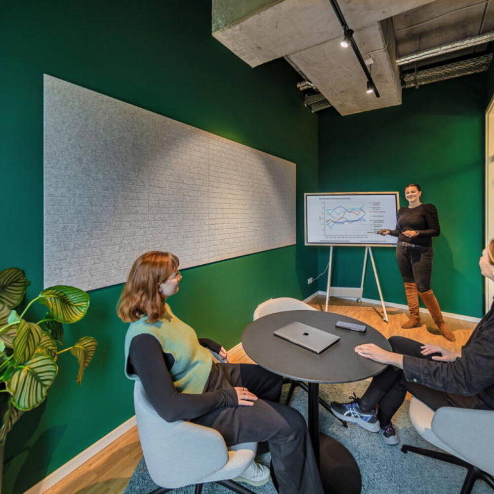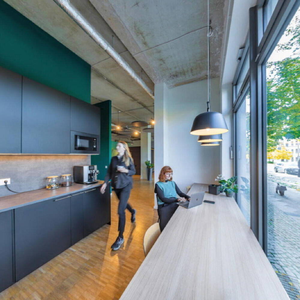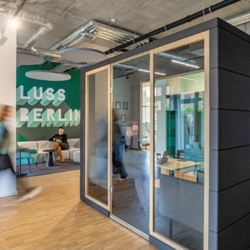 Zunächst begab man sich gemeinsam auf die Suche nach einer geeigneten Location am Hauptstandort Berlin und wurde in Friedrichshain fündig. Bei den Räumlichkeiten handelt es sich um ein ehemaliges Ladengeschäft in Friedrichshain. Dort mussten zunächst Renovierungsarbeiten vorgenommen werden, wie zum Beispiel die Reparatur des stellenweise beschädigten Bodens. Nach dieser ersten Phase galt es die Fläche von 155 m² so aufzuteilen, dass sie dem Anforderungskatalog des Auftraggebers entsprach. Der Grundgedanke war der einer offenen Bürofläche mit verschiedenen Zonen für unterschiedliche Tätigkeiten: gemeinsame Meetings in der Gruppe, ein konzentriertes Kennenlern- bzw. Beratungsgespräch mit einem Kunden, Arbeitsflächen in der Gruppe oder allein, Telefonkabinen und zwei weitere Gruppenräume mit einem flexiblen Monitor sowie eine Küche mit Aufenthaltsraum. Der Wiedererkennungseffekt definiert sich zunächst über eine Signalfarbe. Die Geschäftsleitung wünschte sich einen intensiven, sehr dominanten Türkis-Farbton. Ein Schriftzug in großen Lettern mit Firmennamen und Ort auf einer Trennwand etabliert den Ort. Davor befindet sich eine gemütliche Loungeecke mit einladenden Polstermöbeln und Pflanzen, einer Bogenleuchte und einem farblich abgestimmten Teppich. Kein steifer Empfangstresen stört die Atmosphäre. Eine Schaukel und ein Bücherregal runden das Ganze ab. Dank der Schaufensterfläche des einstigen Ladens ist der Großraum lichterfüllt. Der industrielle Charakter der Decke wird durch runde abgehängte Blenden etwas kaschiert, ist aber ansonsten bewußt sichtbar belassen. Im Bereich direkt an der Fensterfront gibt es zwei repräsentative, von aussen einsehbare mobile Arbeitsplätze. Im hinteren Bereich liegen zwei Besprechungsräume, die aussen hellgrün-türkis und innen mittelgrün gestrichen sind. Die gesamte Farbpalette bleibt in diesem türkis-grünen Bereich bis zu einem Dunkelgrün, das in der Küche und in einer Sitzecke vorherrscht. Es entstand ein einladendes, auf andere Filialen übertragbares Ambiente, das Signalwirkung und einen Wiedererkennungseffekt für die Kund:innen bietet.