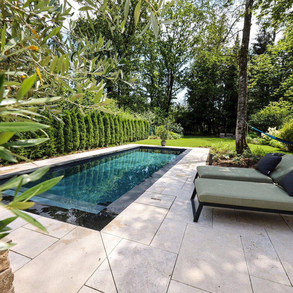 Da das Grundstück keine Begrenzungen durch Gartenzäune, Hecken oder gar Mauern aufwies, war ein ungehindertes Gestalten gewährleistet. Dennoch stellte die Aufgabe auf der nicht allzu großen Fläche von 430 m² eine Herausforderung dar. Gleich zu Anfang galt es das Hindernis zu überwinden, dass der vorhandene Durchgang zum Garten nur 1,2 Meter breit und nicht erweiterbar war. Die Gerätschaften und Pflanzen mussten per Kran über das Dach gehoben werden. Den Auftakt der Gartenarbeiten bildete der Pool, da er das Zentrum des neuen Gartens ist. Doch auch der Zugang zum Pool musste erst geschaffen werden, indem eine vorhandene niedrige Natursteinmauer an einer Stelle durchbrochen wurde. Bis auf die Lücke, die nun den Zugang zum Pool darstellt, blieb die Mauer originalgetreu erhalten. Die Zone rund um das Waaserbecken wurde naturnah gestaltet. Der Bitte des Bauherrn nachkommend, sollte dieser Bereich dem Stil des Wohnhauses angepasst werde, was großes Knowhow erforderte. Da explizit ein „natürlicher“ Pool gefordert war, der ohne chemische Reinigung auskommt, wurde ein so genanntes „Living Pool System“ eingebaut – eine biologische Alternative zur herkömmlichen Reinigung von Schwimmbädern und Pools. Das System funktioniert ohne Chlor und nutzt natürliche Filtermechanismen, um das Wasser sauber zu halten. Ein Glücksfall war, dass der Garten im hinteren Teil in einen bestehenden Wald übergeht. Dieser Umstand ließ sich gut in ein naturnahes Konzept einbeziehen, indem man eine Gestaltung wählte, die wie ein „wilder“ Garten wirkt – eine Grasfläche mit ein paar Büschen und Blumen, als wäre würde der Natur freier Lauf gelassen.