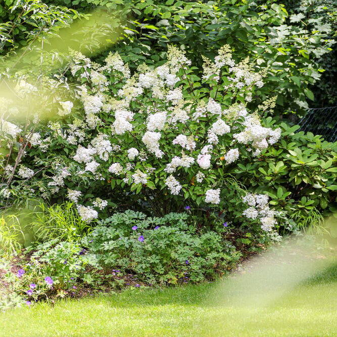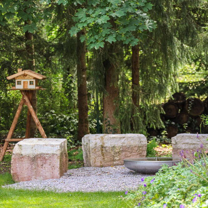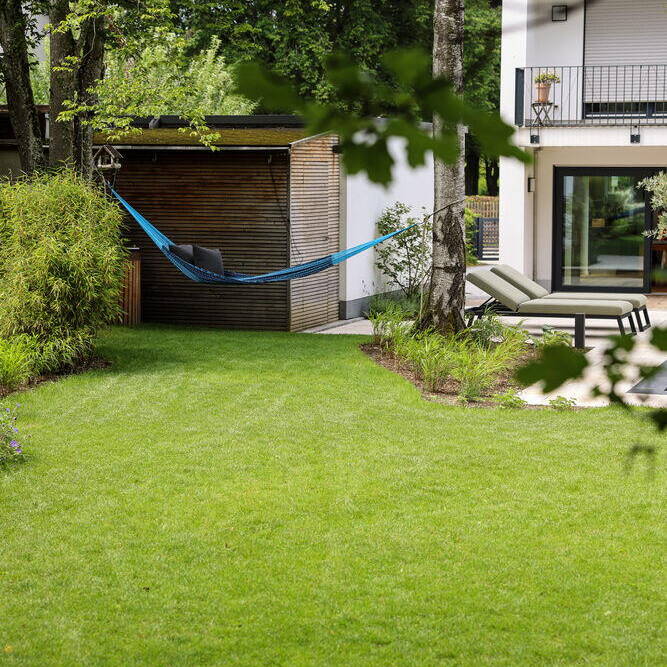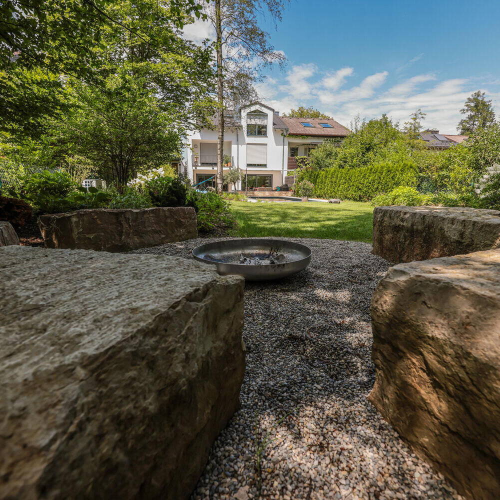 Als Kontrast dazu ist der Bereich in Hausnähe deutlich gestaltet und mit Blumenbeeten oder Gräsern bepflanzt. Er geht, je weiter man sich vom Haus entfernt, fliessend in den natürlichen Garten über. Abschliessend wurde die relativ kleine Terrasse aus Holz abgebrochen und durch eine neue, geräumigere aus Naturstein ersetzt, mit veredeltem Holz belegt und mit Pflanzen bestückt. So entstand ein atmosphärisch gemütlicher Gartenbereich in Hausnähe und im Bereich der Terrasse.