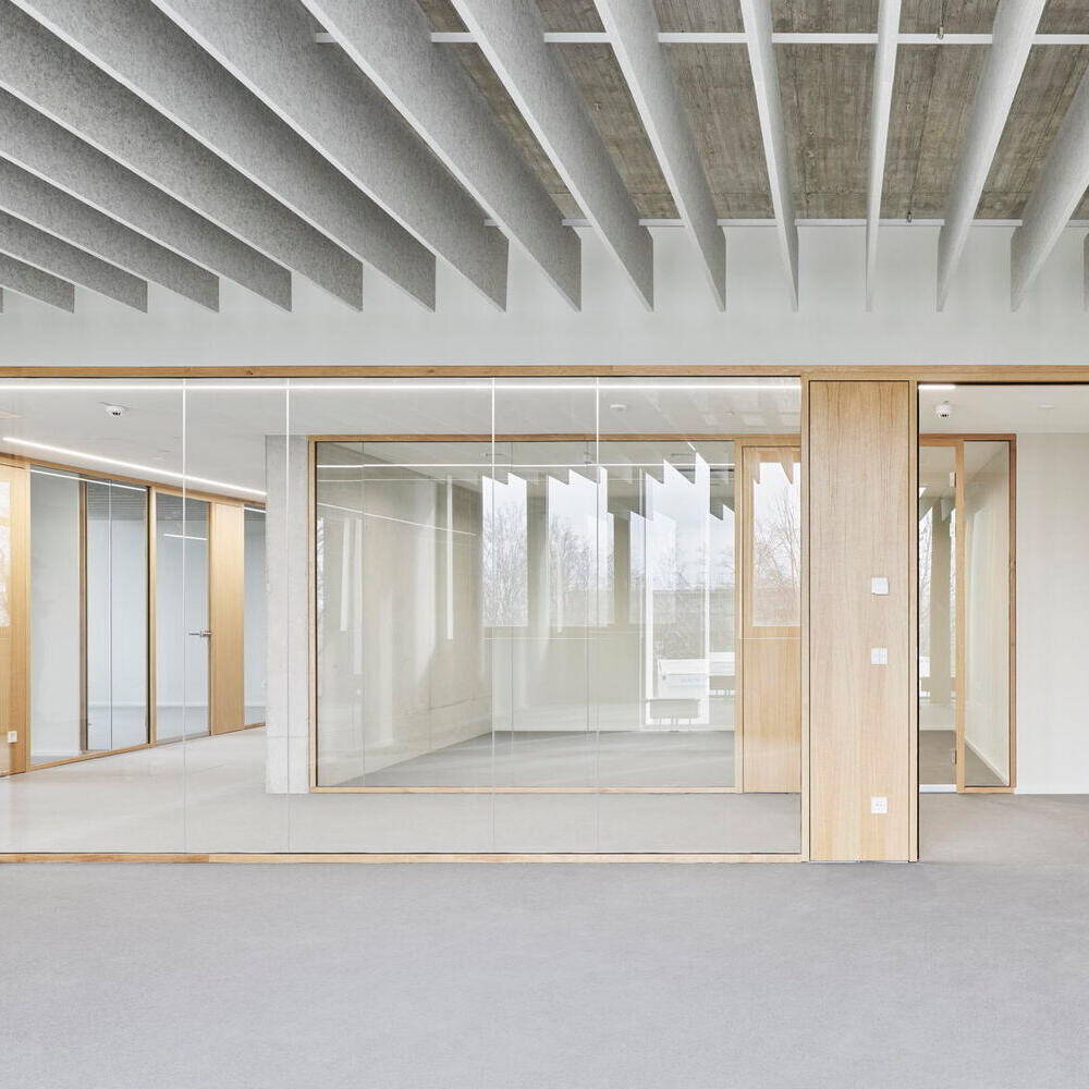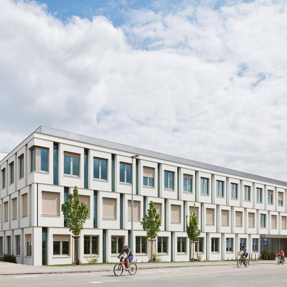 Das Tätigkeitsfeld des Unternehmens übertrugen die Architekt:innen symbolisch auf die Gestaltung der Fassade: Ähnlich der DNA-Doppelhelix umschließen die modularen Fassadenelemente die Grundkonstruktion des flexiblen und kernaktivierten Skelettbaus aus Stahlbeton. Dabei spiegeln die Modulelemente aus Holz das Thema der Sequenzierung. Mit seinem einprägsamen Rhythmus markiert der Gebäudekomplex den baulichen Auftakt des neuen Forschungsparks Cyber Valley in Tübingen.